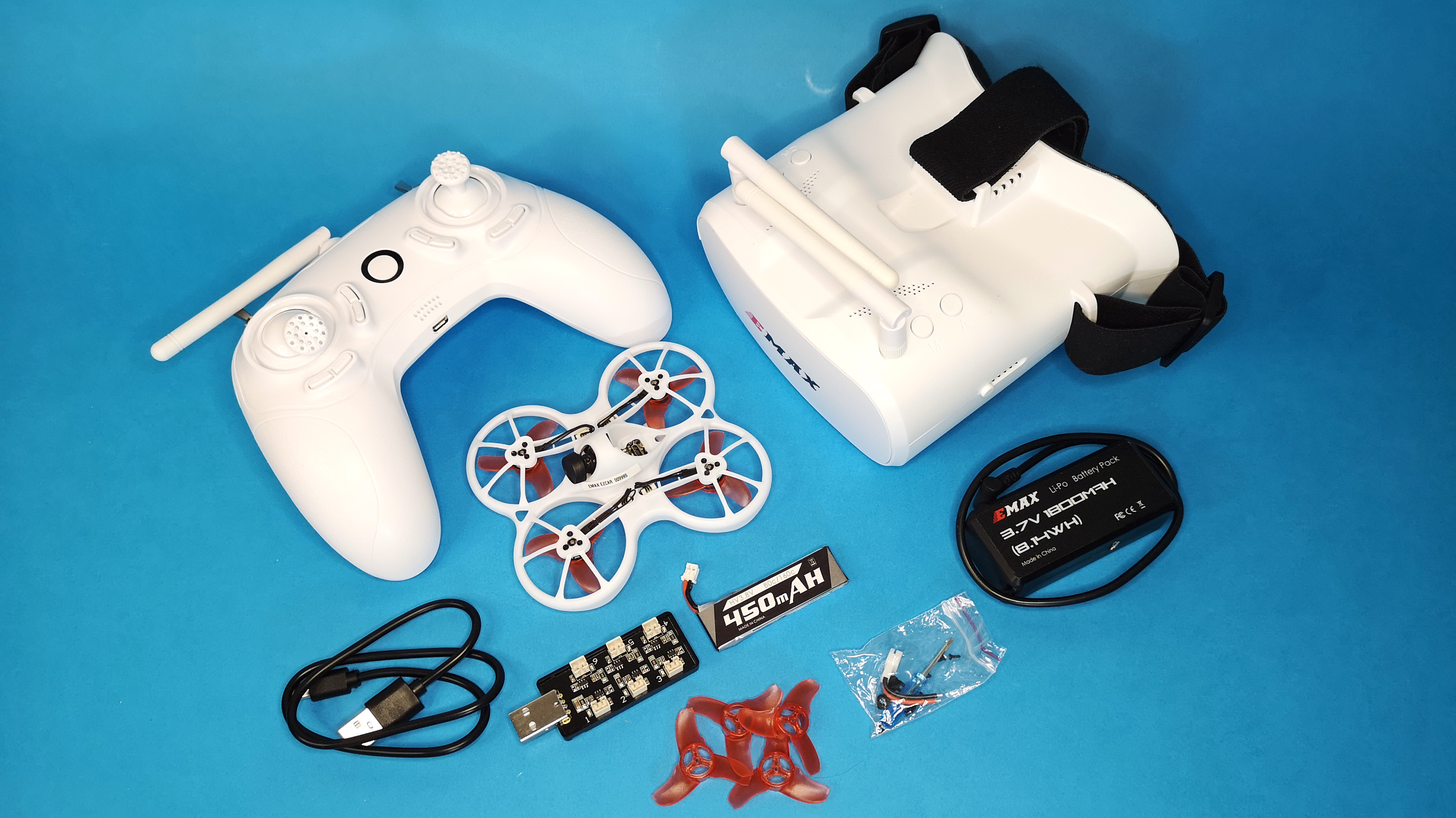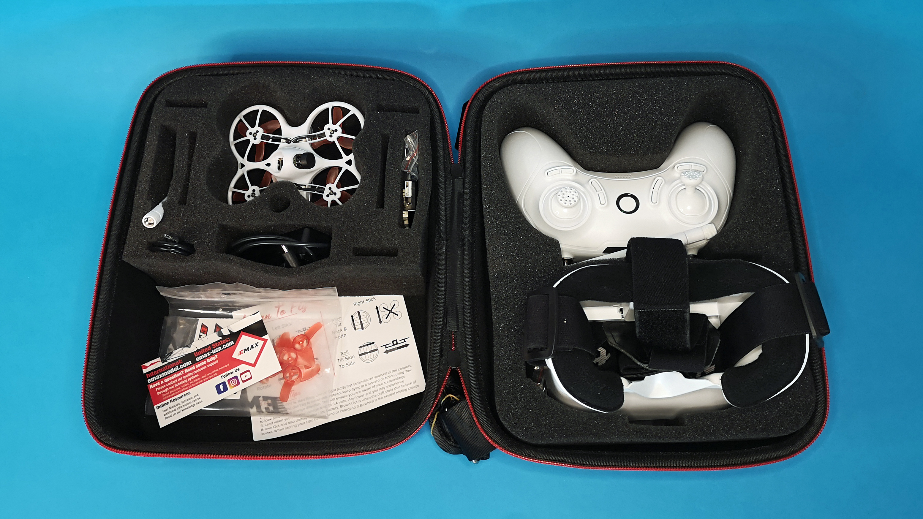 Das RTF-Set (ready to fly) von Emax kommt in einer schicken Tragetasche im Carbon-Look zum Kunden. In dem praktischen Koffer steckt beinahe alles, was man für den Start ins Hobby braucht. Enthalten sind die Mini-Drohne mit Kamera, ein kompakter Handsender im Design eines Game-Controllers, ein Flug-Akku, ein Mehrfachladegerät, Ersatzpropeller, Anleitung, Micro-USB-Kabel und Videobrille inklusive Akku. Letztlich fehlt nur ein USB-Netzteil, um das kleine Mehrfachladegerät, Handsender und den Brillen-Akku mit Strom zu versorgen.