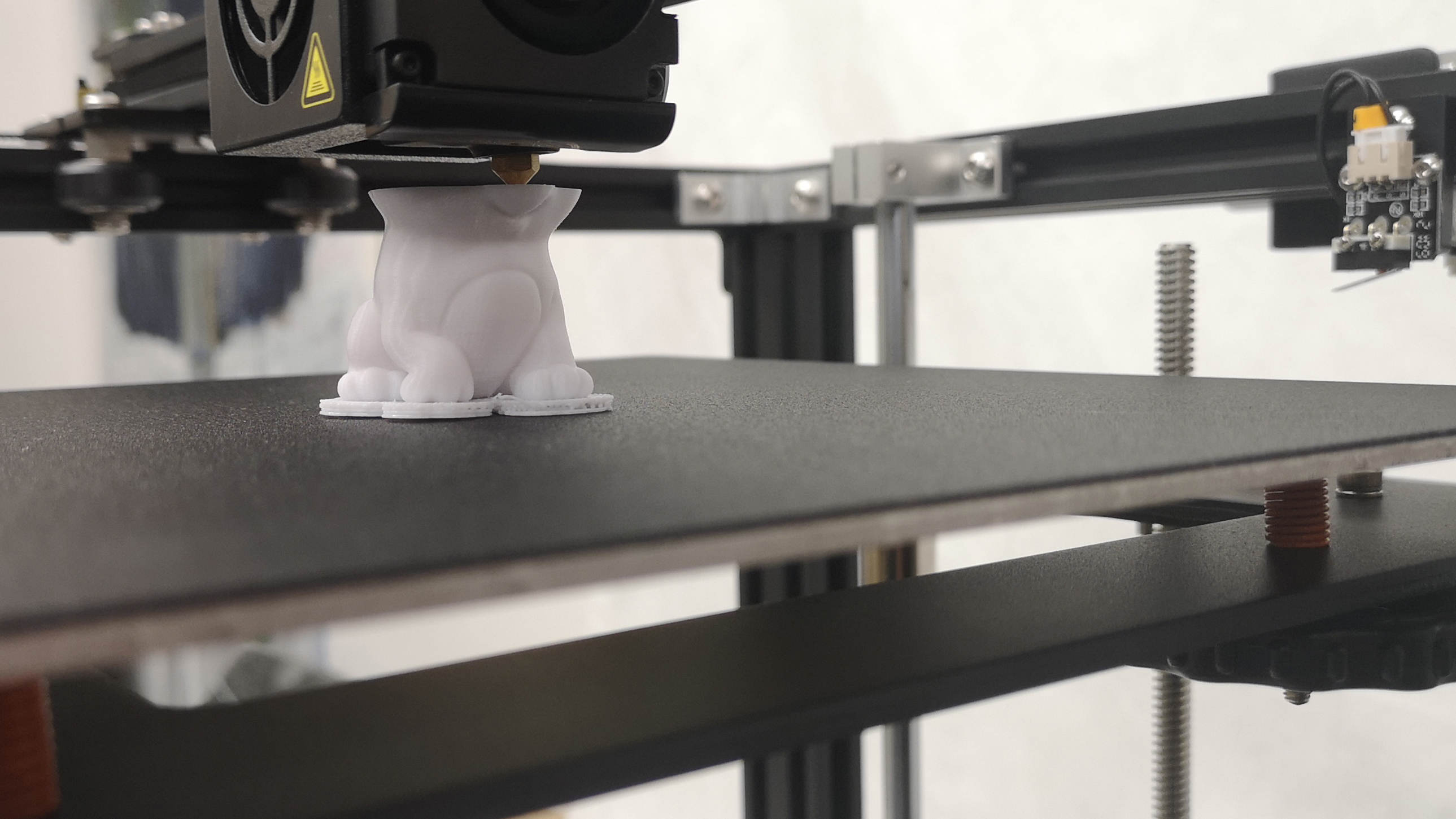 Nach dem Aufbau und dem manuellen Ausrichten des Druckbetts starten wir mit den auf der Speicherkarte vorhandenen Testdrucken (Katze und Hund). Diese zeigen auf Anhieb ein gutes Druckbild. Insbesondere beim Modell vom Hund haben wir für dieses Preissegment nichts zu meckern. Bei glatten Oberflächen sind Arbeitsgeschwindigkeiten von 100 mm/s möglich. Bei dem Modell der Katze, die durch ihre unebene Außenhaut sehr viele zittrige Bewegungen des Druckkopfes erzeugt, fällt das leicht vibrierende Druckbett auf, welches sich insgesamt negativ auf das Druckbild auswirkt.