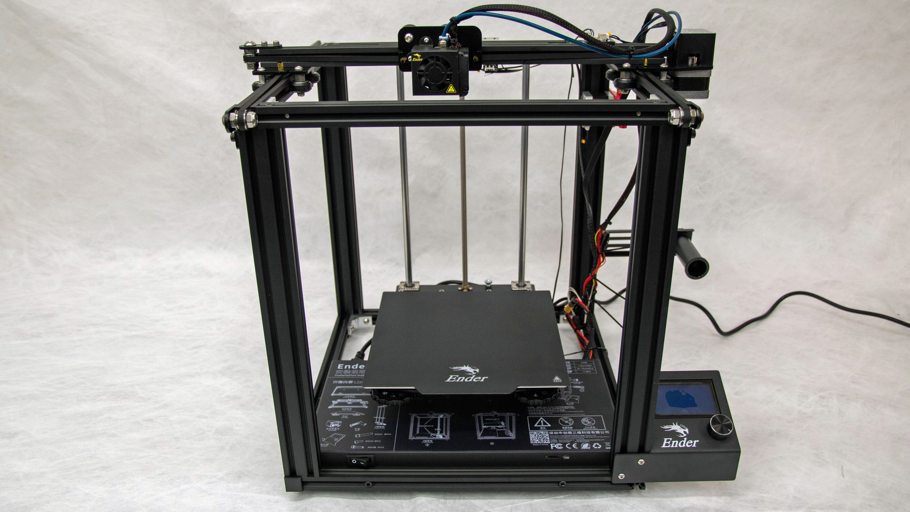 Kleiner Wermutstropfen ist der Kabelsalat beim Ender 5. Zum Aufräumen der Strom- und Signalleitungen werden lediglich einige Kabelbinder mitgeliefert. Wer sich ein aufgeräumtes Erscheinungsbild wünscht, sollte hier einen Kabelschutzschlauch nachrüsten. Das Kontroll- Panel zur Steuerung des Druckers ist hochwertig verarbeitet und die Software Marlin übersichtlich und einfach zu bedienen. So kennen wir das schon vom Ender 3.