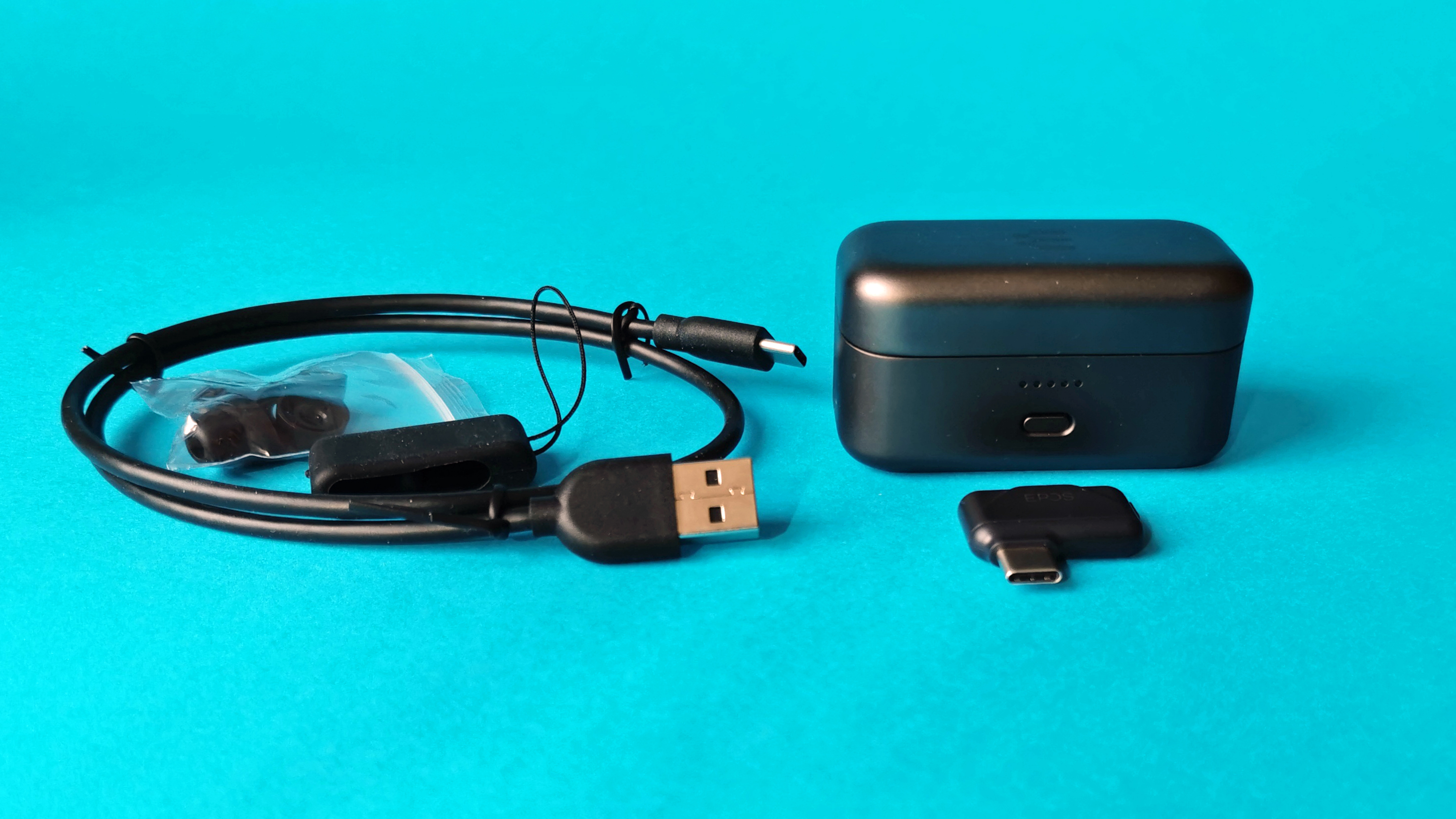 Die GTW 270 kommen dem Preis entsprechend hochwertig verpackt beim Kunden an. In Inneren des schwarzen Kartons liegen eine Kurzanleitung, ein USB-C-Ladekabel, ein USB-A auf USB-C-Adapterkabel, ein Tütchen mit verschieden großen Silikonaufsätzen, der kleine USB-C-Dongle samt Schutzhülle, die beiden In-Ear-Kopfhörer und die Ladeschale aus dunkelgrauem Aluminium.