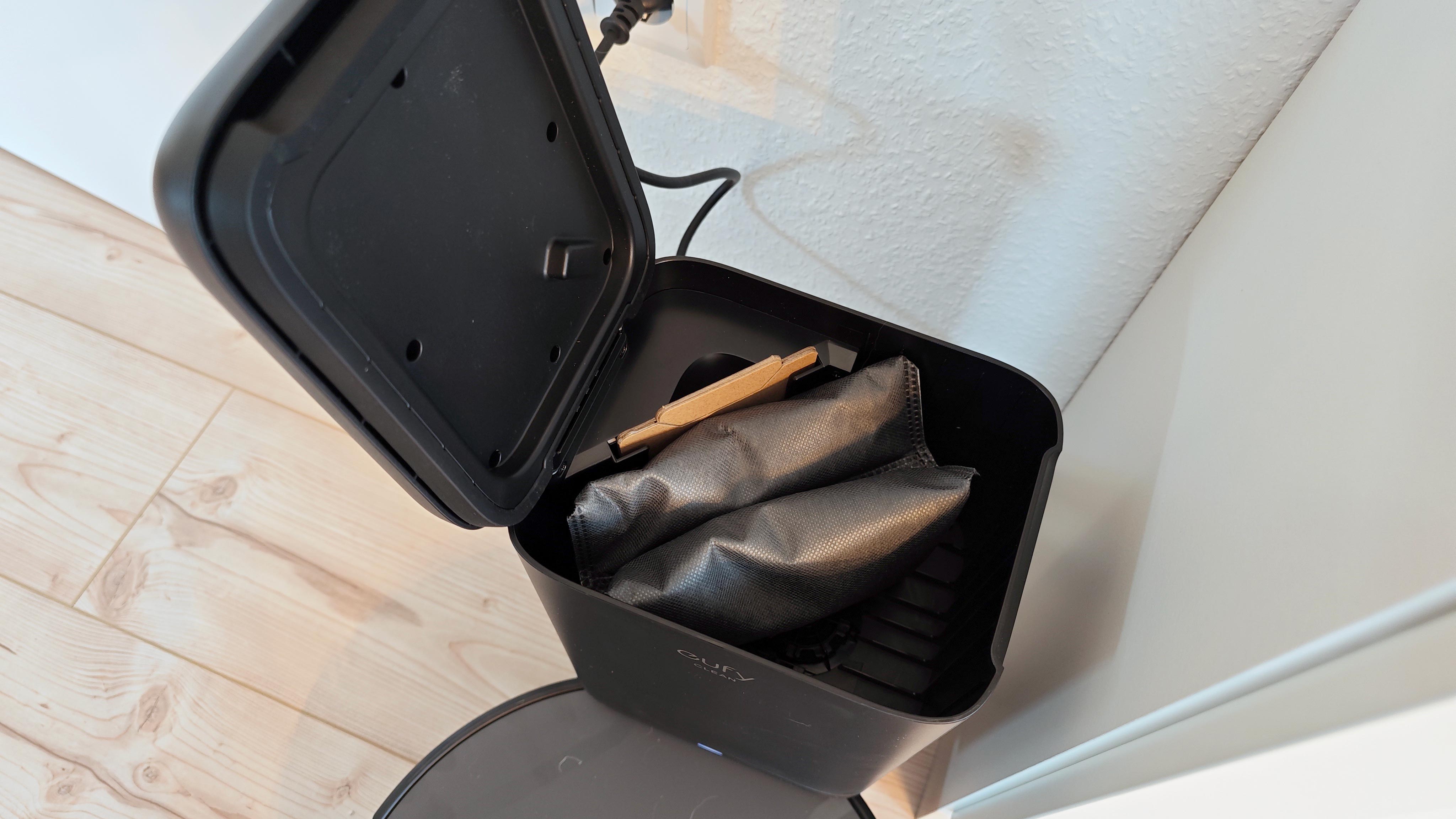 Beim Roboter setzt Eufy auf eine runde Form mit Laserturm. Das Kunststoffgehäuse lässt sich dabei oben öffnen und erlaubt so Zugriff auf den Staubbehälter. Der Wassertank mit Wischtuchaufnahme wird hinten aus dem Gehäuse entnommen. Die Oberseite ist in einem angenehmen Grauton vom schwarzen Korpus abgesetzt. Während der Roboter normale Maße aufweist, ist die Absaugstation (SES steht für Staubentleerungsstation) erstaunlich schmal und nicht übermäßig hoch. Mit ihren abgerundeten Kanten wirkt sie beinahe filigran. Leider fehlt ein Kabelmanagement. Viel Verbrauchsmaterialien gibt es nicht, alles ist genau ein Mal im Lieferumfang vorhanden.