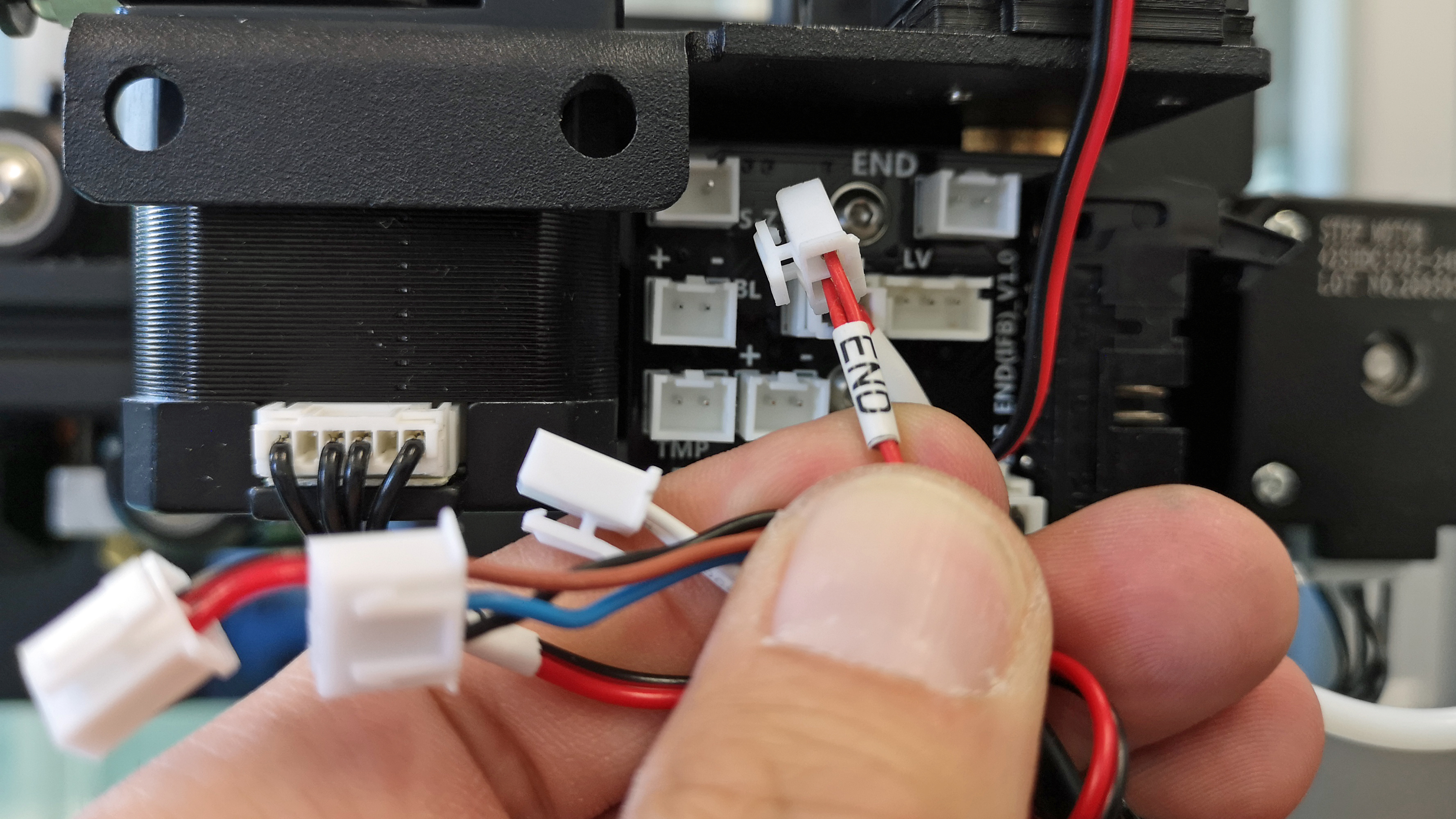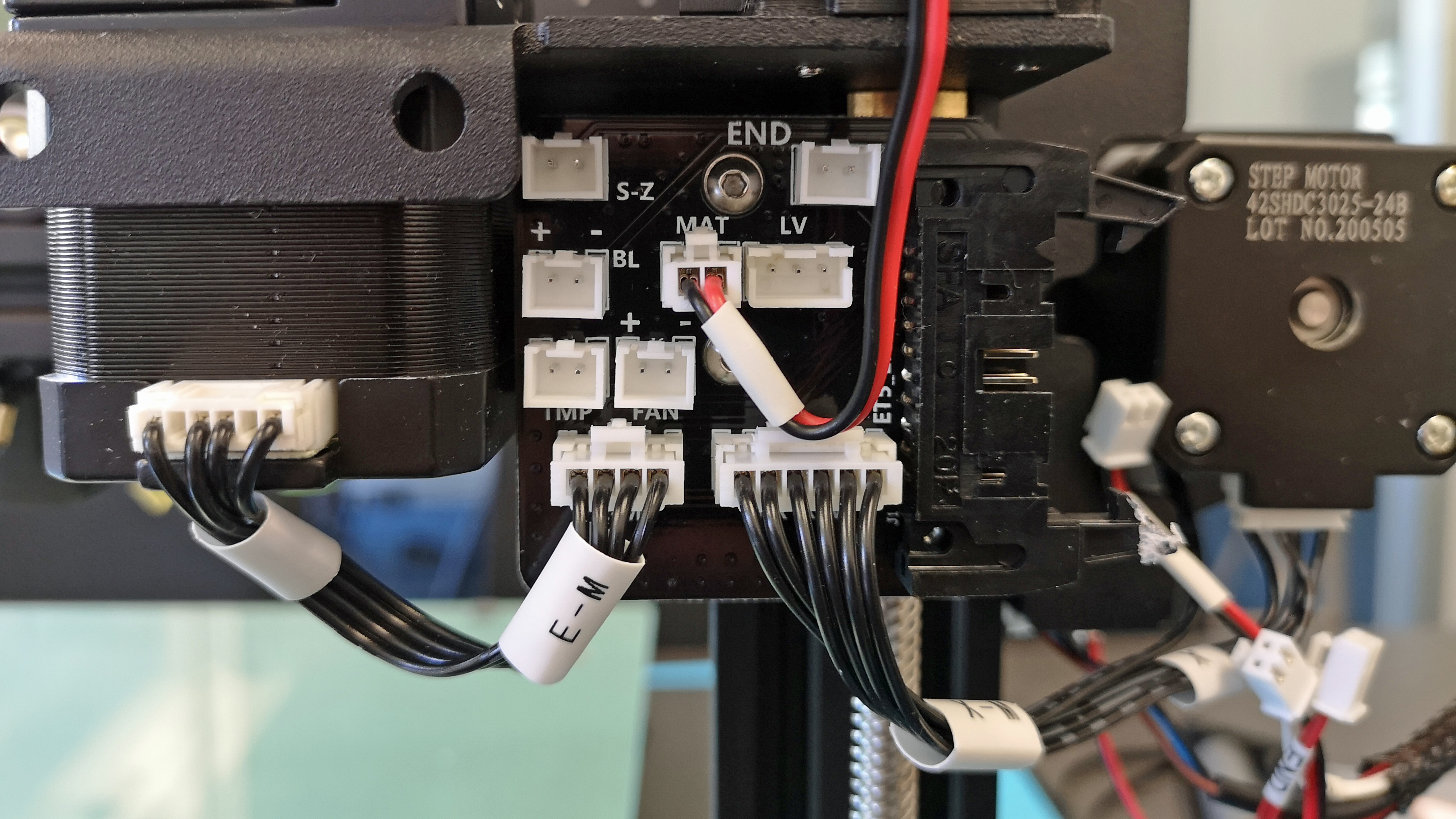 Als Nächstes erfolgt das Entfernen der Transportsicherungen an der y-Achse und das Anstecken der Elektronik. Das Zuordnen von Steckern und Buchsen ist unkompliziert, da alle Teile ordentlich beschriftet sind. Das haben wir bei anderen Bausätzen schon anders erlebt. Nun folgt die Verbindungen von Verteilerboard und Mainboard und der Anschluss vom Bowdenzug zur Führung des Filaments. Die letzten Schritte sind die Befestigung der Filamentrollenhalterung und das Anstecken des Netzteils.