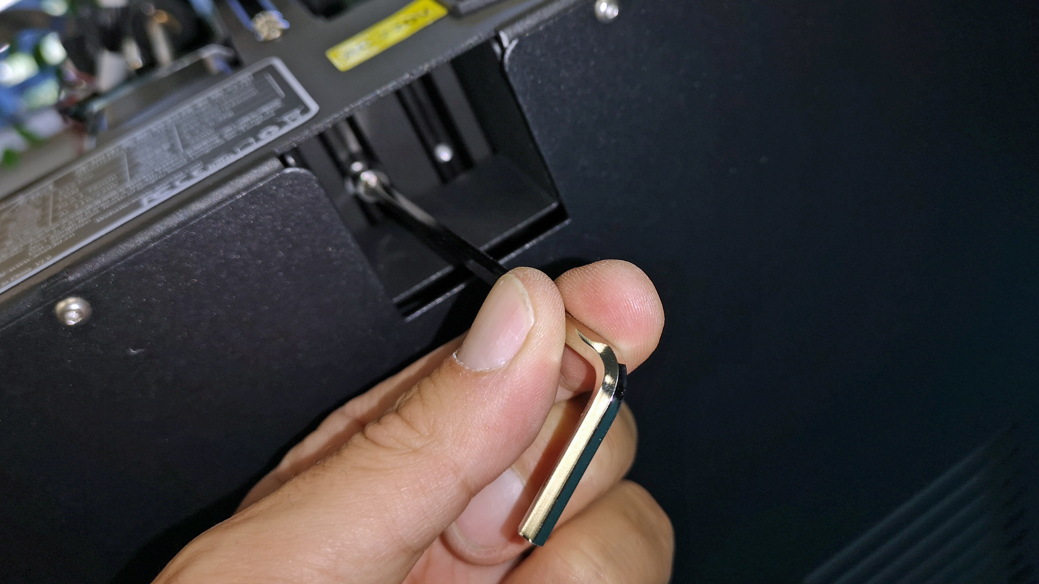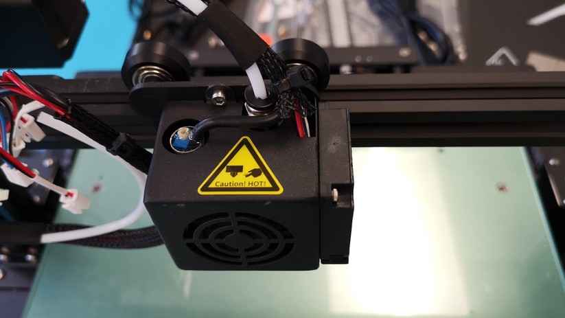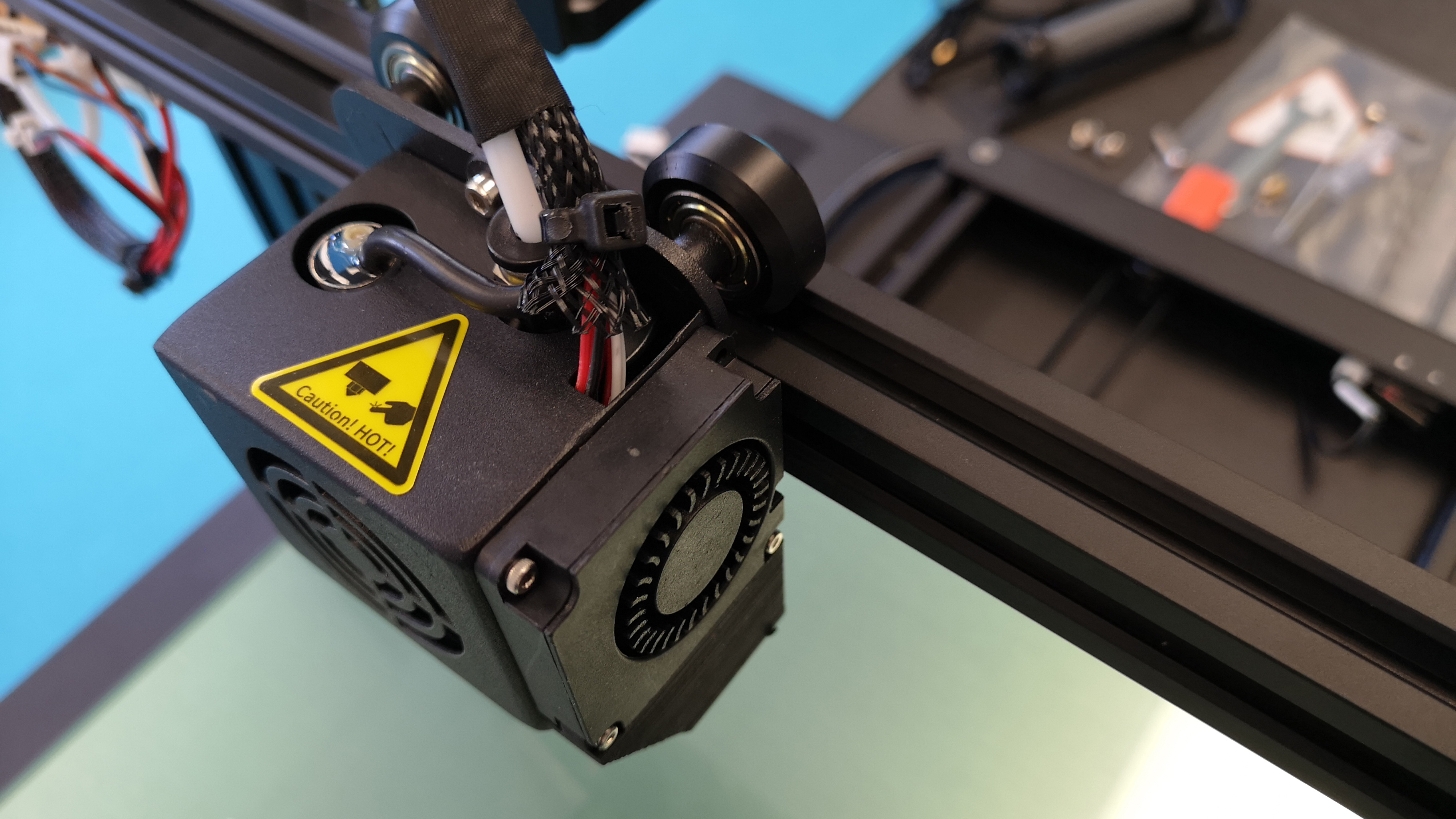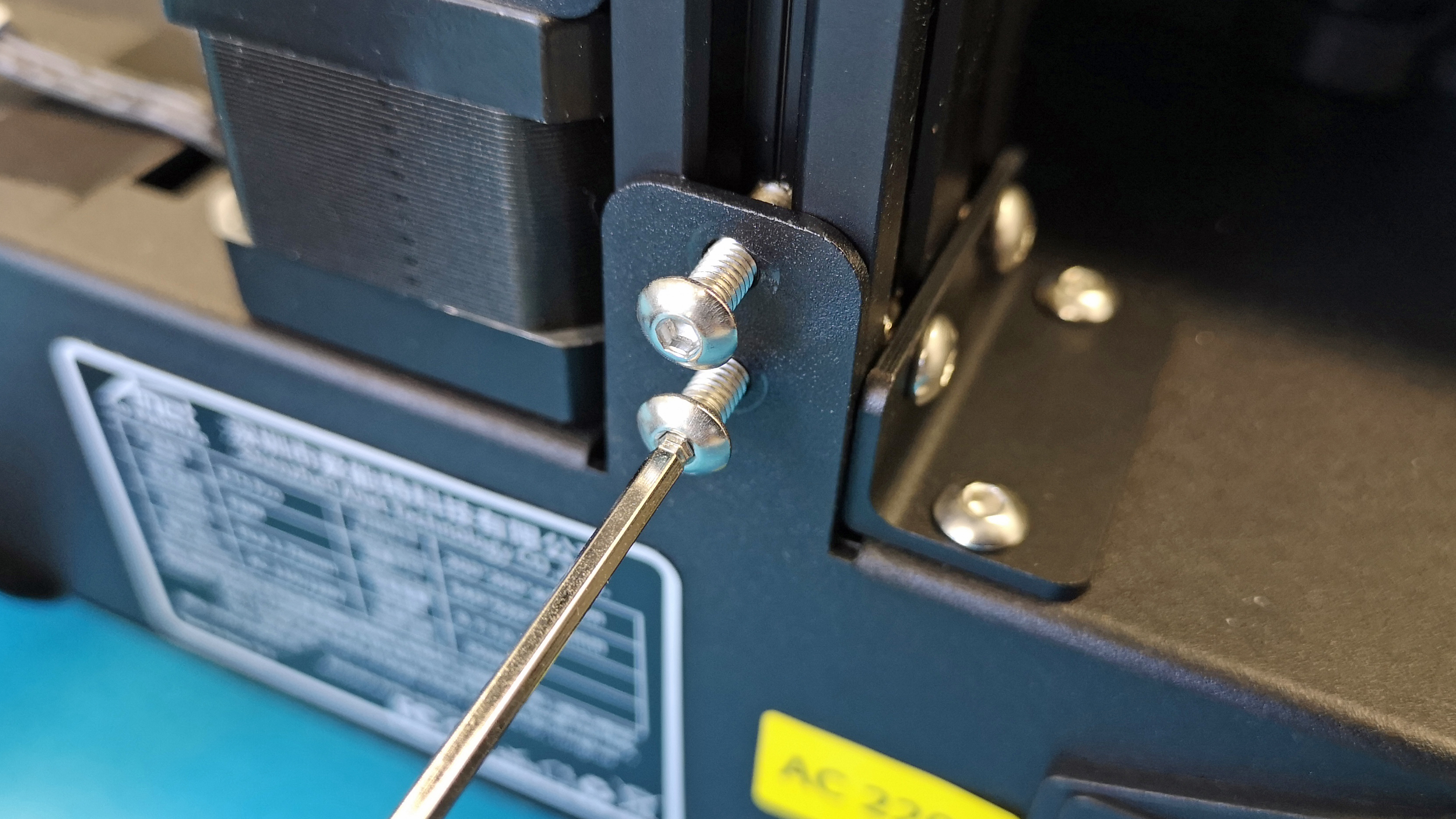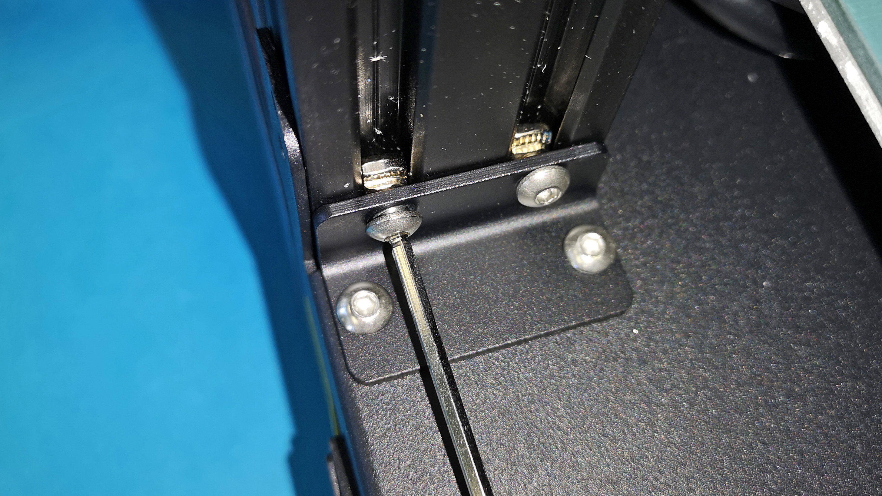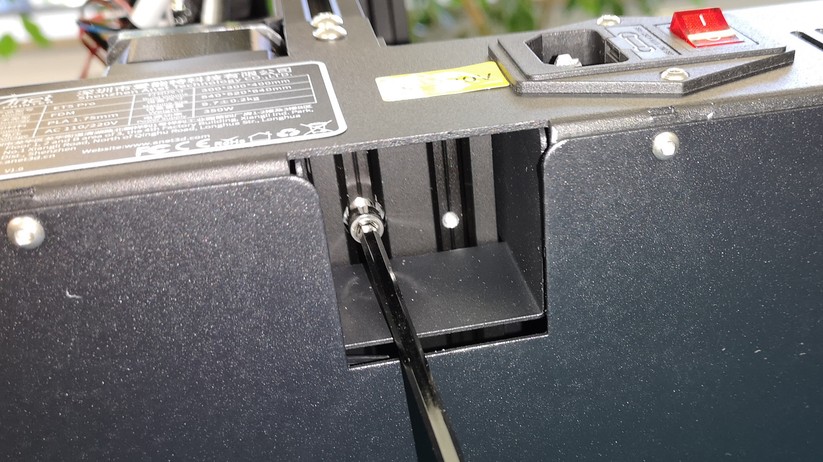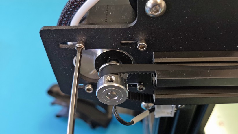 Nach dem Einschalten lassen wir die automatische Druckbettkalibrierung durchlaufen und stellen dabei ein komisches Geräusch bei Bewegungen an der y-Achse fest. Das Problem ist schnell gefunden. Eine minimal zu niedrig montierte Führungsrolle sorgt dafür, dass der Zahnriemen nicht sauber läuft. Mit einem, leider nicht im Lieferumfang enthaltenen Innensechskantschlüssel, haben wir die Rolle gelockert, nach oben verschoben und anschließend wieder festgezogen. Nun läuft alles sauber und annähernd geräuschlos.