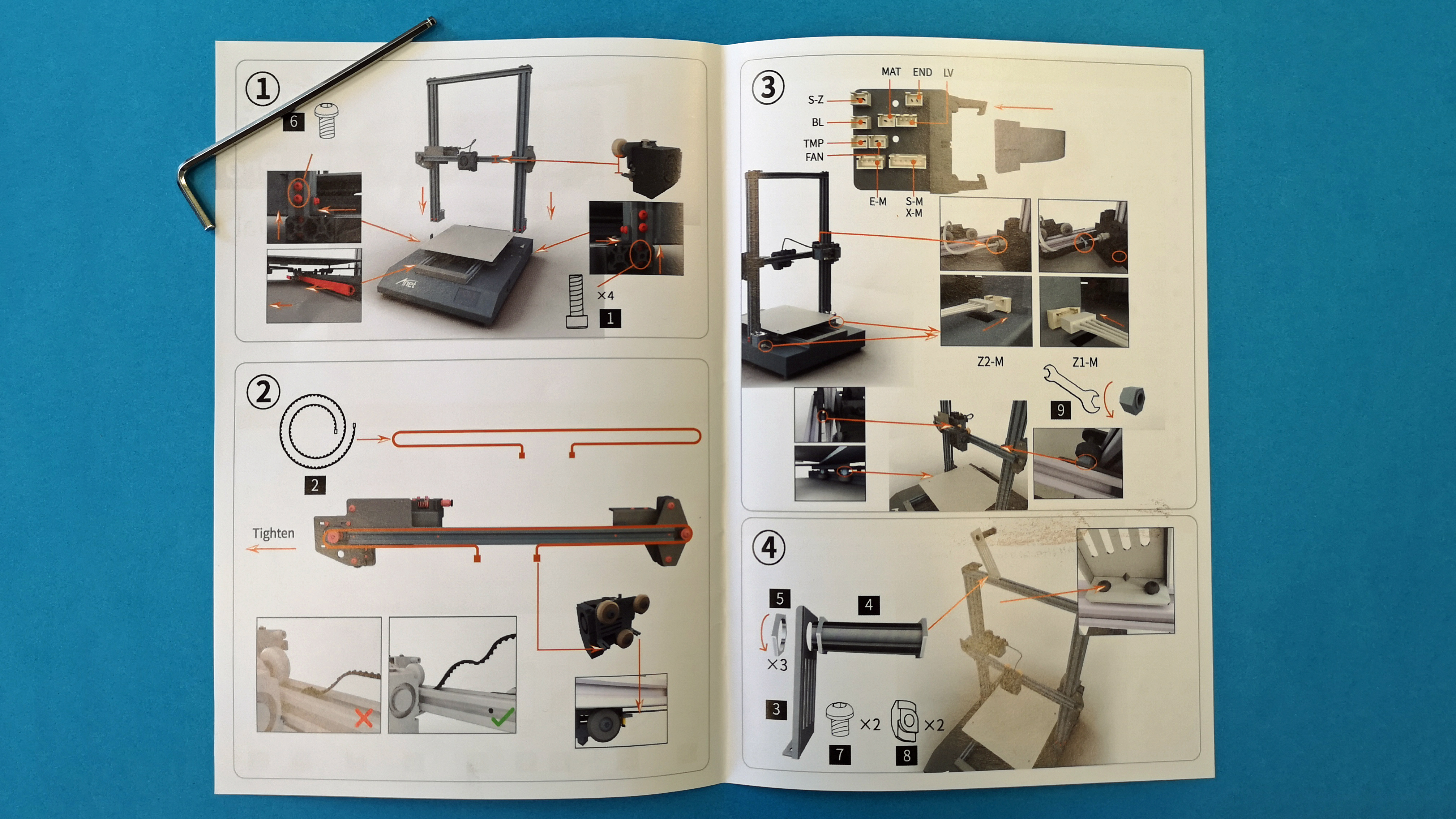 Ansonsten liegen eine Tüte mit einem Dutzend Schrauben, Werkzeug, USB-Cardreader inklusive Micro-SD-Speicherkarte und eine Rolle schwarzes PLA-Filament bei. Ein Spulenhalter und das benötigte Kaltgerätekabel sind ebenfalls beigepackt. Die kurze Aufbauanleitung ist ordentlich bebildert und leicht verständlich.