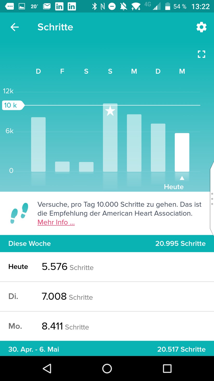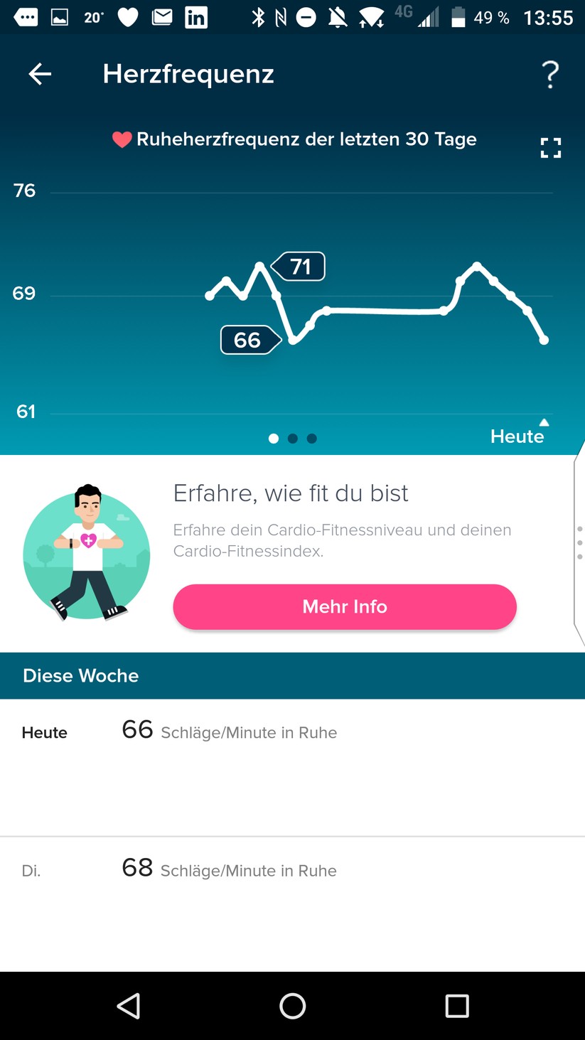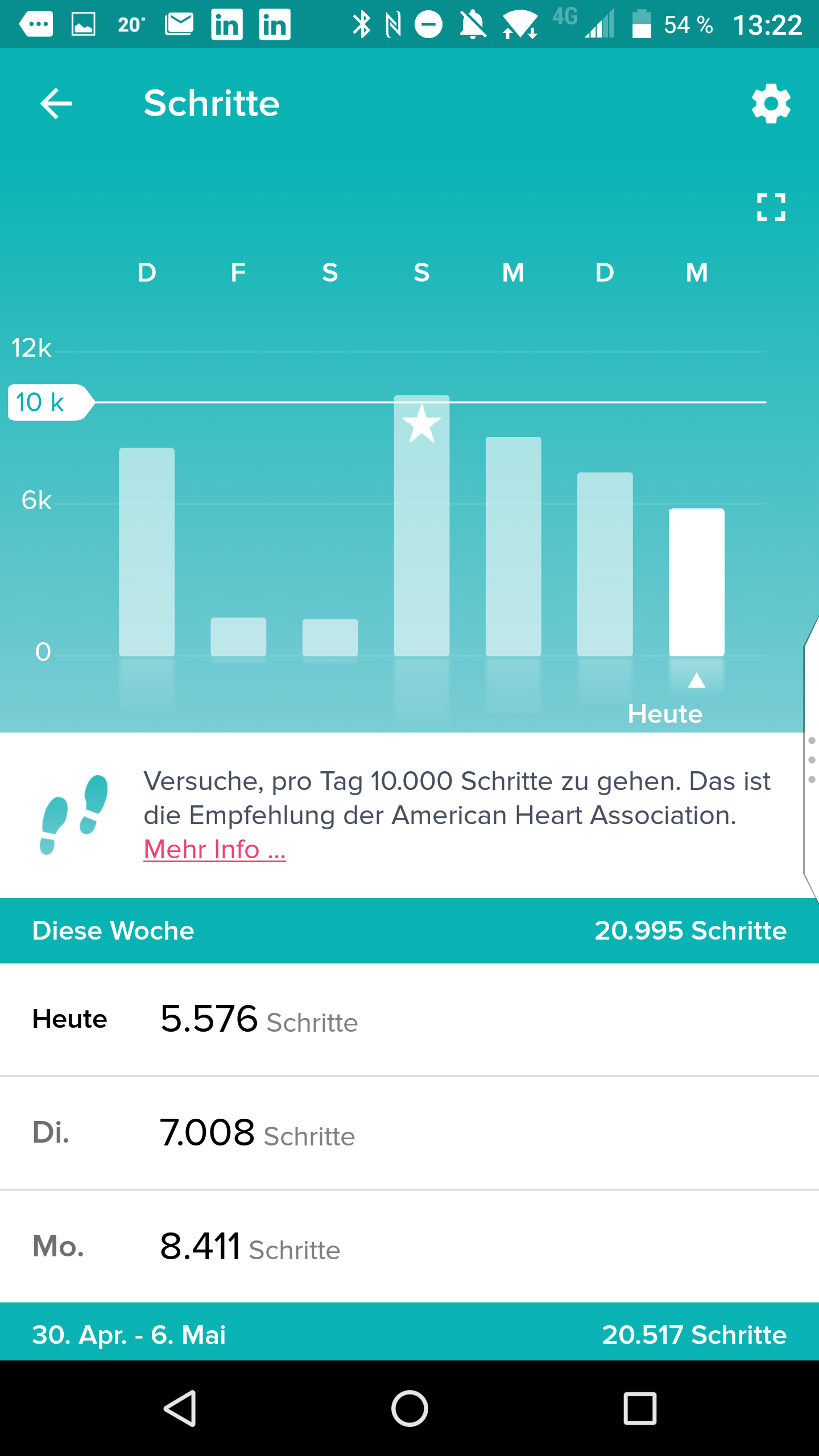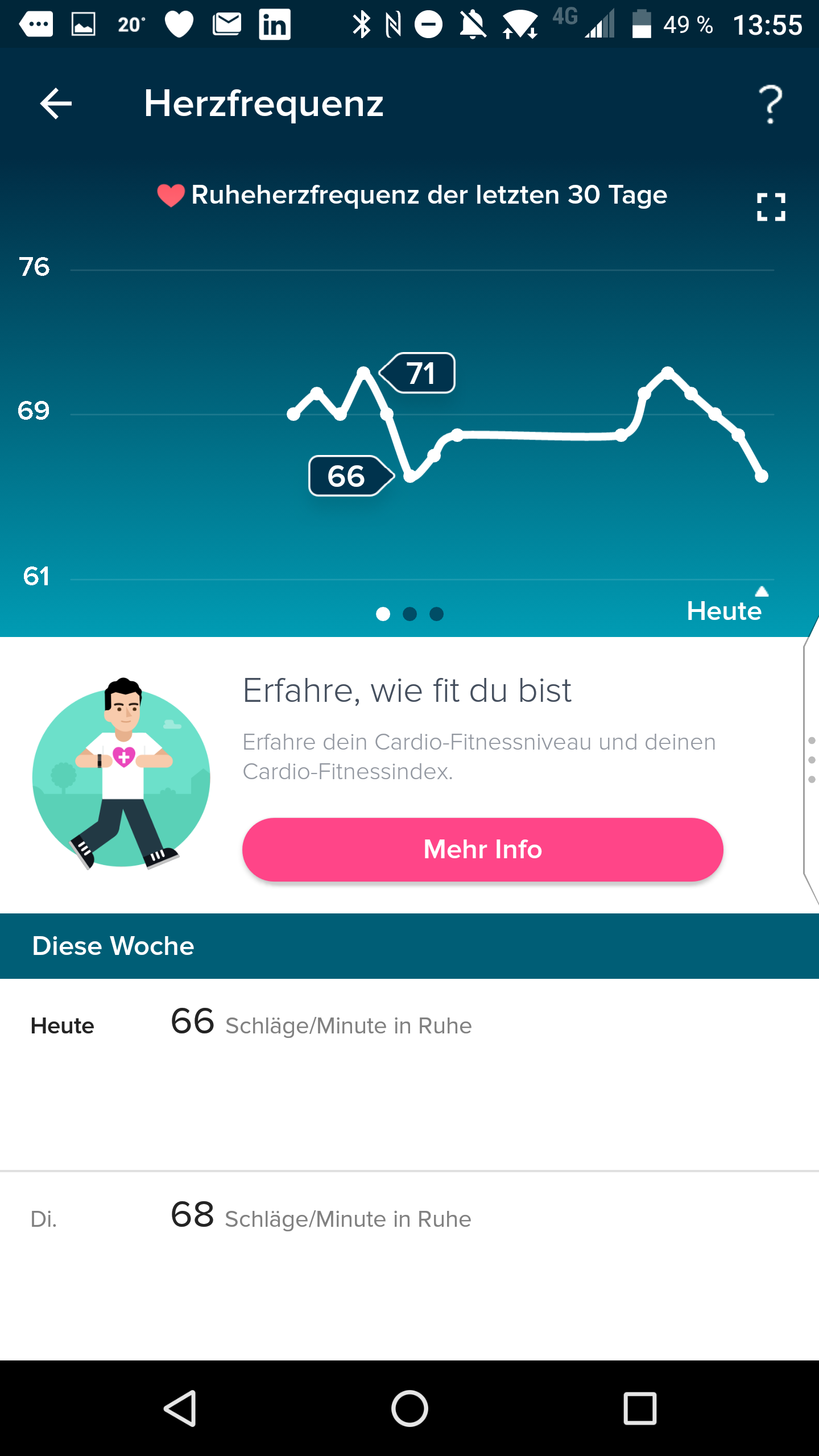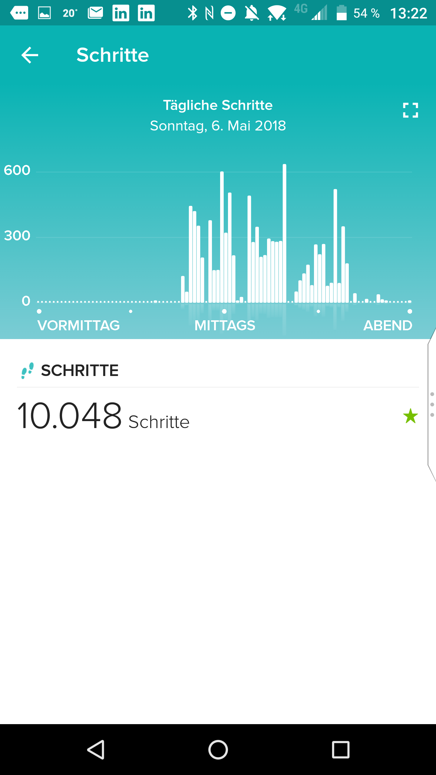 Die Überwachung der Schritte ist Hauptaufgabe für den Fitbit Alta HR. Dies erledigt er auch sehr gut, auch wenn wir das Gefühl haben, dass der Tracker etwas strenger ist als die Konkurrenz. Fitbit setzt das Limit bei 10.000 täglichen Schritten. Diese Zahl ist eigentlich überholt, schadet als Ziel aber auch nicht. Wem das zu viel oder zu wenig ist, der kann die Zahl auf einen beliebigen Wert setzen. In der App sieht man schön, wann man sich wie weit bewegt hat.