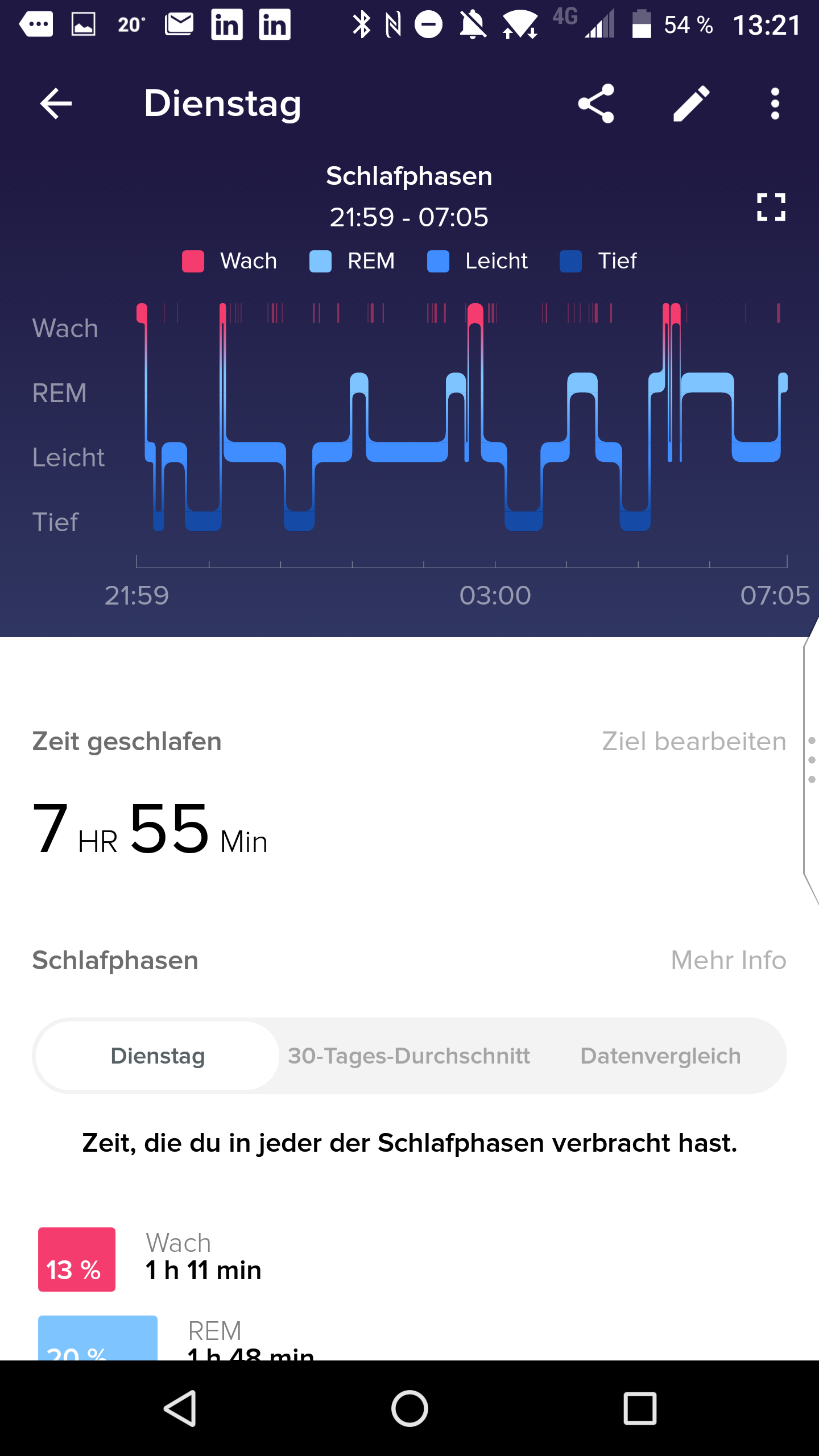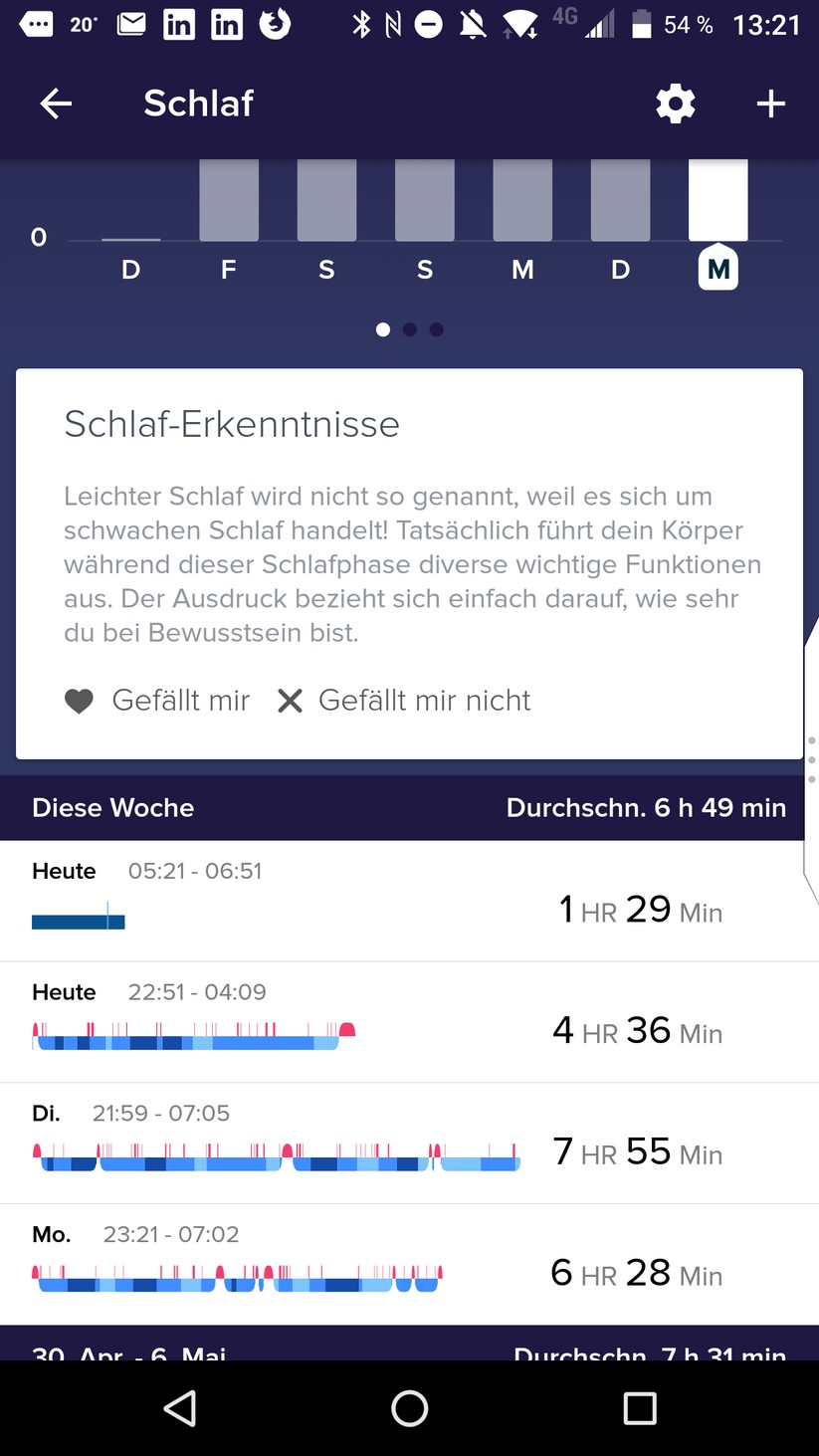 Die Schlafüberwachung funktioniert sehr gut. Der Tracker ist so schmal, dass er uns im Schlaf nicht störte. Die in der App aufgezeichneten Daten zu leichtem und tiefem Schlaf sowie REM-Phasen können wir ohne Schlaflabor zwar nicht exakt überprüfen, gefühlt stimmen sie für den Tester aber überein. Fitbit empfiehlt täglich acht Stunden Schlaf, der Alta HR ist eine solide Hilfestellung, wenn man den eigenen Schlaftrend untersuchen und eventuell verbessern will.