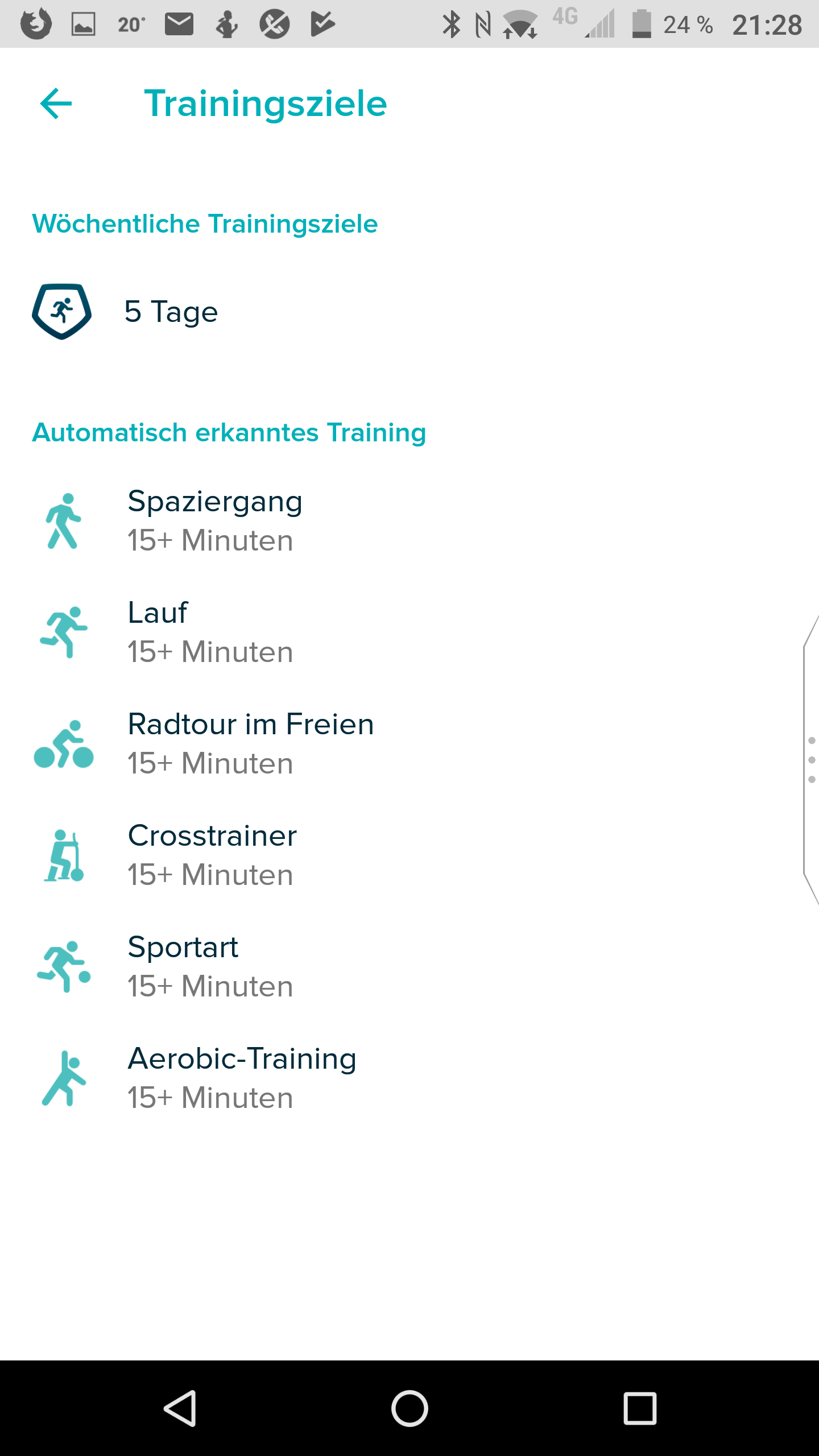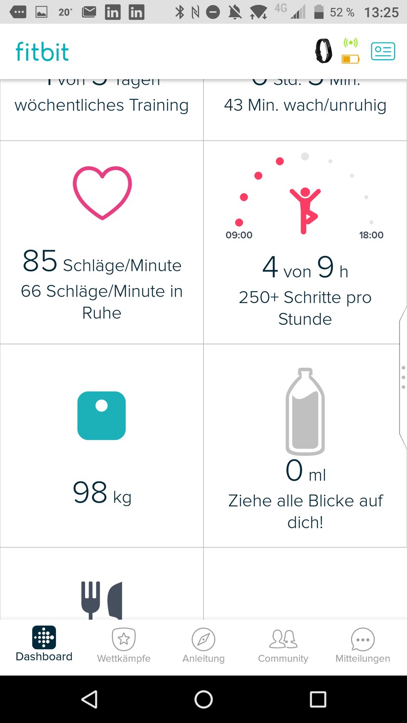 Der Alta HR gibt uns immer wieder Feedback, fordert uns etwa auf, „Nur noch 250 Schritte“ zu gehen. Das ist im Büroalltag zwar nett, kommt aber meistens zum falschen Zeitpunkt. Ähnlich sieht es mit den Erinnerungen an die Bewegung aus. Diese Informationen kommen aus dem Punkt „Bewegung“ in der App und lassen sich dort anpassen oder abschalten.