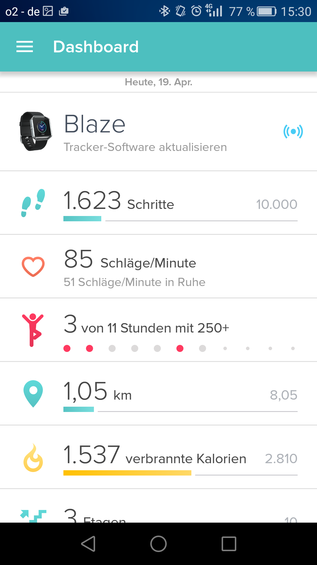 Was ich persönlich noch sehr spannend finde, ist, dass die Blaze wie Ihre diversen Vorgänger die erklommenen Etagen zählt. Mich persönlich hat das damals vor etwa einem Jahr bei der FitBit Surge dazu motiviert, im Büro den Aufzug links liegen zu lassen und in den dritten Stock zu laufen – und die Angewohnheit habe ich bis heute beibehalten. Das Zählen der Stockwerke funktioniert ziemlich genau.