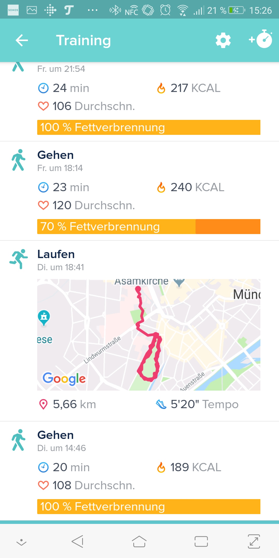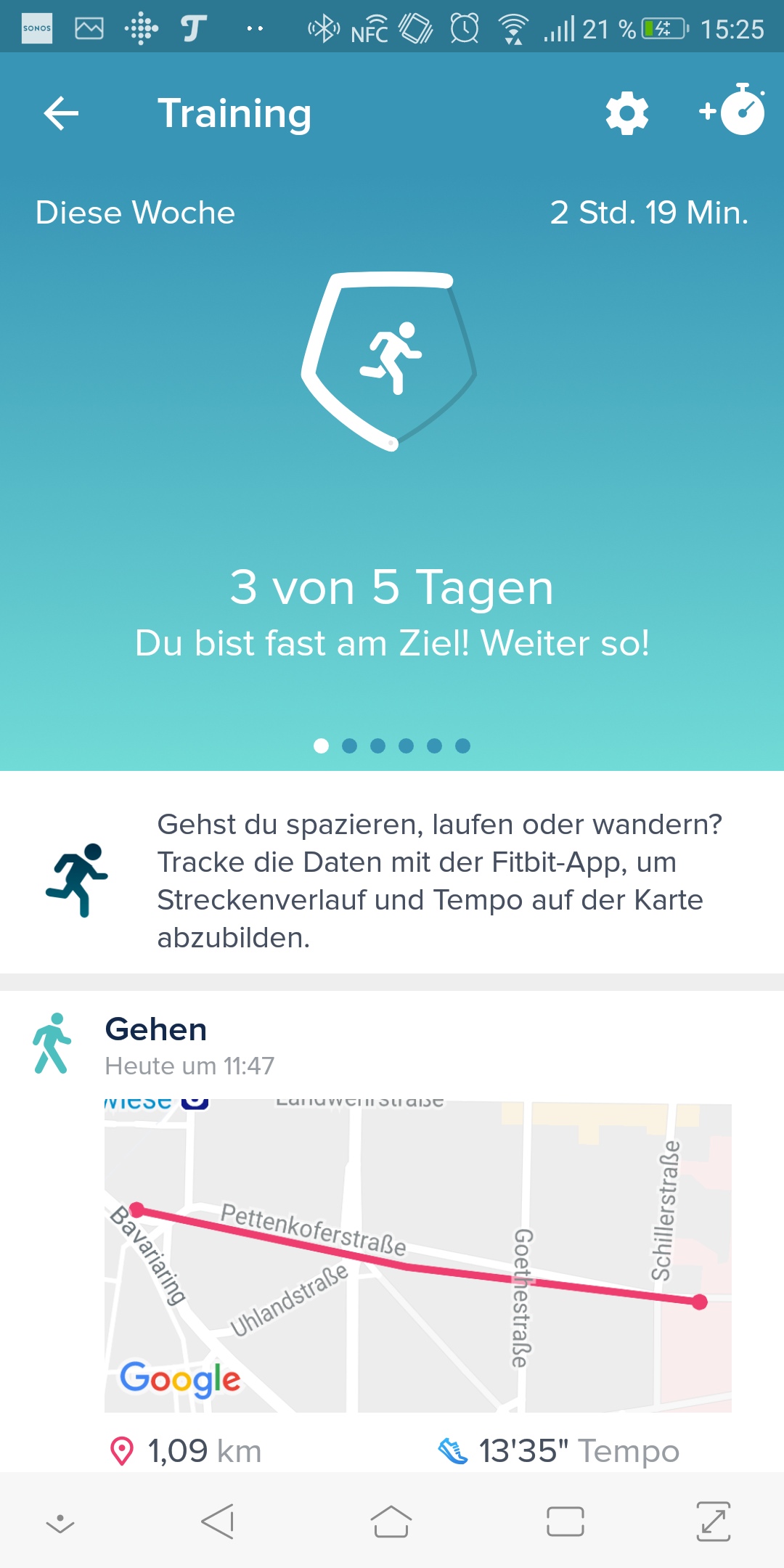 Der Fitbit-Tracker überwacht nicht nur den Alltag, sondern hilft auch beim Training. Zumindest wenn die Pulsmessung funktioniert, siehe oben. Die Inspire HR hat kein eigenes GPS, sondern nutzt die Position eines verknüpften Smartphones, solange es in Bluetooth-Reichweite ist. Das funktioniert im Alltag ziemlich gut, normalerweise hat man sowieso ein Smartphone für die musikalische Unterhaltung dabei.