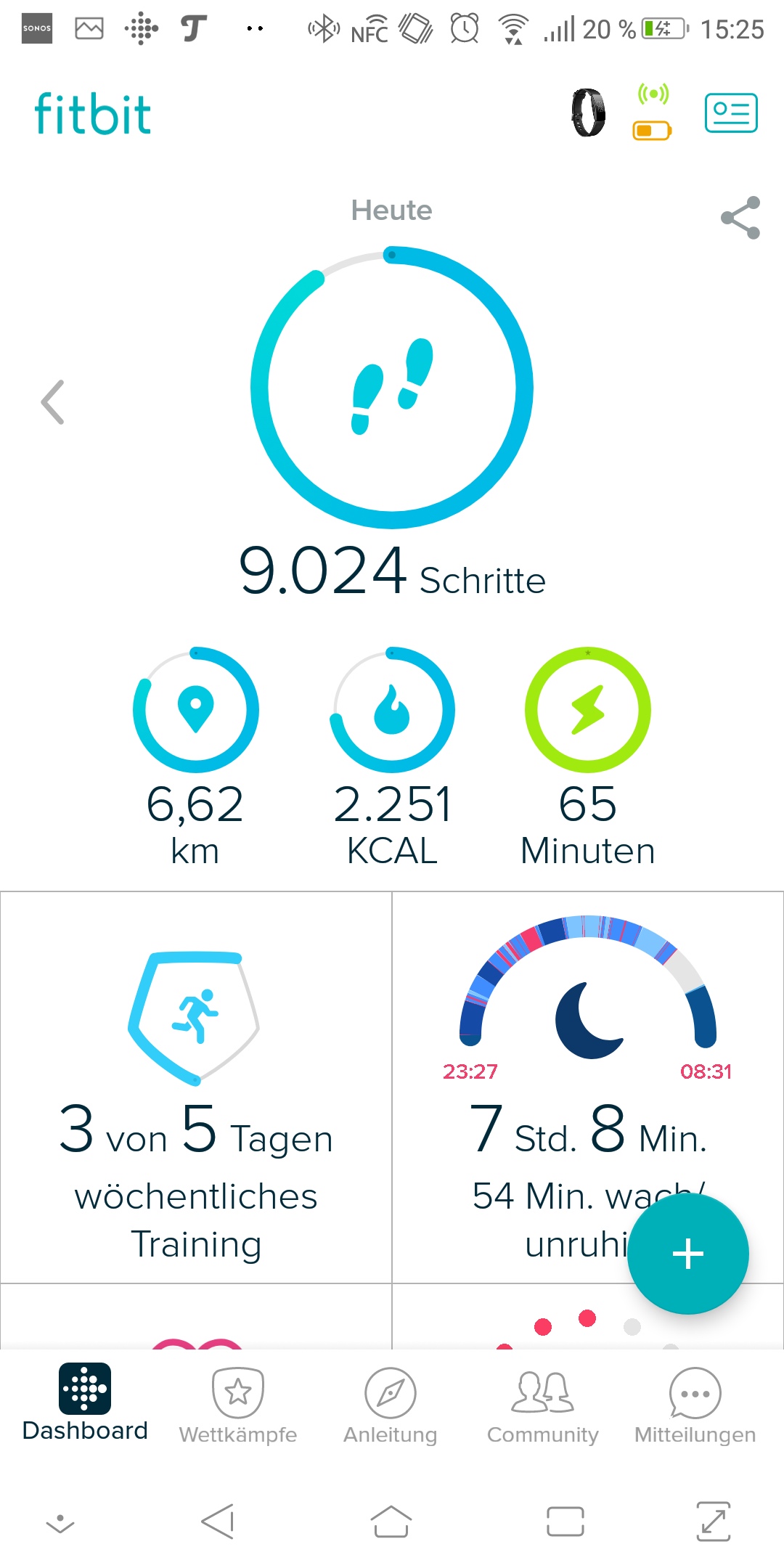 Kein Meckern gibt es bei der App. Die Fitbit-App hat uns schon immer gut gefallen, sie liefert alle wichtigen Funktionen, ohne den Nutzer zu überfrachten. Die Startseite zeigt direkt die wichtigsten Daten an, neben den zurückgelegten Schritten sieht man Informationen zu den Aktivitätsminuten, dem wöchentlichen Training und dem letzten Schlaf.