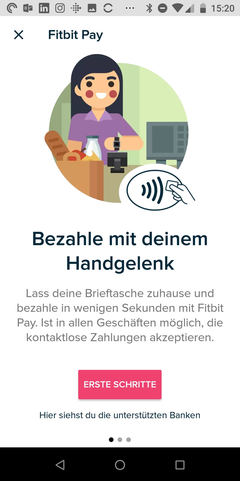 Die Fitbit Versa besitzt eigentlich eine Zahlungsfunktion. Kurz gesagt hinterlegt man eine bestehende Master- oder Visa-Card auf dem Gerät und kann anschließend an kontaktlosen Terminals damit bezahlen. Die Funktion aktuell mit zwei Systemen kompatibel, der BW Bank sowie Boon vom Zahlungsdienstleister Wirecard. Fitbit baut dieses Ökosystem langsam aus.