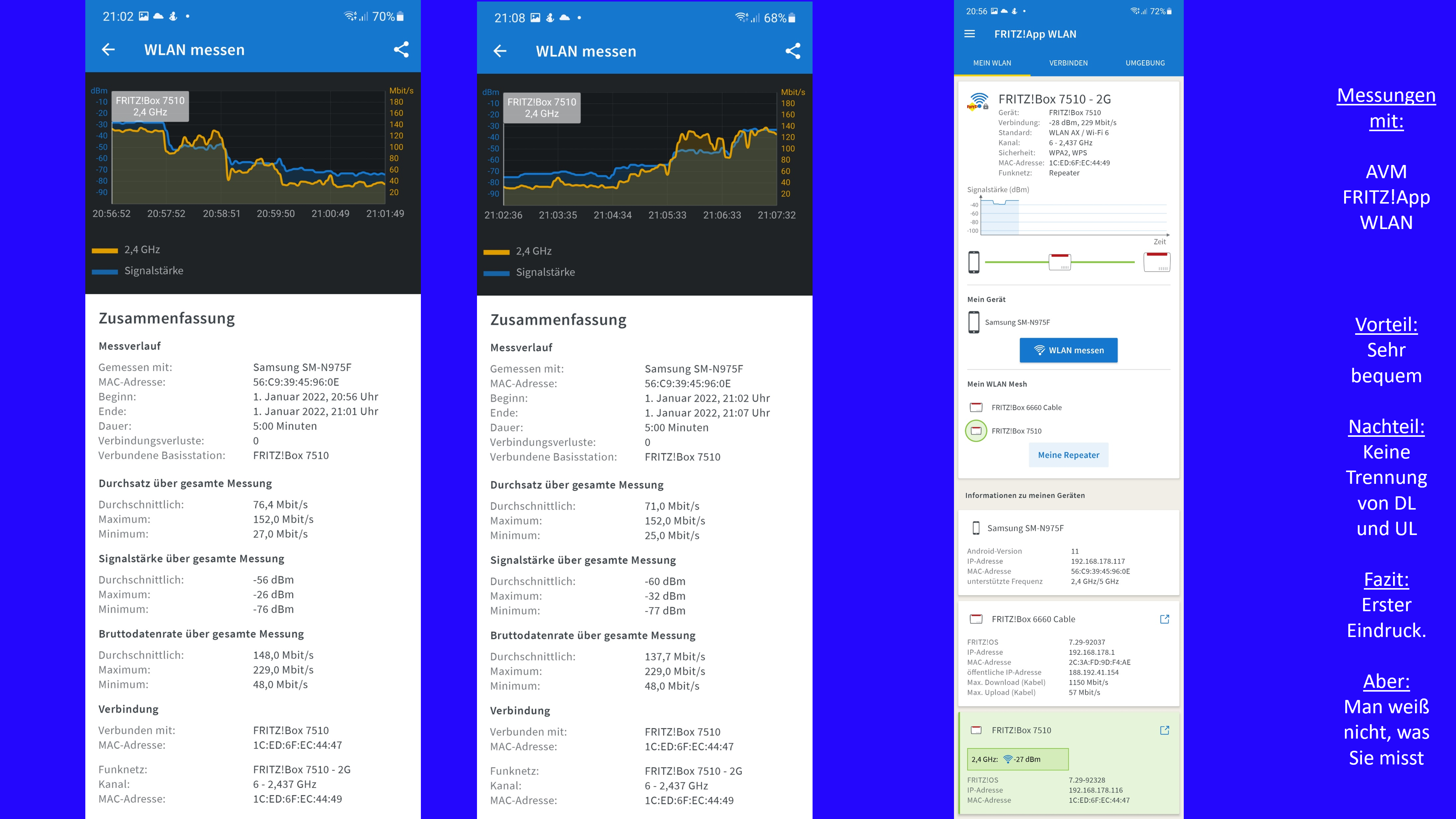 Vorsicht: In unserer überfüllten 2,4-GHz-Großstadt-Luft konnte die 7510 nur 20 MHz Kanäle aufspannen. In ungestörter Alleinlage wären wohl auch 40 MHz Kanäle möglich. Dann würde sich der Netto-Durchsatz fast verdoppeln. Dann wären auch 350 MBit/s netto mit der 7510 machbar.