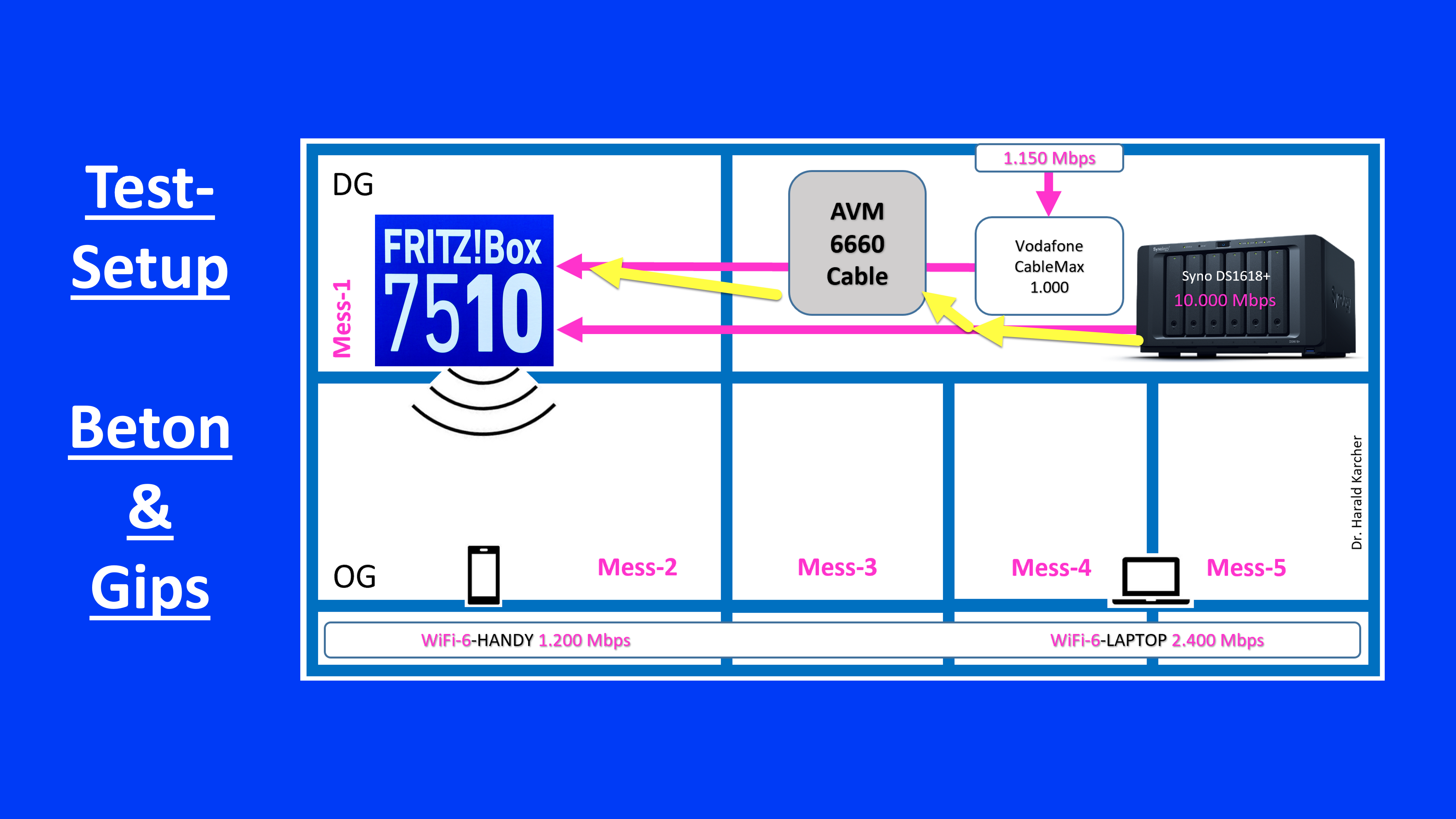 Die Frage lautet nun: Wie schnell kann die kleine Fritzbox 7510 das Internet aus dem Vodafone-Kabel und die Dateien aus dem NAS-Speicher-Server letztendlich an diverse Rechner, Laptops und Handys im Rest der Wohnung weiterfunken?