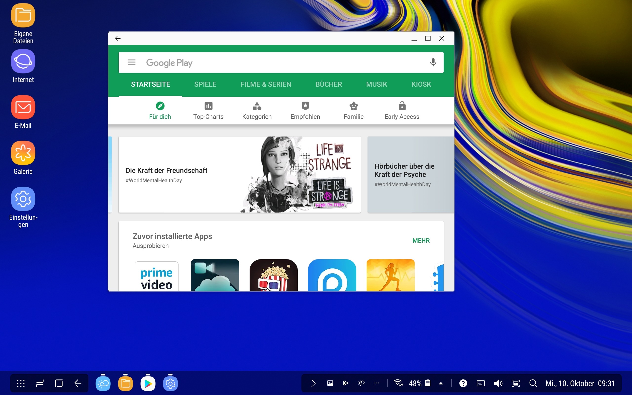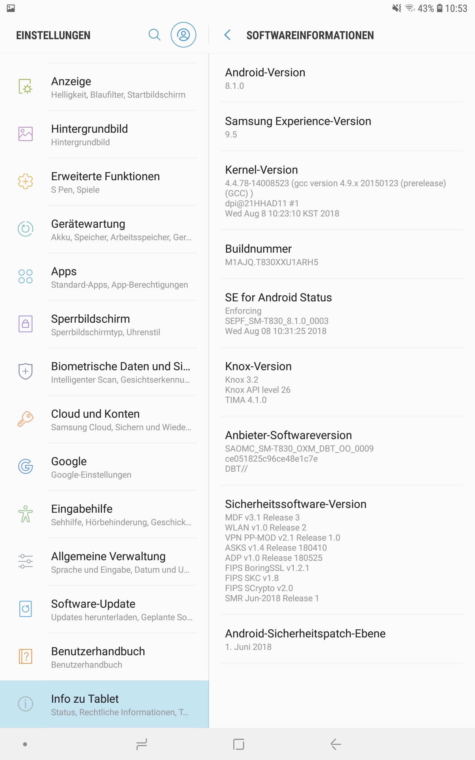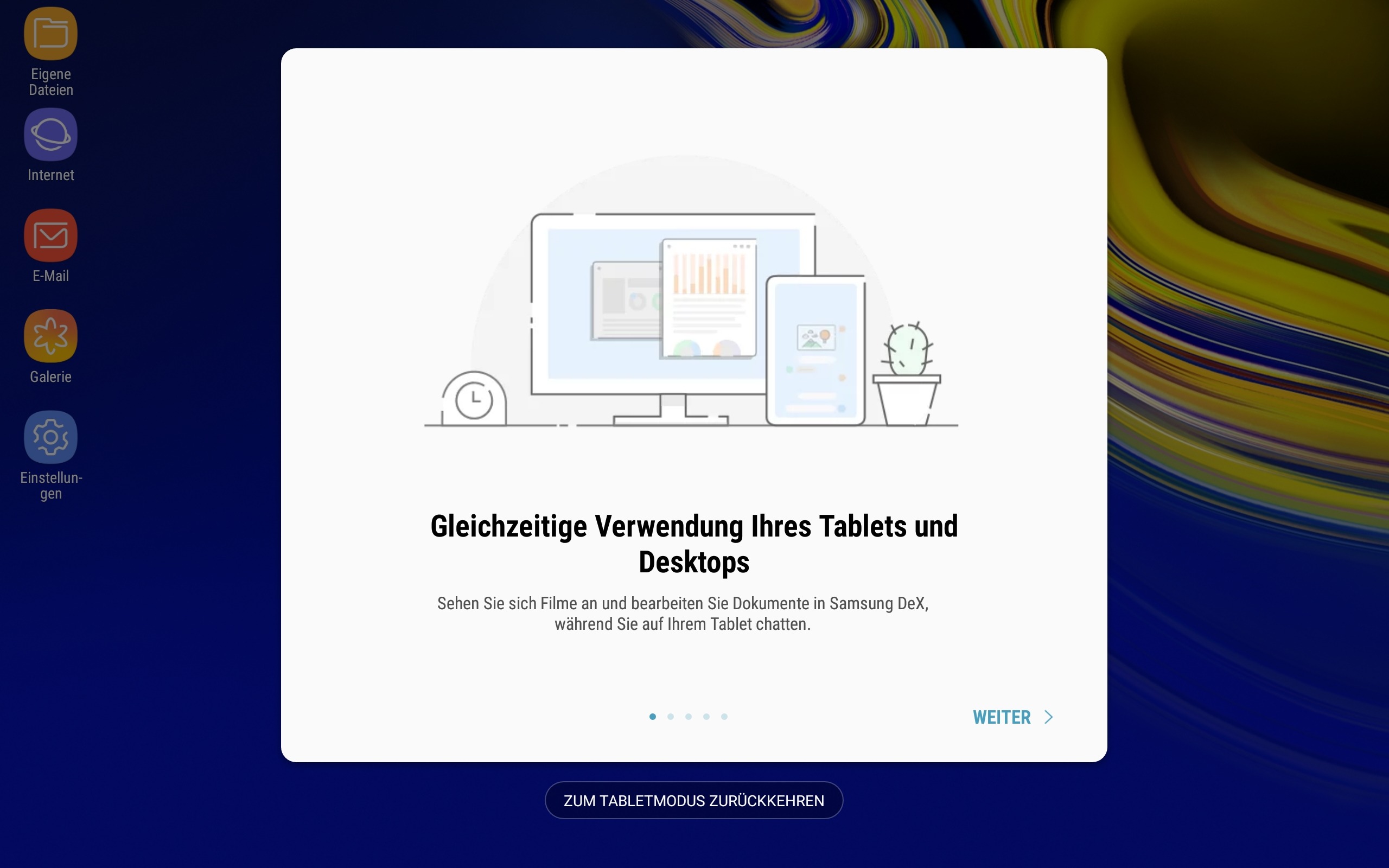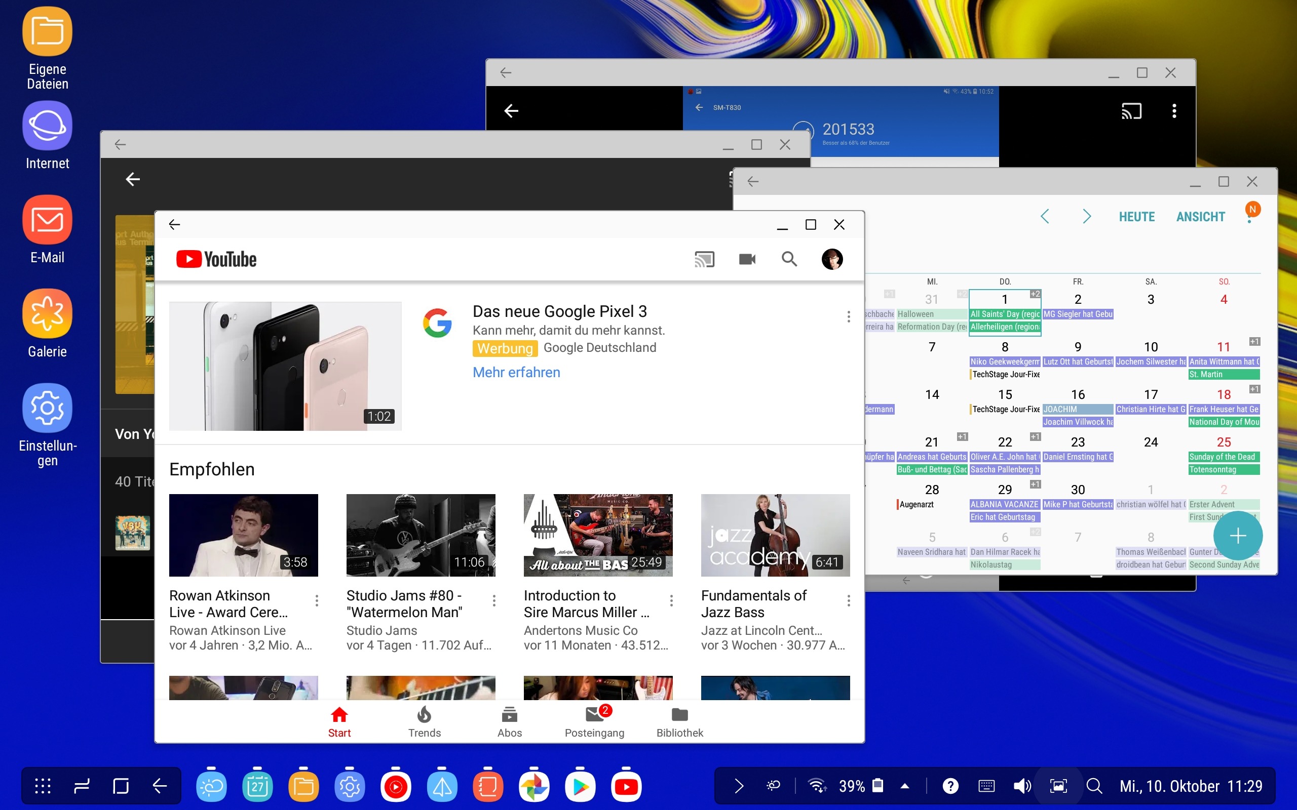 Auf dem Galaxy Tab S4 läuft die Samsung-Experience-Version 9.5 basierend auf Android 8.1.0 Oreo. Was das Betriebssystem angeht gibt es mit Samsung Dex ein Highlight-Feature, das uns sehr gut gefällt: Es handelt sich dabei um einen Desktop-Modus, der dem eines Windows-PCs ähnelt. Der Nutzer findet sich dementsprechend dort gut zurecht und kann Applikationen wie er es am Computer oder Laptop gewohnt ist in verschiedenen, frei skalierbaren und verschiebbaren Fenstern nutzen. Dex ist vor allem für die Nutzung mit angeschlossener Tastatur und Maus oder angedocktem Keyboard-Case gedacht, oder aber um die Benutzeroberfläche mit entsprechendem USB-Adapter-Kabel auf einen größeren Bildschirm zu spiegeln. Dex funktioniert aber auch im reinen Tablet-Betrieb gut. Der große Vorteil von Dex im Vergleich mit ähnlichen Lösungen anderer Hersteller wie beispielsweise Huawei ist die Tatsache, dass innerhalb Dex alle auf dem Tablet installierten Apps funktionieren – und nicht nur eine kleine, speziell angepasste Programm-Auswahl. Zwar bietet auch Samsung speziell angepasste Programme für Dex, im Test konnten wir bei der Nutzung jedoch keine größeren Unterschiede zwischen diesen und anderen Apps feststellen.