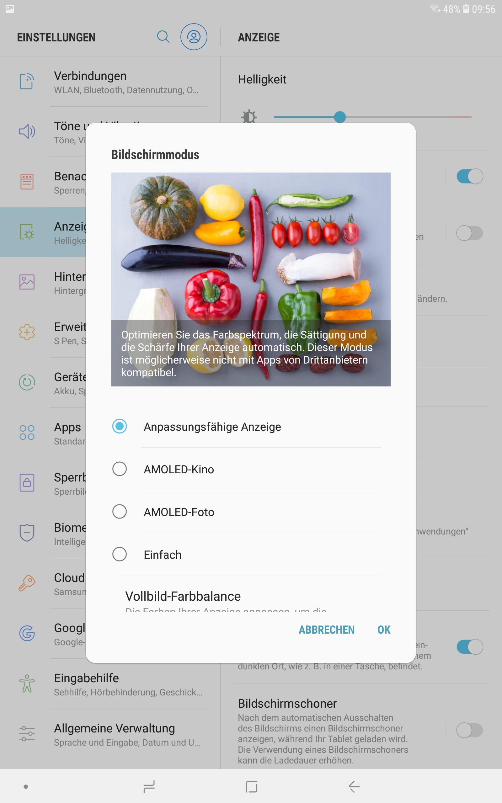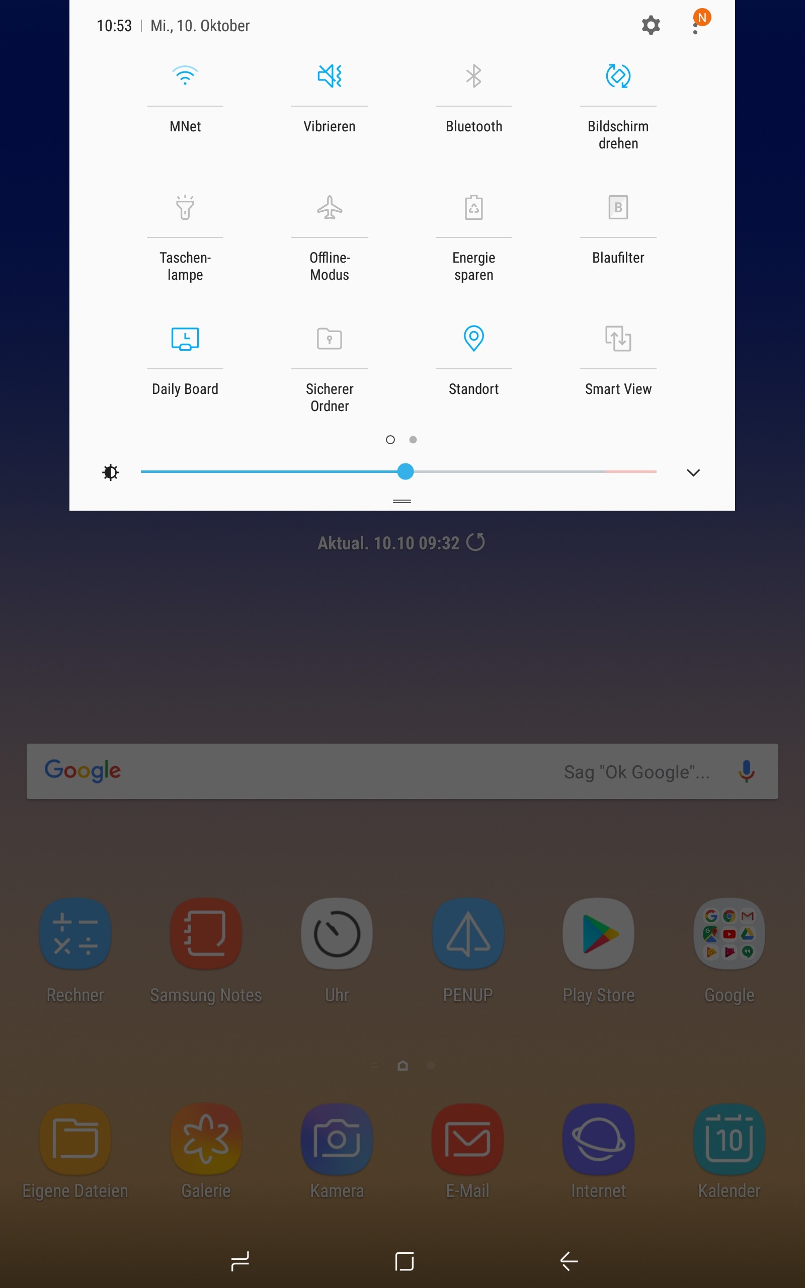 Auf 10,5 Zoll bietet das Amoled-Panel des Galaxy Tab S4 2560 × 1600 Pixel und kommt somit auf eine Pixeldichte von 288 ppi. Wie üblich bei Amoled-Bildschirmen gibt es satte, teils fast etwas übernatürlich wirkende Farben. Innerhalb der Systemeinstellungen stehen dem Nutzer jedoch tiefer gehende Optionen bezüglich Farbspektrum, Sättigung und Schärfe zur Verfügung. Somit ist es kein Problem die Darstellung ganz auf die eigenen Bedürfnisse einzustellen. Zur Schonung der Augen bei dunkleren Lichtverhältnissen gibt es einen Blaufilter. Die Blickwinkelstabilität des Galaxy Tab S4 ist gut, was die Helligkeit angeht bietet das Gerät ausreichend Reserven um es auch in hellem Sonnenlicht problemlos zu nutzen.
