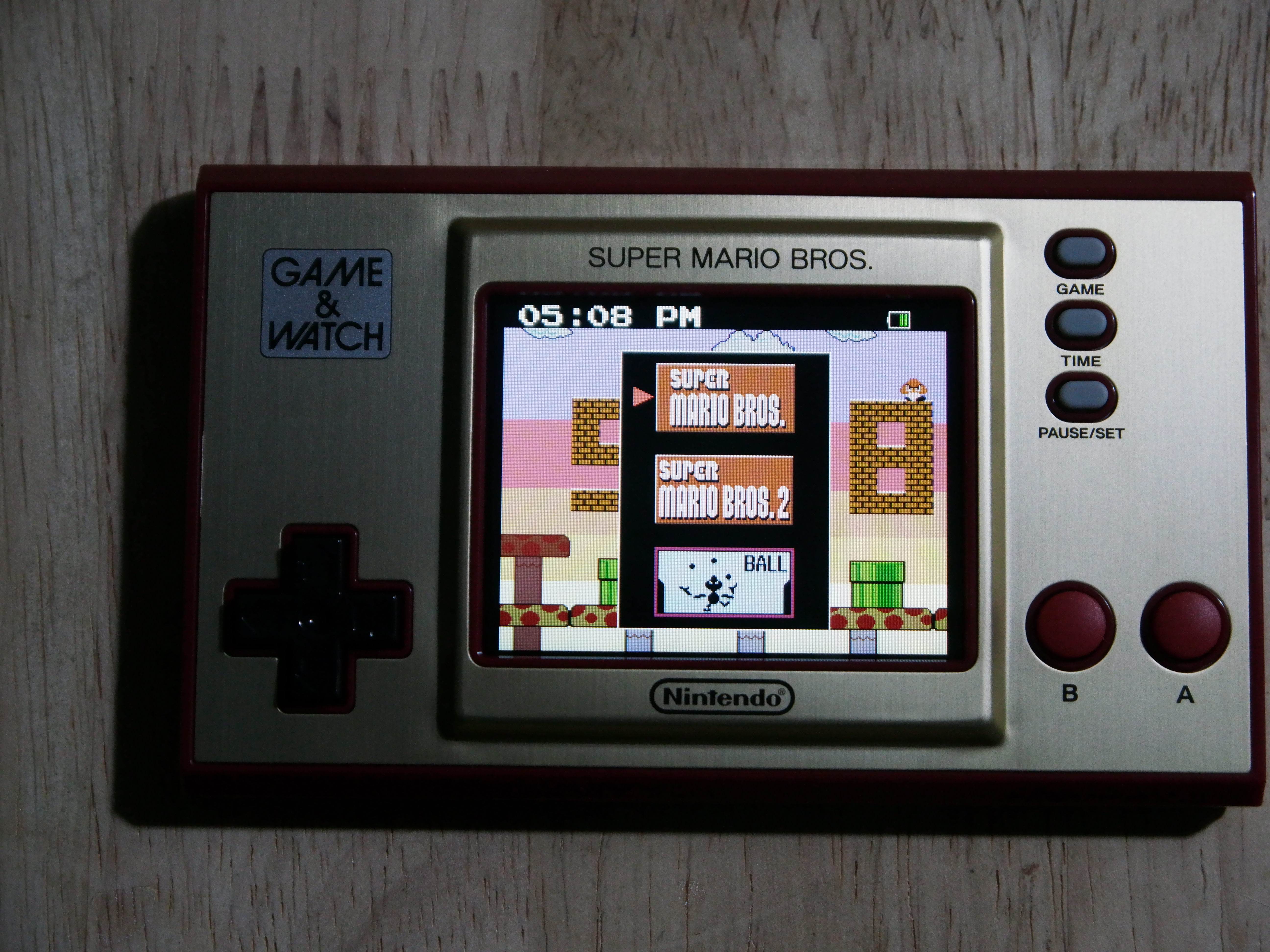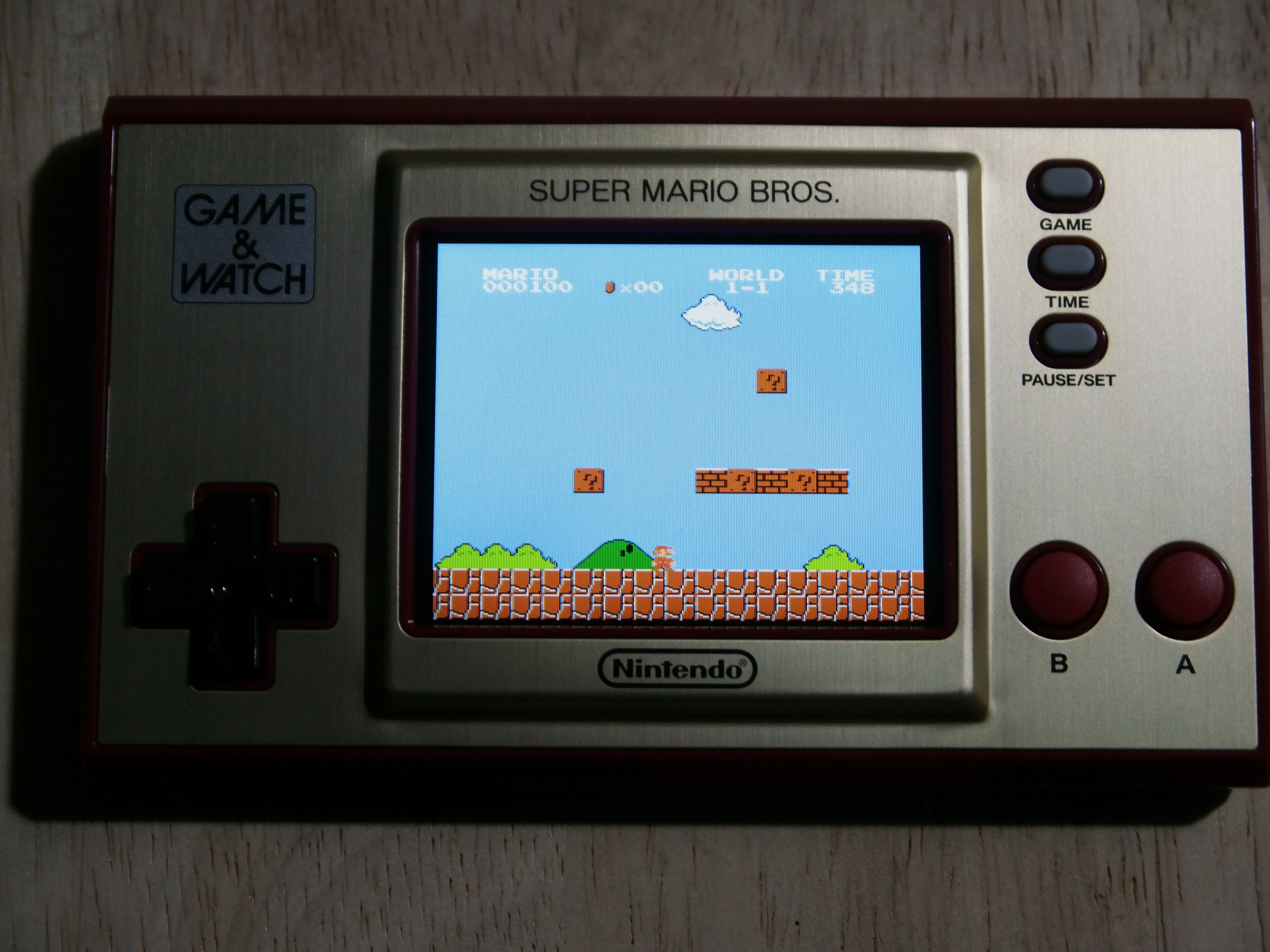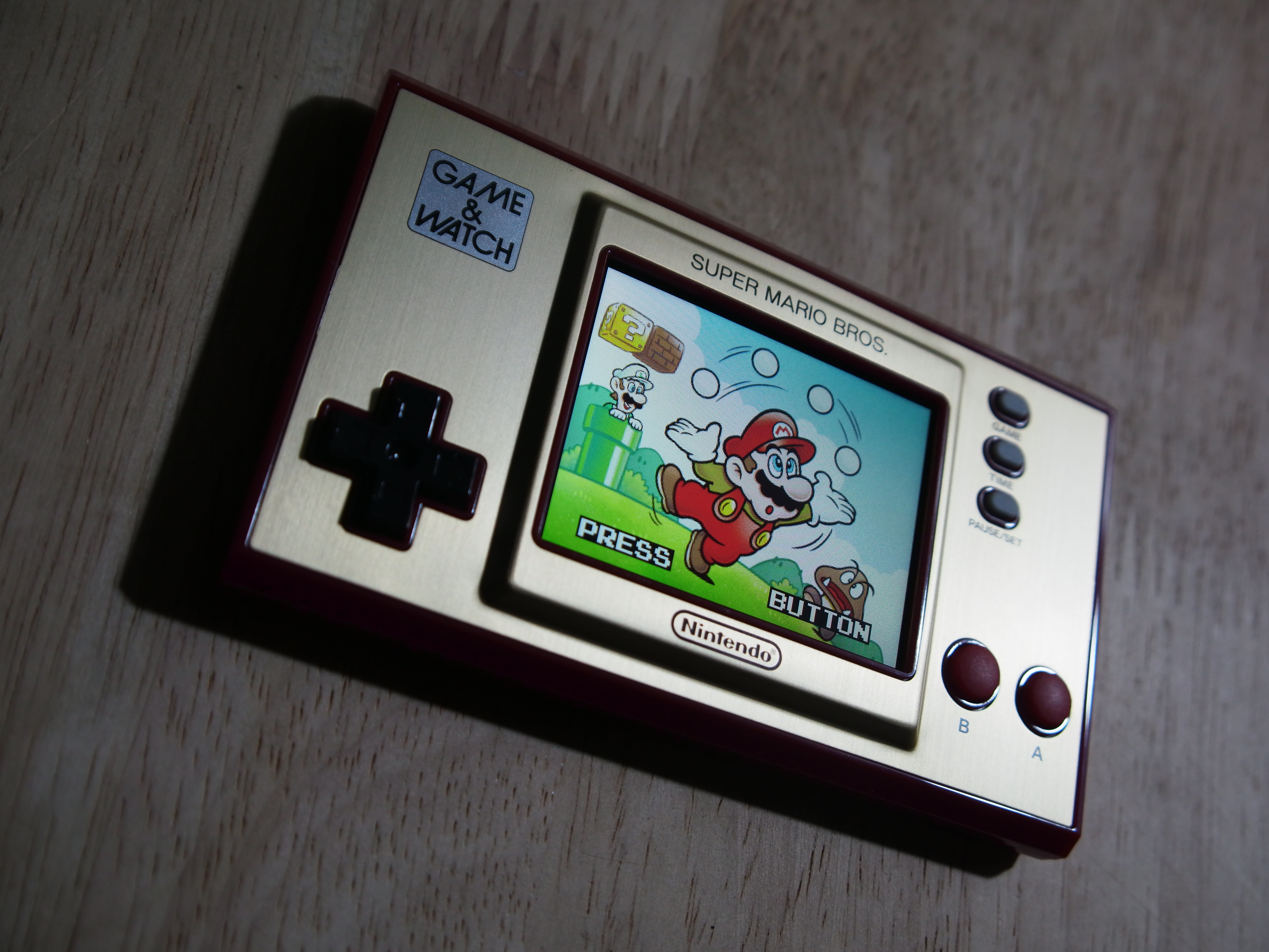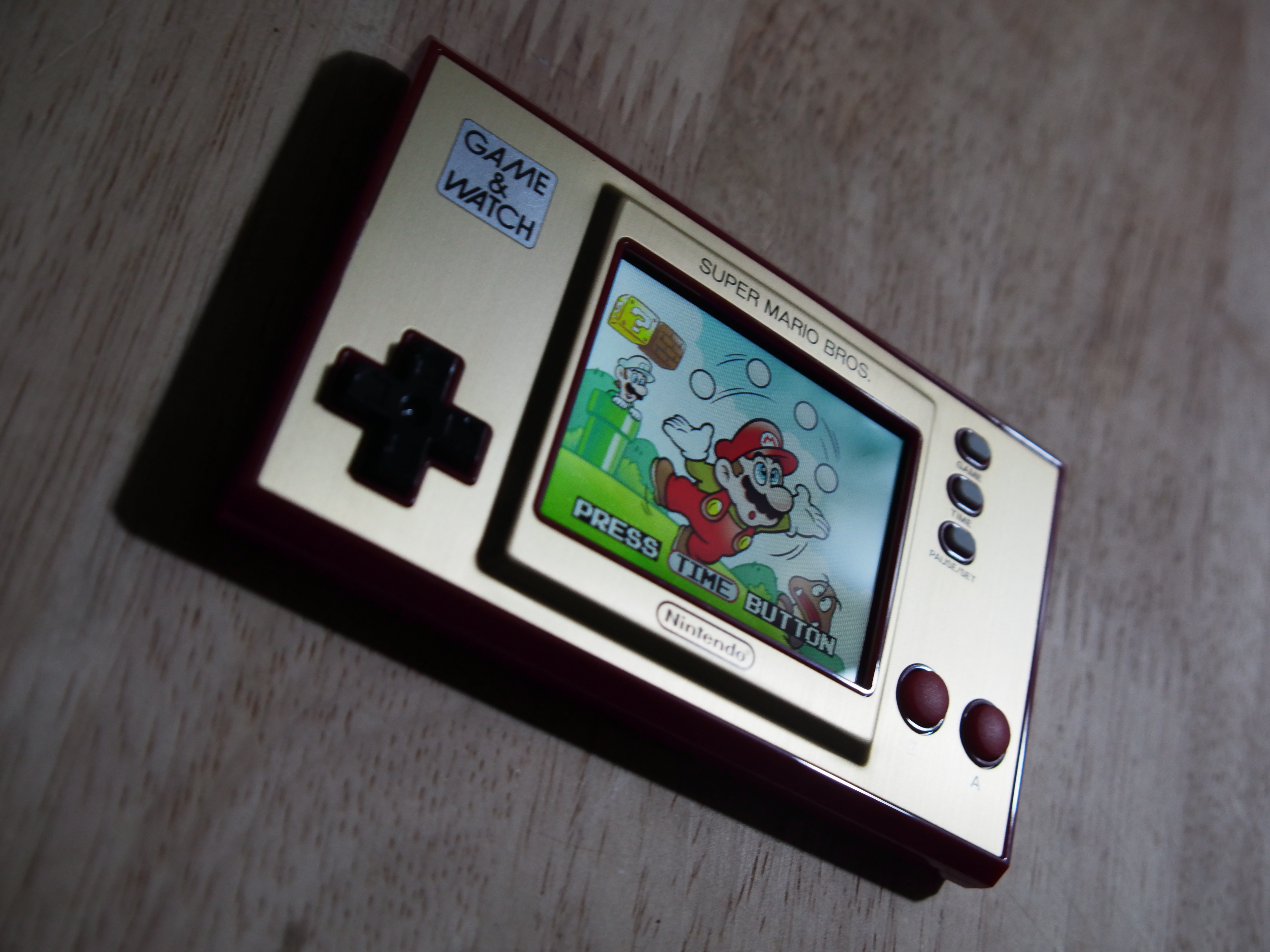 Bei den Knöpfen ist der Game & Watch minimalistisch: Es gibt ein Steuerkreuz, zwei Eingabe-Tasten und drei für Optionen. Das ergibt Sinn, denn für Super Mario Bros. sind auch nicht mehr Tasten nötig. Das Digikreuz ist erstklassig und reagiert einwandfrei auf unsere Eingaben. Die Haptik ist sehr gut, weil es einen gut ertastbaren Druckpunkt gibt. Bei den Handhelds und Controllern von Nintendo gab es mit dem Digikreuz eigentlich selten Probleme, weshalb uns das nicht wundert. Bei den A- und B-Tasten ist aber etwas Eingewöhnung nötig: Sie sind ebenfalls gut verarbeitet und auch hier ist der Druckpunkt leicht zu spüren. Aber sie fühlen sich im Vergleich zu modernen Tasten weicher und eine Spur schwammiger an. Nach einer Zeit konnten wir aber Mario problemlos damit steuern. Menschen mit sehr großen Händen werden aber Schwierigkeiten haben und eventuell versehentlich beide Tasten gleichzeitig drücken. Da die Knöpfe recht weit unten am Gerät liegen, sind die Handballen beim Spielen frei und man hält den Handheld quasi nur mit seinen Fingern fest. Da das ganze Teil nur ungefähr 150 Gramm wiegt, ist das prinzipiell kein Problem, nur etwas gewöhnungsbedürftig.