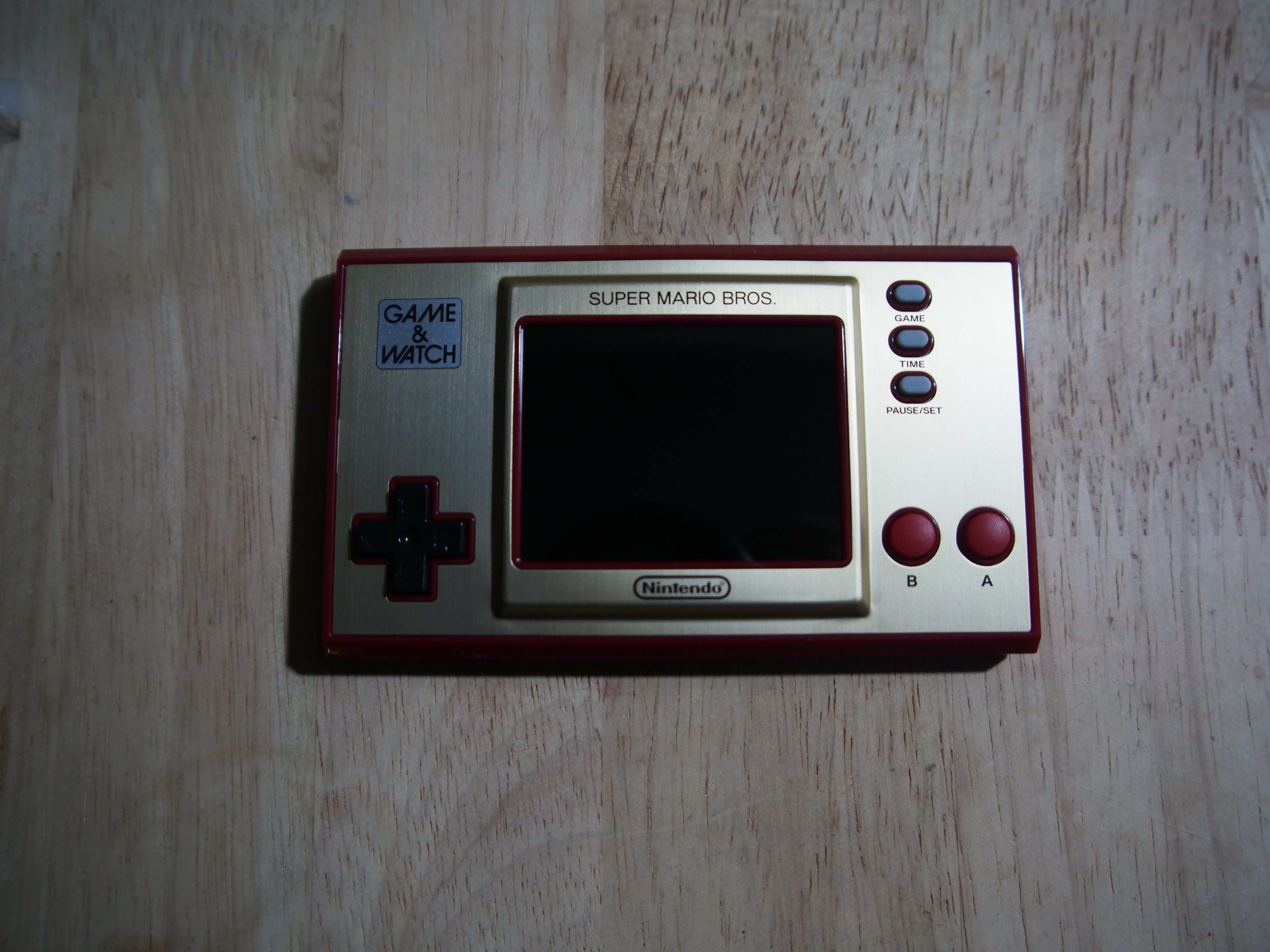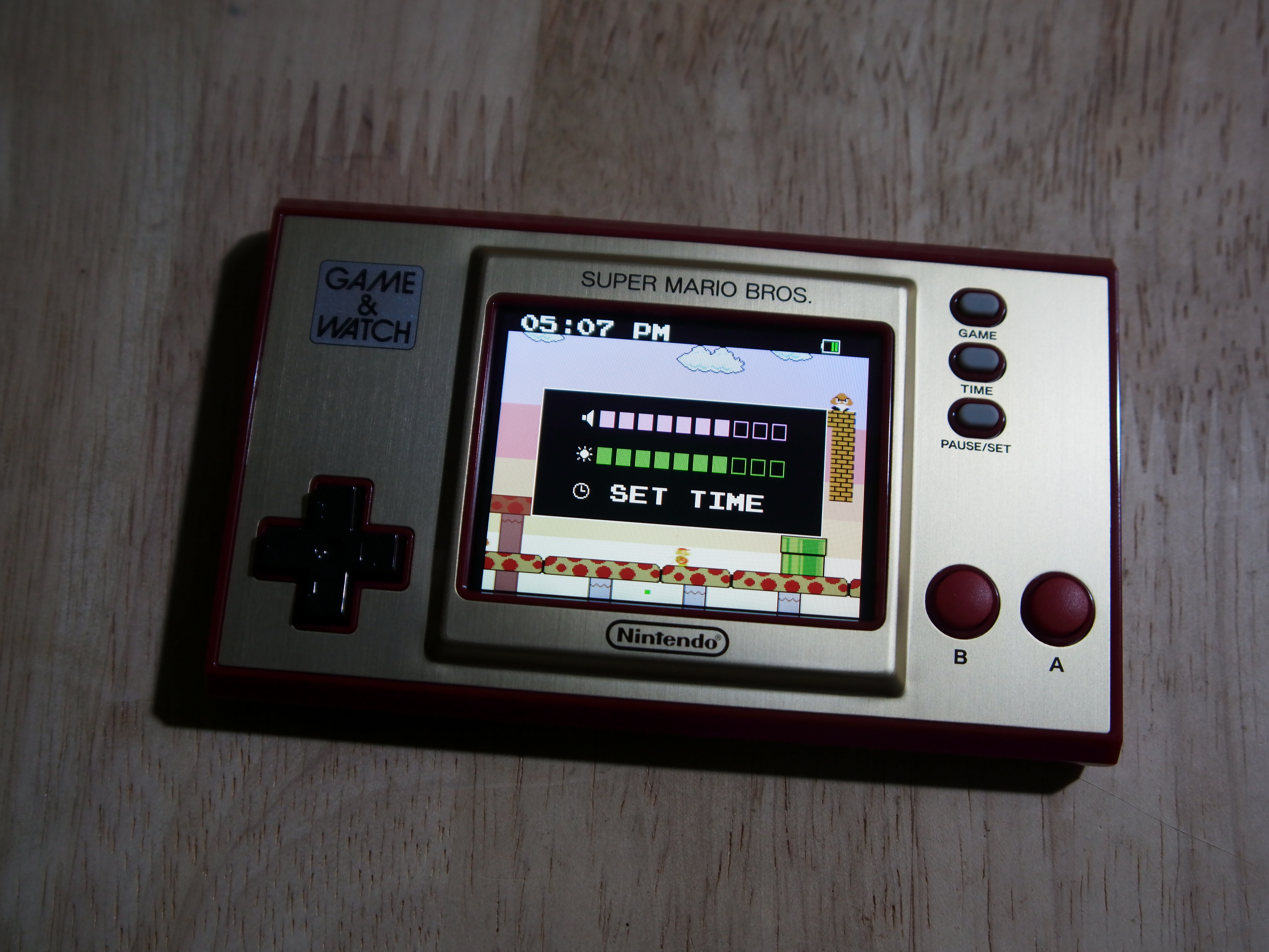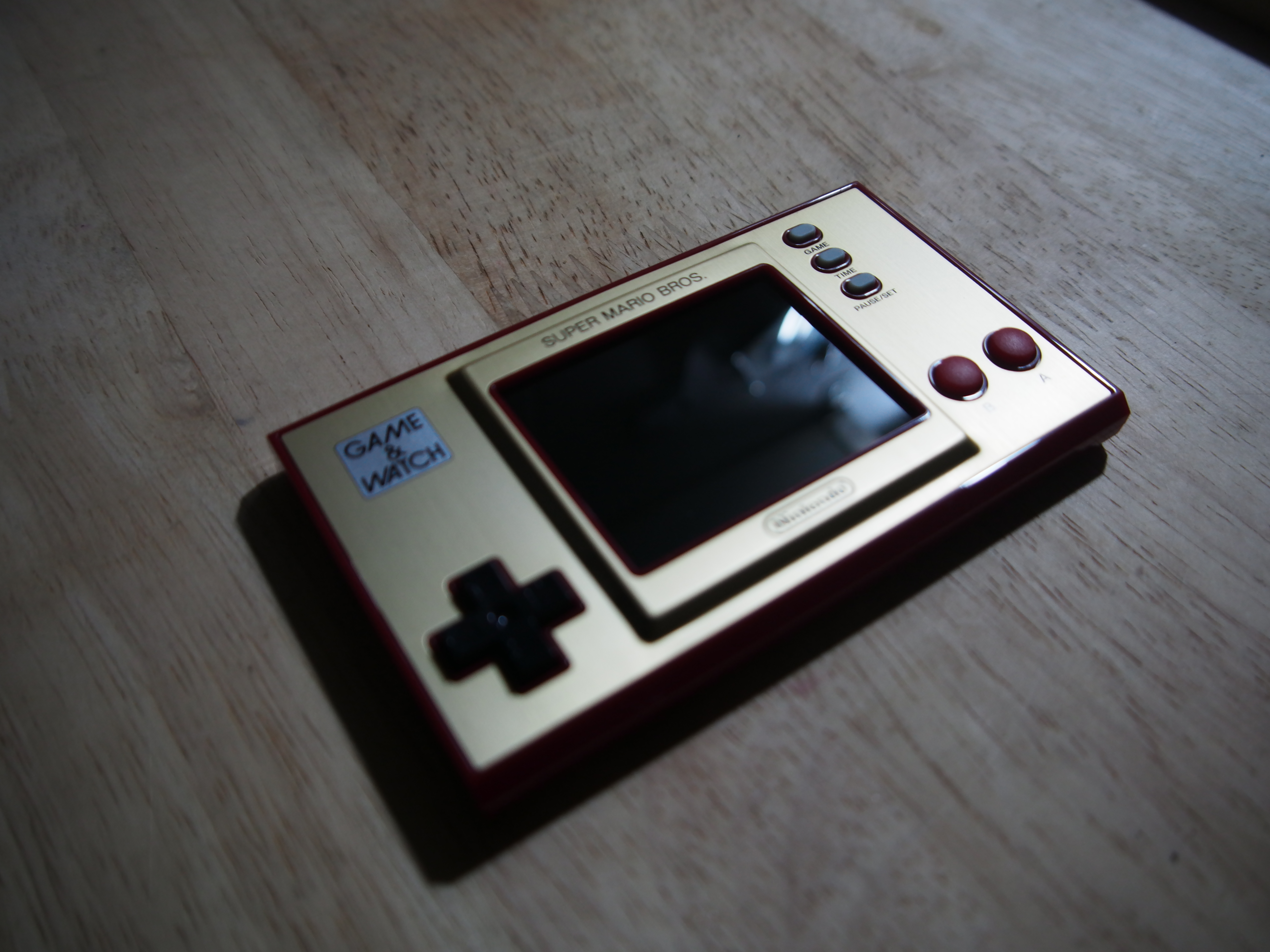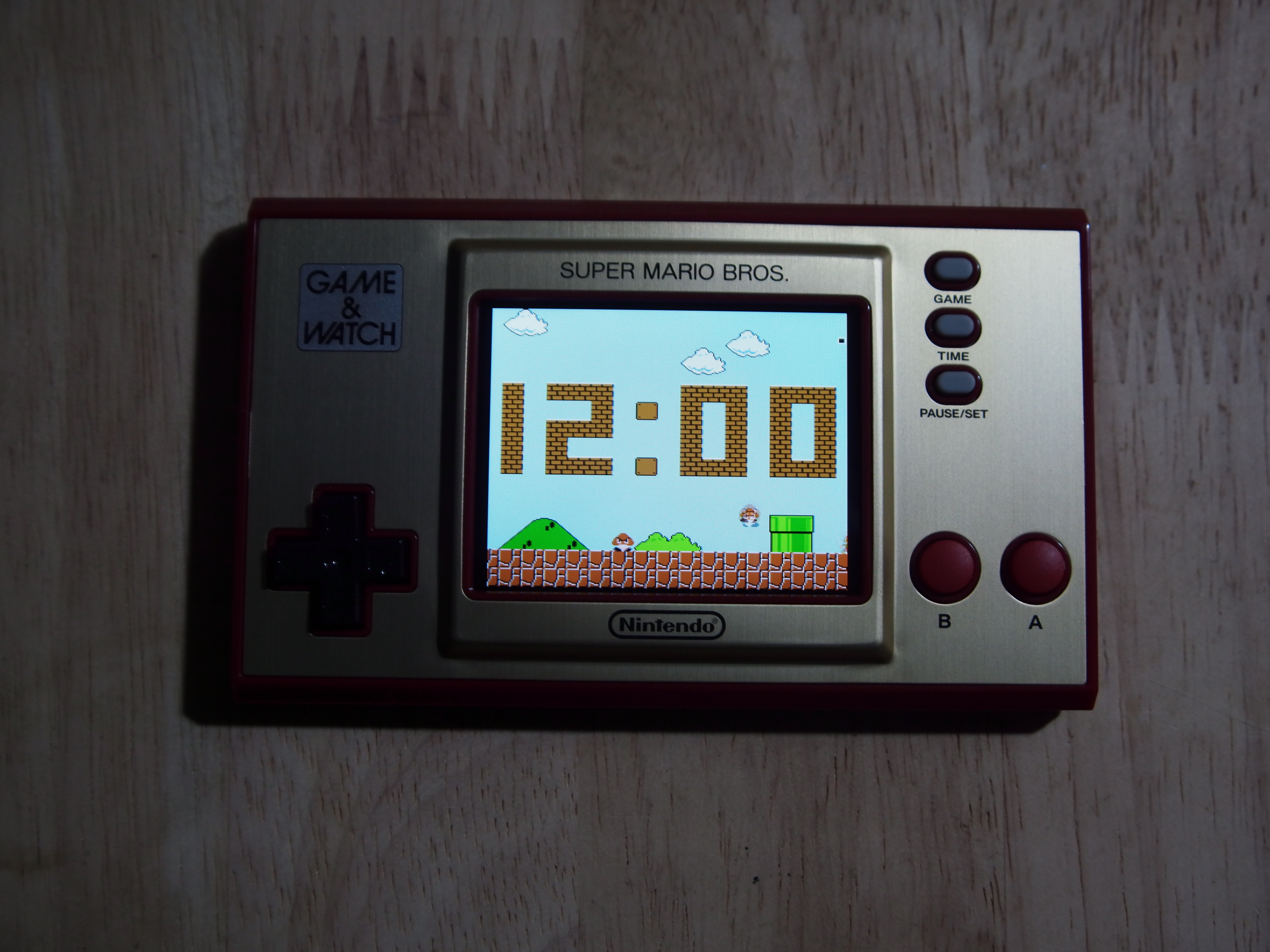 Bei den Knöpfen ist der Game & Watch minimalistisch: Es gibt ein Steuerkreuz, zwei Eingabe-Tasten und drei für Optionen. Das ergibt Sinn, denn für Super Mario Bros. sind auch nicht mehr Tasten nötig. Das Digikreuz ist erstklassig und reagiert einwandfrei auf unsere Eingaben. Die Haptik ist sehr gut, weil es einen gut ertastbaren Druckpunkt gibt. Bei den Handhelds und Controllern von Nintendo gab es mit dem Digikreuz eigentlich selten Probleme, weshalb uns das nicht wundert. Bei den A- und B-Tasten ist aber etwas Eingewöhnung nötig: Sie sind ebenfalls gut verarbeitet und auch hier ist der Druckpunkt leicht zu spüren. Aber sie fühlen sich im Vergleich zu modernen Tasten weicher und eine Spur schwammiger an. Nach einer Zeit konnten wir aber Mario problemlos damit steuern. Menschen mit sehr großen Händen werden aber Schwierigkeiten haben und eventuell versehentlich beide Tasten gleichzeitig drücken. Da die Knöpfe recht weit unten am Gerät liegen, sind die Handballen beim Spielen frei und man hält den Handheld quasi nur mit seinen Fingern fest. Da das ganze Teil nur ungefähr 150 Gramm wiegt, ist das prinzipiell kein Problem, nur etwas gewöhnungsbedürftig.