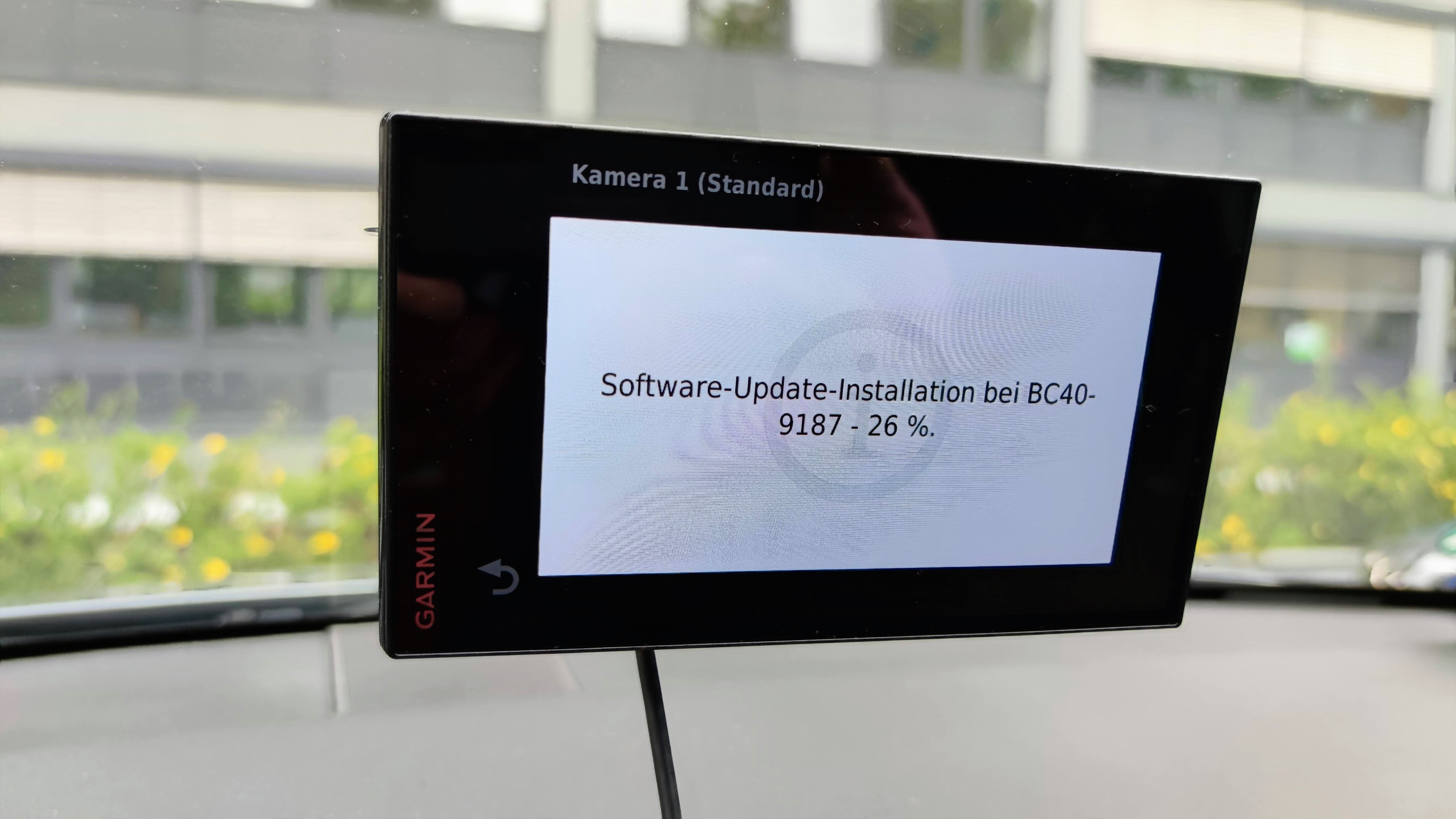 Sollten die zwei Minuten vergangen sein, bevor die Kopplung erfolgreich war, muss man die Batterien aus der Kamera wieder herausnehmen und erneut einsetzen. Das ist leider etwas umständlich. Ein Ein-/Ausschalter sowie ein Knopf für die Kopplung per Funk hätten uns besser gefallen. Glücklicherweise kann man die Kamera ohne Mühen aus der Halterung herausnehmen, was den Batteriewechsel vereinfacht. Nach einem Update der Firmware steht die der Garmin BC 40 dann im Navi zur Verfügung.