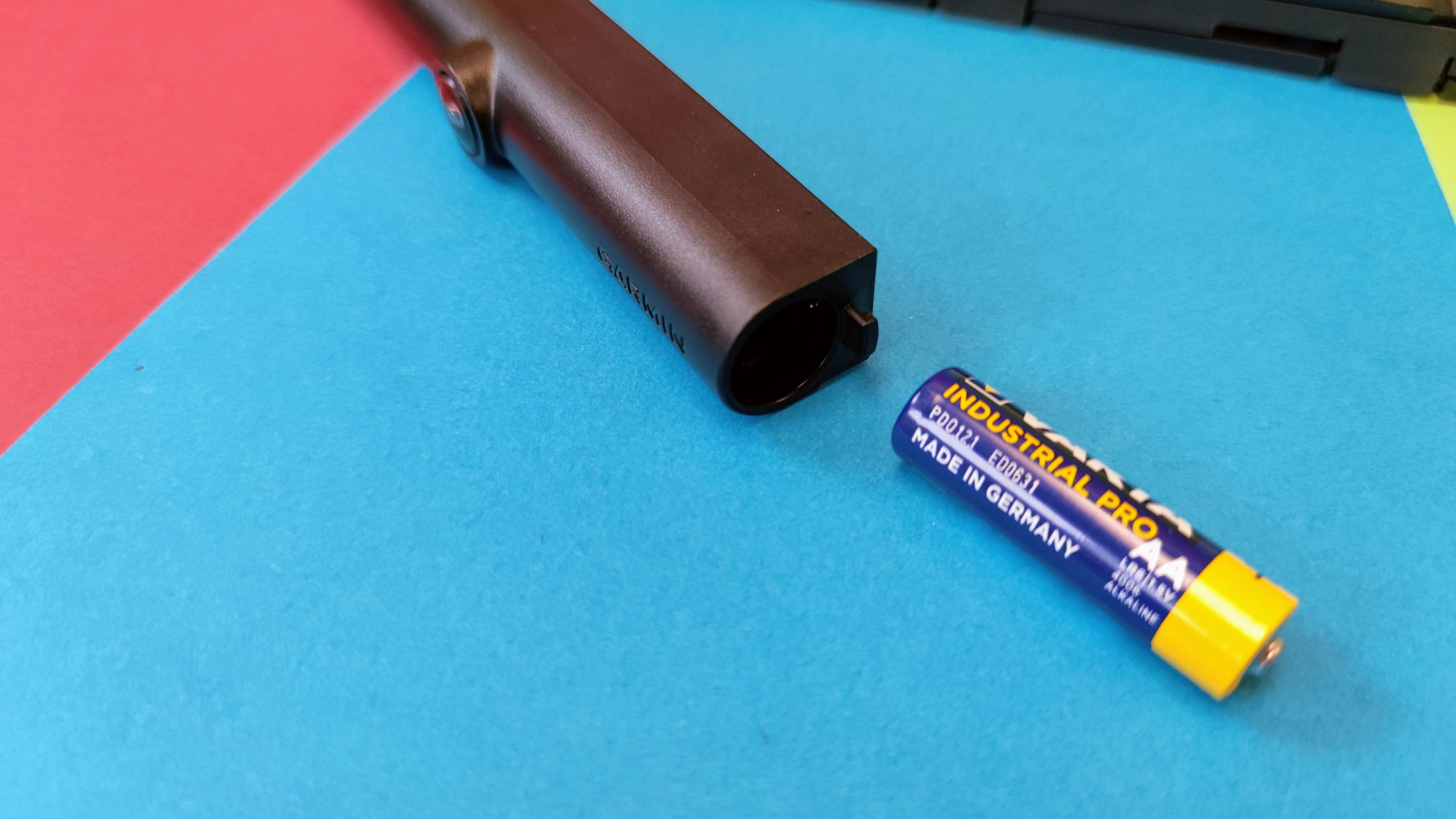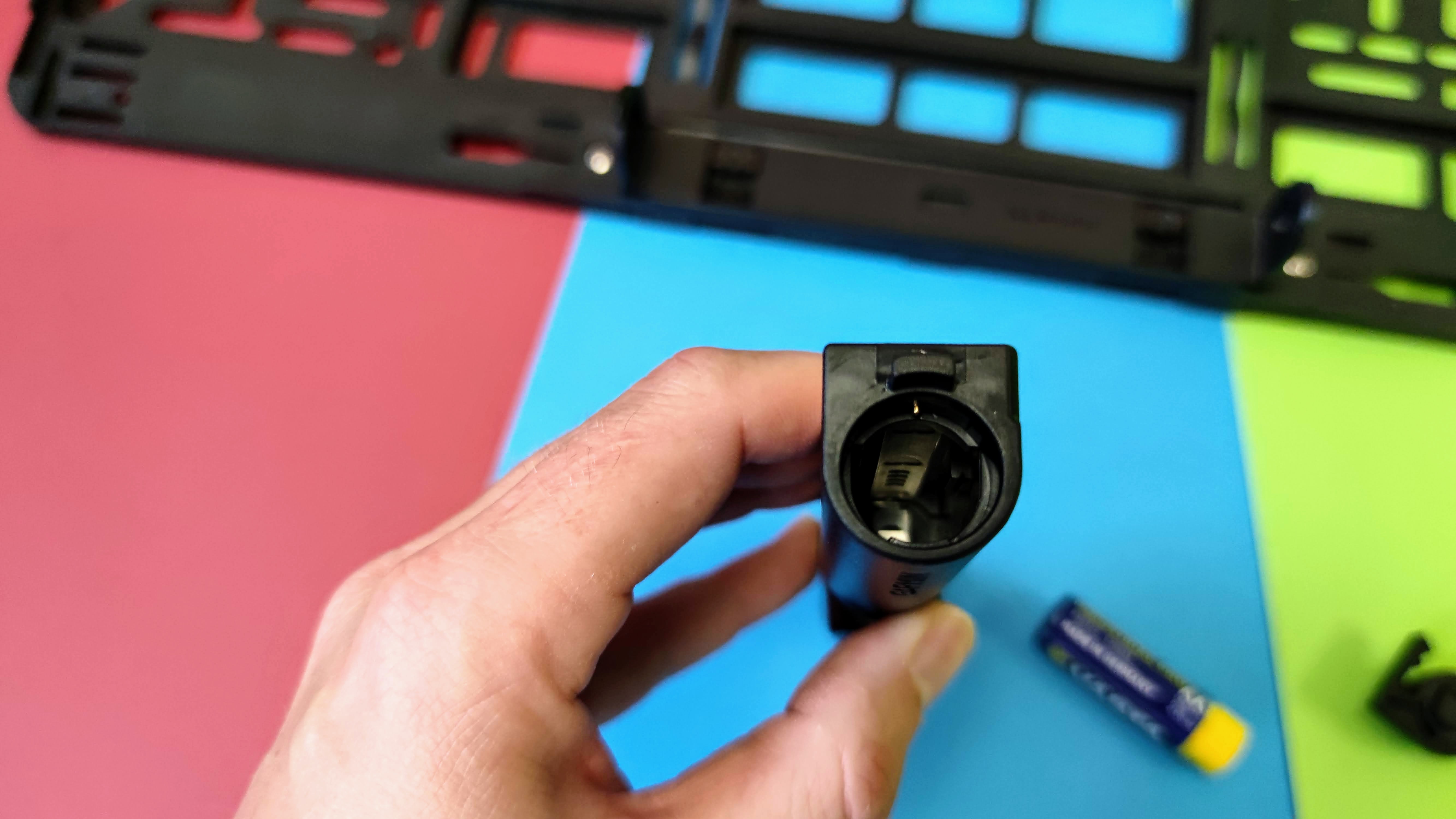 Die Garmin BC 40 Wireless Rückfahrkamera befindet sich in einem länglichen, etwas mehr als fingerbreiten zylinderförmigen Behälter aus Kunststoff. Das Kamerasystem klemmt man ans untere Ende der mitgelieferten Kunststoff-Halterung für das Kfz-Kennzeichen. Für den Betrieb braucht die Garmin BC 40 jeweils zwei AA-Batterien – diese gehören nicht zum Lieferumfang.