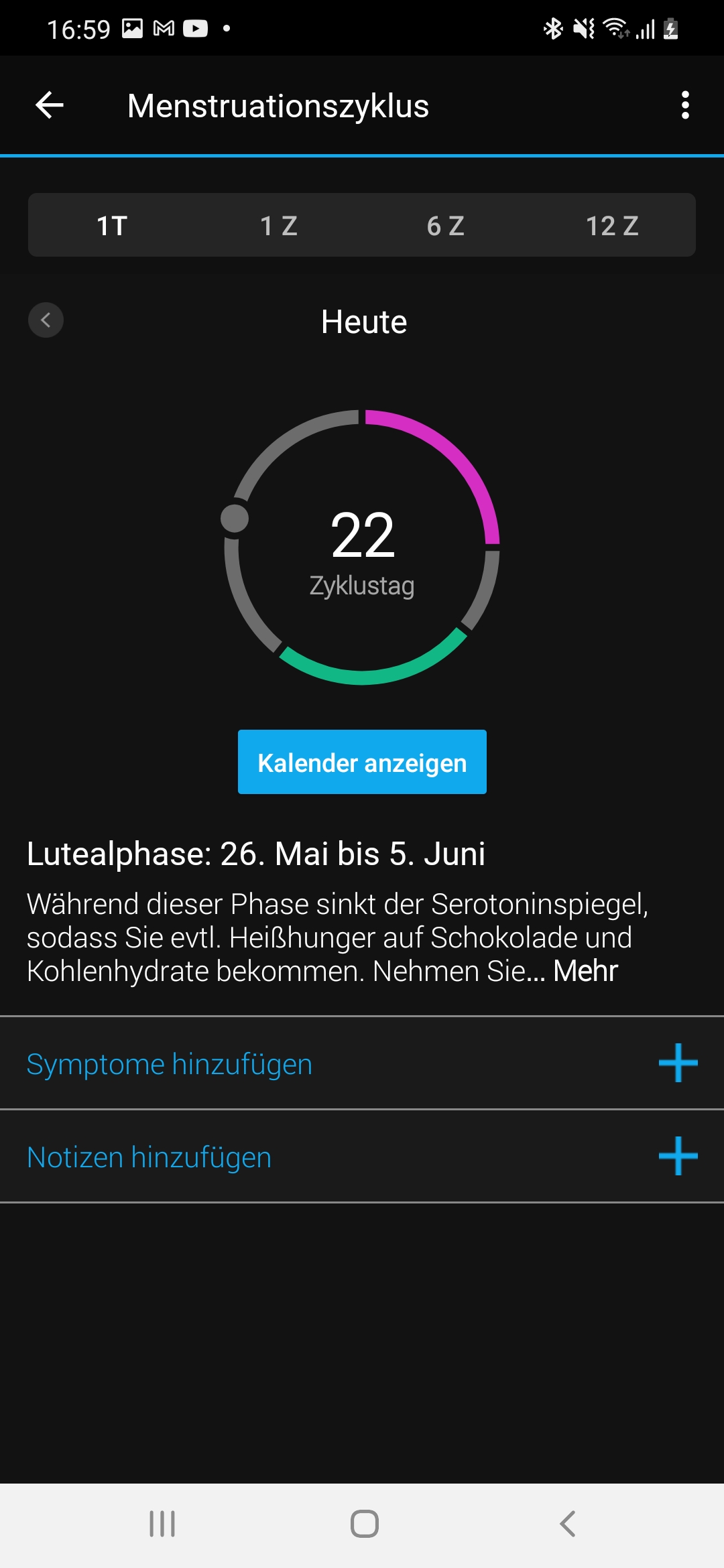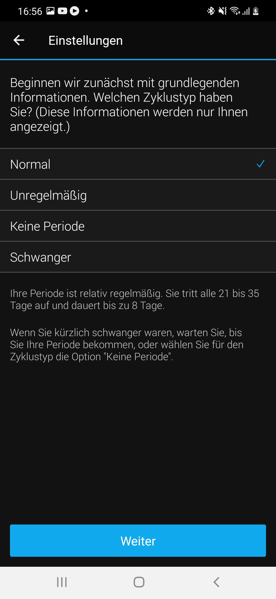 Für Frauen gibt es schließlich noch einen Menstruationszyklus-Tracker, der den weiblichen Zyklus oder eine Schwangerschaft aufzeichnen kann. Um diese Funktion nutzen zu können, müssen wir sie zuerst über die App einrichten. Die App fragt ein paar Informationen wie den Zyklustyp, den Beginn der vergangenen Periode, die gewöhnliche Dauer der Periode und des Zyklus und hormonelle Verhütungsmethoden. Haben wir alle Einstellungen vorgenommen, können wir den aktuellen Zyklustag in der App einsehen und Symptome oder Notizen hinzufügen. Die App informiert uns außerdem über mögliche Auswirkungen der jeweiligen Zyklusphase, sodass wir bestimmte Symptome besser einordnen können. Die Funktion kann für Frauen, die Probleme mit ihrem Zyklus haben, durchaus hilfreich sein. Allerdings reichen die Möglichkeiten der App nicht aus, um sie etwa für die NFP-Methode zu nutzen.