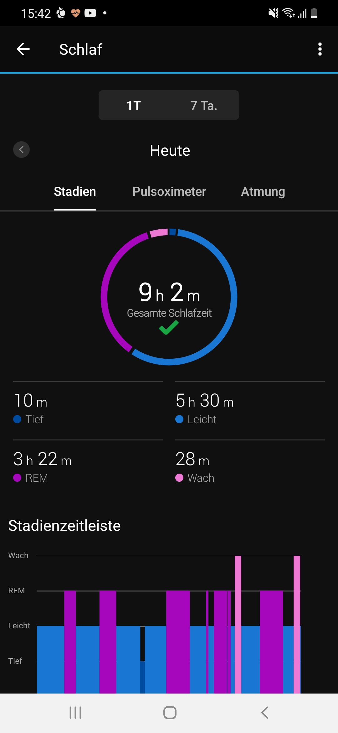 Die App bereitet diese Daten und den Sleep Score dann übersichtlich in einer Grafik auf. Daran können wir ablesen, wie lange welche Schlafphase gedauert hat und wann wir eingeschlafen beziehungsweise aufgewacht sind. Der Sleep Score setzt sich zusammen aus den Faktoren Schlafdauer, Stress, Tiefschlaf, Leichter Schlaf, REM Schlaf, Wachzeit und Unruhe. Er bewertet unseren Schlaf auf einer Skala von 1 bis 100 – je höher der Wert, desto besser unser Schlaf. Außerdem gibt die App eine Empfehlung zur Verbesserung der Schlafqualität. Haben wir beispielsweise lange, aber leicht geschlafen und eine kurze Tiefschlafphase hinter uns, bekommen wir den Hinweis, mit einem heißen Bad den Tiefschlaf zu fördern.