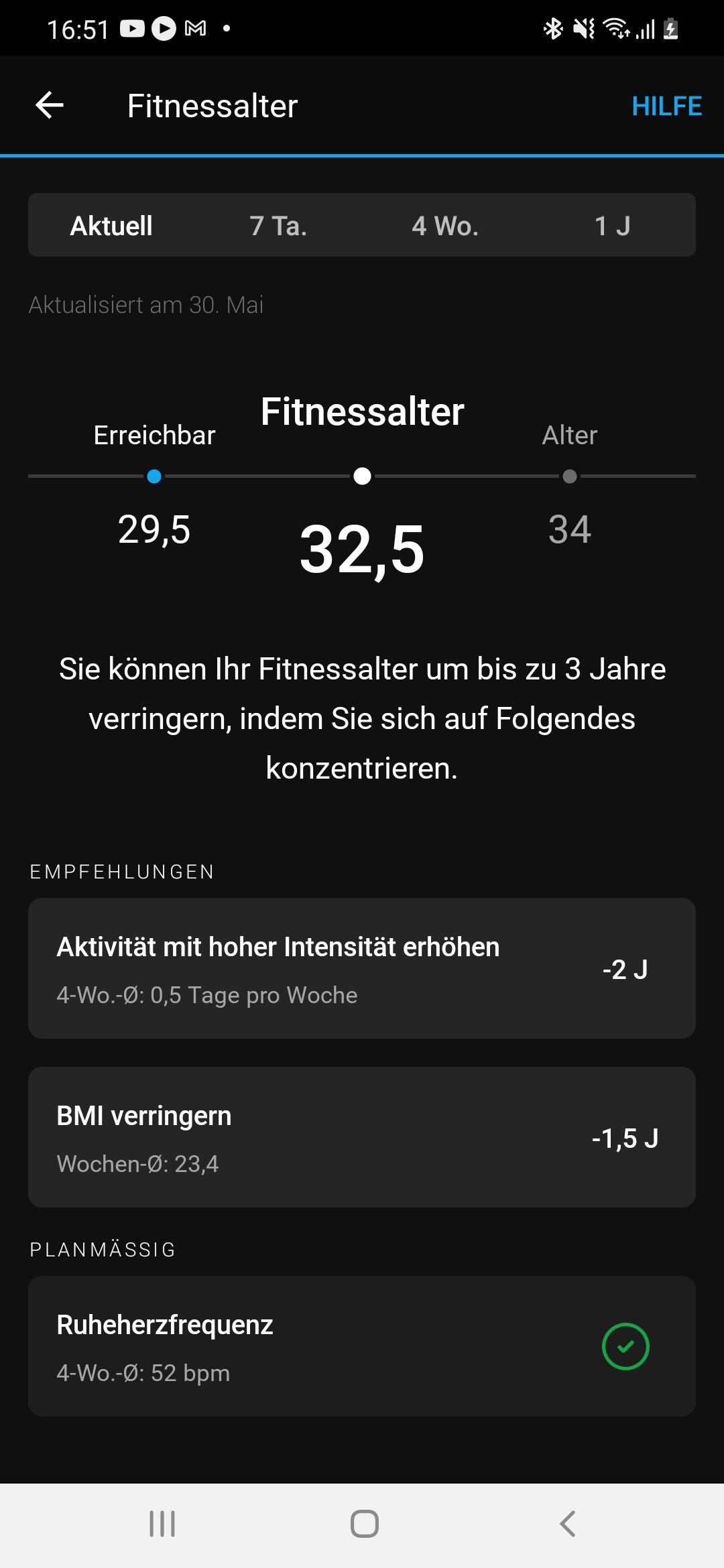 Wer die Venu 2 regelmäßig zum Training nutzt, kann das eigene Fitness-Alter berechnen lassen. Dazu bewertet die Uhr den eigenen Fitnesslevel anhand des chronologischen Alters, der wöchentlichen Aktivität unter hoher Intensität, des angegebenen BMIs oder Körperfettlevels und des Ruhepuls. Der Vorteil dieser Funktion besteht darin, dass uns die Garmin Connect-App konkrete Vorschläge macht, wie wir unser Fitness-Alter verbessern können. Die App zeigt dabei auch an, welches Fitnessalter realistisch für uns erreichbar ist.