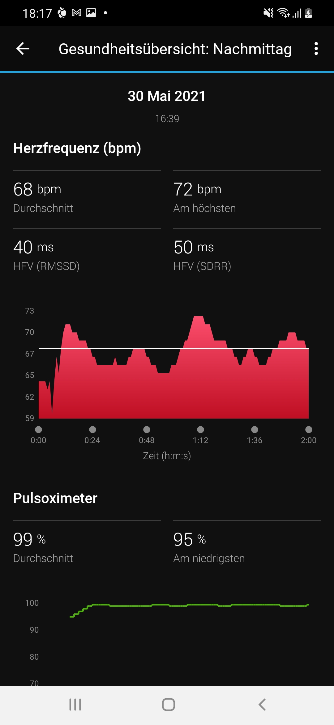 Obwohl die Garmin Venu 2 über diverse Smartwatch-Funktionen verfügt (siehe dazu weiter unten), liegt der Fokus der Uhr auf dem Aktivitätstracking und der Überwachung von Gesundheitswerten. Die Venu 2 besitzt dazu diverse Features, zum Beispiel die sogenannte Health Snapshot-Funktion. Damit können wir über eine Dauer von zwei Minuten die Herzfrequenz, die Herzfrequenzvariabilität, die Blutsauerstoffsättigung, die Atemfrequenz und den eigenen Stresslevel messen. Anschließend wird die Messung als Aktivität in der Garmin Connect App gespeichert. Leider gibt uns die Uhr keine konkrete Bewertung des Ergebnisses, sodass wir die Werte selber interpretieren müssen. Wer die Funktion aber regelmäßig nutzt, kann von der Möglichkeit profitieren, die Werte über einen längeren Zeitraum vergleichen zu können.