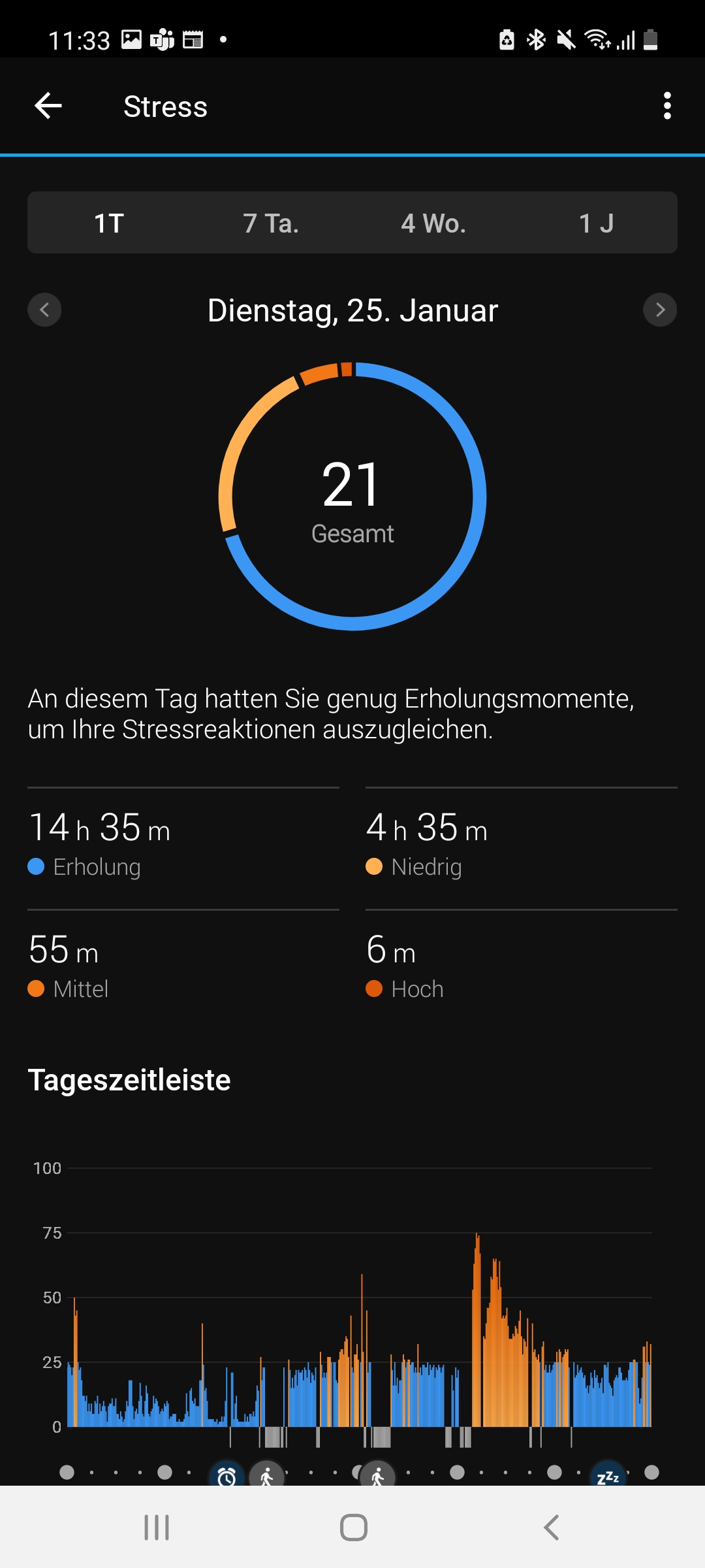 Beim Aktivitäts-Tracking unterscheidet sich die Garmin Venu 2 Plus nicht von der Garmin Venu 2 – Vor- und Nachteile bleiben dieselben. Die Uhr punktet mit diversen Zusatzfunktionen, wie etwa dem sogenannten Health Snapshot, mit dem wir eine Momentaufnahme unserer Herzfrequenz, Herzfrequenzvariabilität, Blutsauerstoffsättigung, Atemfrequenz und unseres Stresslevels speichern können. Auch die Möglichkeit, über das Display der Venu 2 Plus eine Atemübung zur Stressreduzierung zu starten, ist wieder mit an Bord. Wie schon beim Standardmodell handelt es sich bei diesen Features aber eher um nette Extras als wirklich nützliche Hilfsmittel – echte Entspannung kam bei uns im Test mit der Atemübung jedenfalls nicht auf.