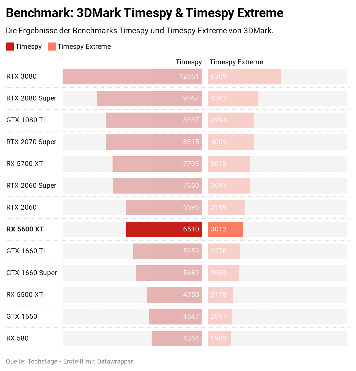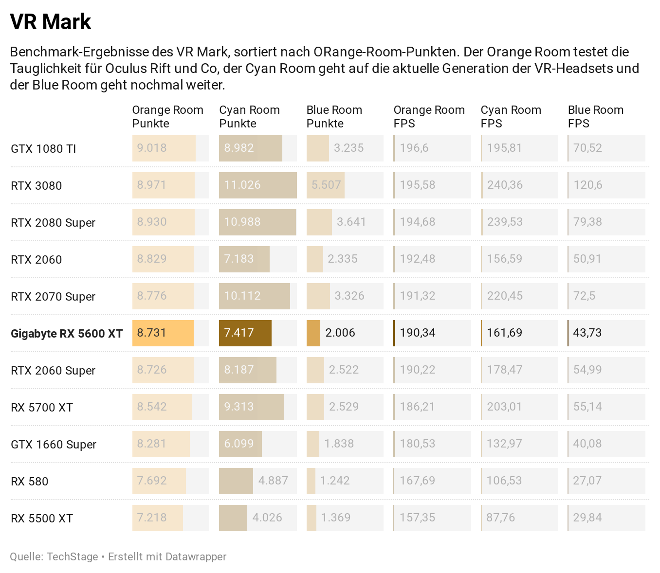 Kommen wir zu den relevanten Punkten: Wo ordnet sich die Grafikkarte ein? In den synthetischen Benchmarks 3DMark und VRMark wird klar, dass die Karte gut im Mittelfeld unterwegs ist. Sie schlägt die meisten Nvidia-Karten ohne RTX und kommt auch der RTX 2060 oder der RTX 2060 Super gefährlich nahe.
