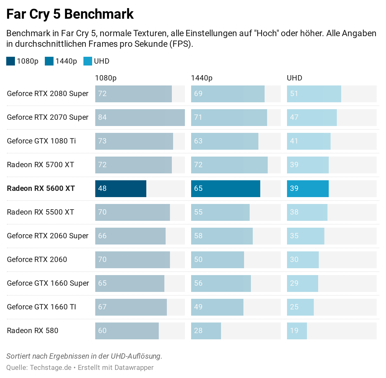 Bei den Spielen hatten wir dagegen einen etwas seltsamen fps-Einbruch bei Far Cry 5, hier war die Karte bei Full-HD deutlich schlechter als bei 1440p, normalerweise sollte es umgekehrt sein. Da wir die Zahl aber in mehreren Durchläufen bestätigen konnten, gehen wir hier davon aus, dass die CPU (Core i5-8400 mit sechs Kernen und bis zu 3,2 GHz) etwas limitiert. Mehr dazu im c’t-Artikel „Spiele als Kernanliegen ”.