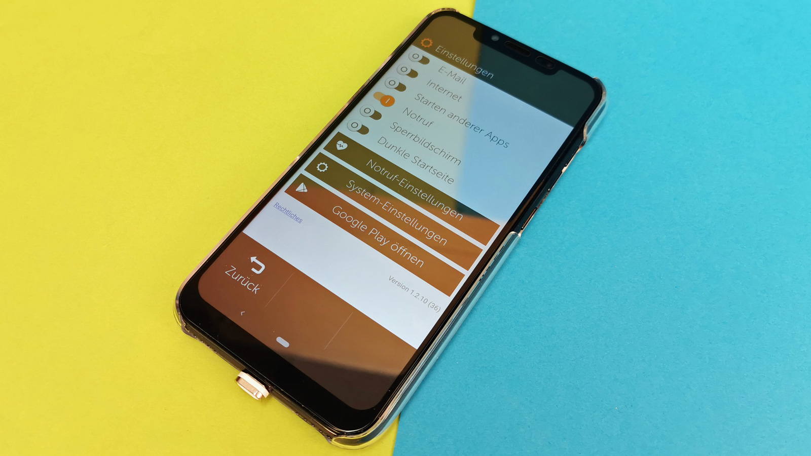 Über die ebenfalls sehr große Menütaste gibt es Zugriff auf ein vereinfachtes Menü. Hier dürfen Nutzer mittels virtueller Schalter die Funktionen Email, Internet, Starten anderer Apps, Notruf und den Sperrbildschirm an- oder abschalten. So lässt sich das Funktionsangebot beschränken und die Bedienung des Smartphones weiter vereinfachen. Auch eine Art Darkmode für den Hauptbildschirm stellt Gigaset dem Nutzer zur Verfügung – wobei das mangels OLED-Displays ausschließlich optische Änderungen, aber keine Stromersparnis bringen dürfte. Außerdem lassen sich in diesem vereinfachten Menü auch die Notrufeinstellungen bearbeiten. Bei einem längeren Druck auf die Notruftaste wird dann der erste eingetragene Kontakt oder die Notrufzentrale der Feuerwehr direkt angerufen, weitere Kontakte stehen zusätzlich zur Wahl. Außerdem darf eine weitere Liste mit Kontakten erstellt werden, die allesamt eine SMS mit – sofern verfügbar – Link zur Kartenansicht des Aufenthaltsortes des Nutzers erhalten.