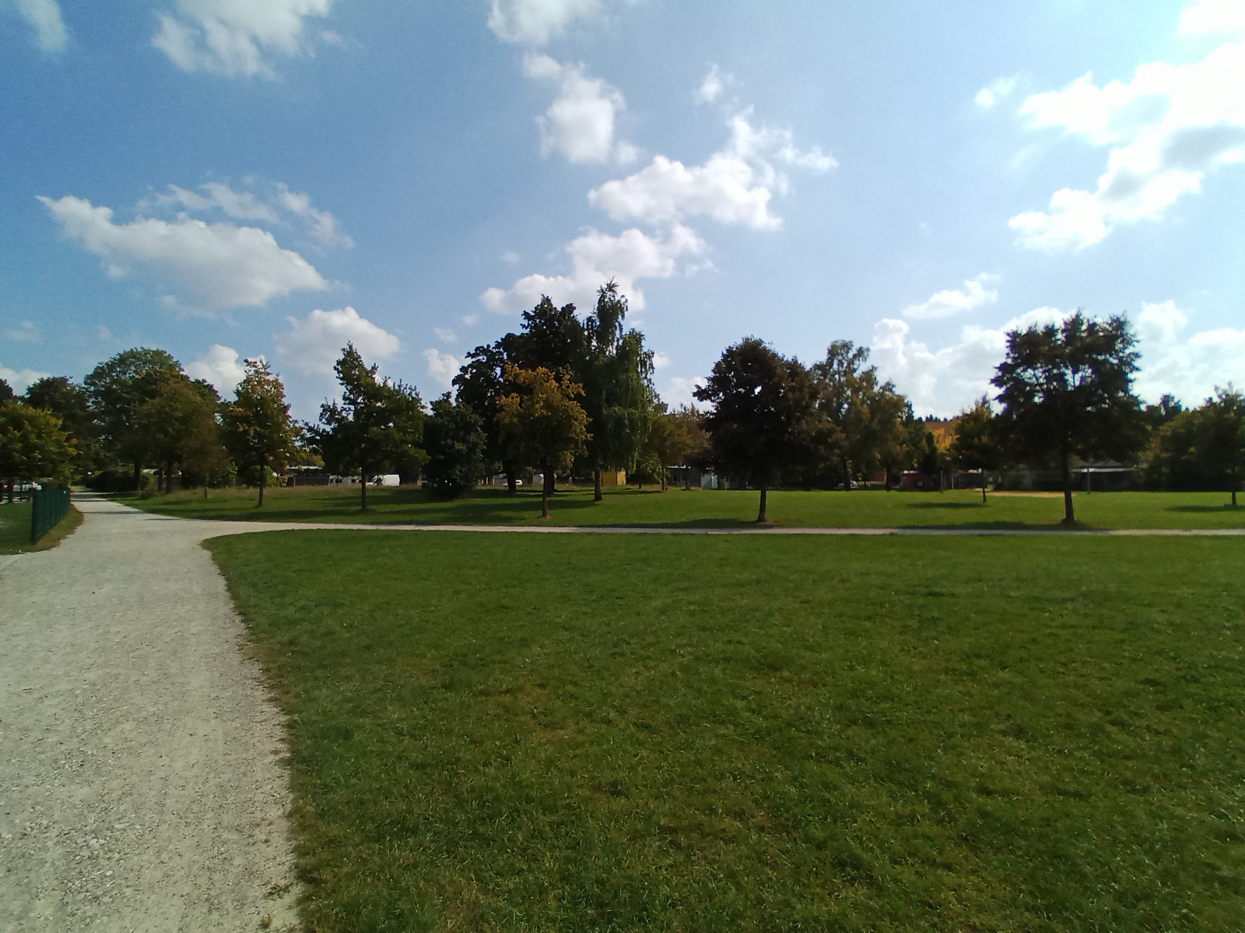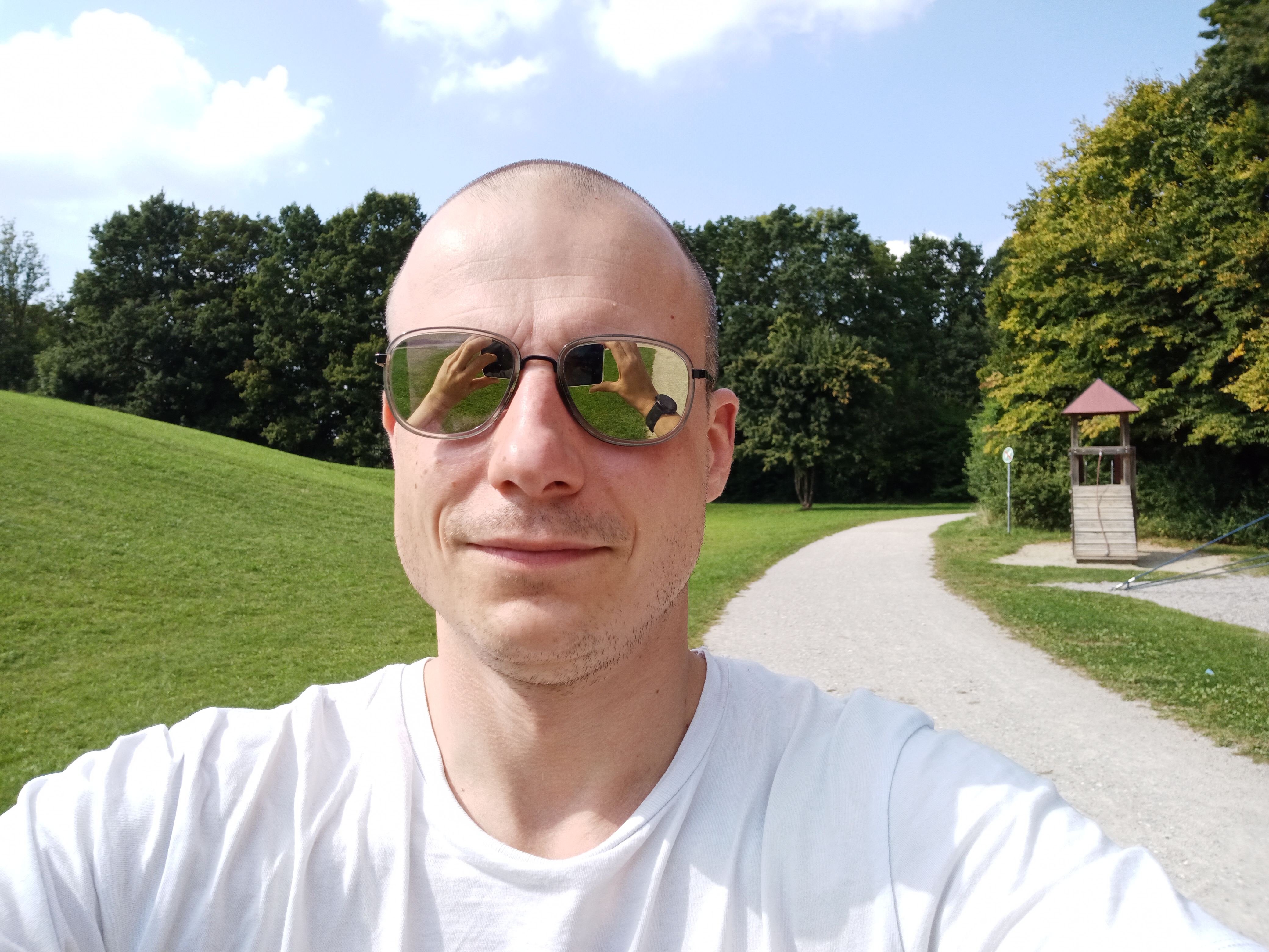 Tatsächlich finden sich bei der Kamera-App keine Anpassungen bei der Benutzeroberfläche. Auch die Ausstattung der Dreifachkamera ist identisch mit dem „gewöhnlichen“ Gigaset GS4 (Testbericht): Eine Hauptkamera mit f/1.8-Blende und 16 Megapixel, ein Weitwinkel-Objektiv mit 5 Megapixel und f/2.4 sowie ein Makro-Objektiv mit 2 Megapixel f/2.4-Blende. Bei hellem Tageslicht gelingen damit gute und scharfe Aufnahmen. Die Bilddynamik und die Farben wirken jedoch etwas zu blass und kraftlos, ein leichter Grauschleier fällt zudem auf. Wie Verzerrungen bei der Weitwinkelkamera fallen zwar minimal aus, dafür gehen Bilddetails verloren. Das Makro-Objektiv ist mit seinen 2 Megapixel zu vernachlässigen und eher eine Spielerei, die man vielleicht einmal ausprobiert.