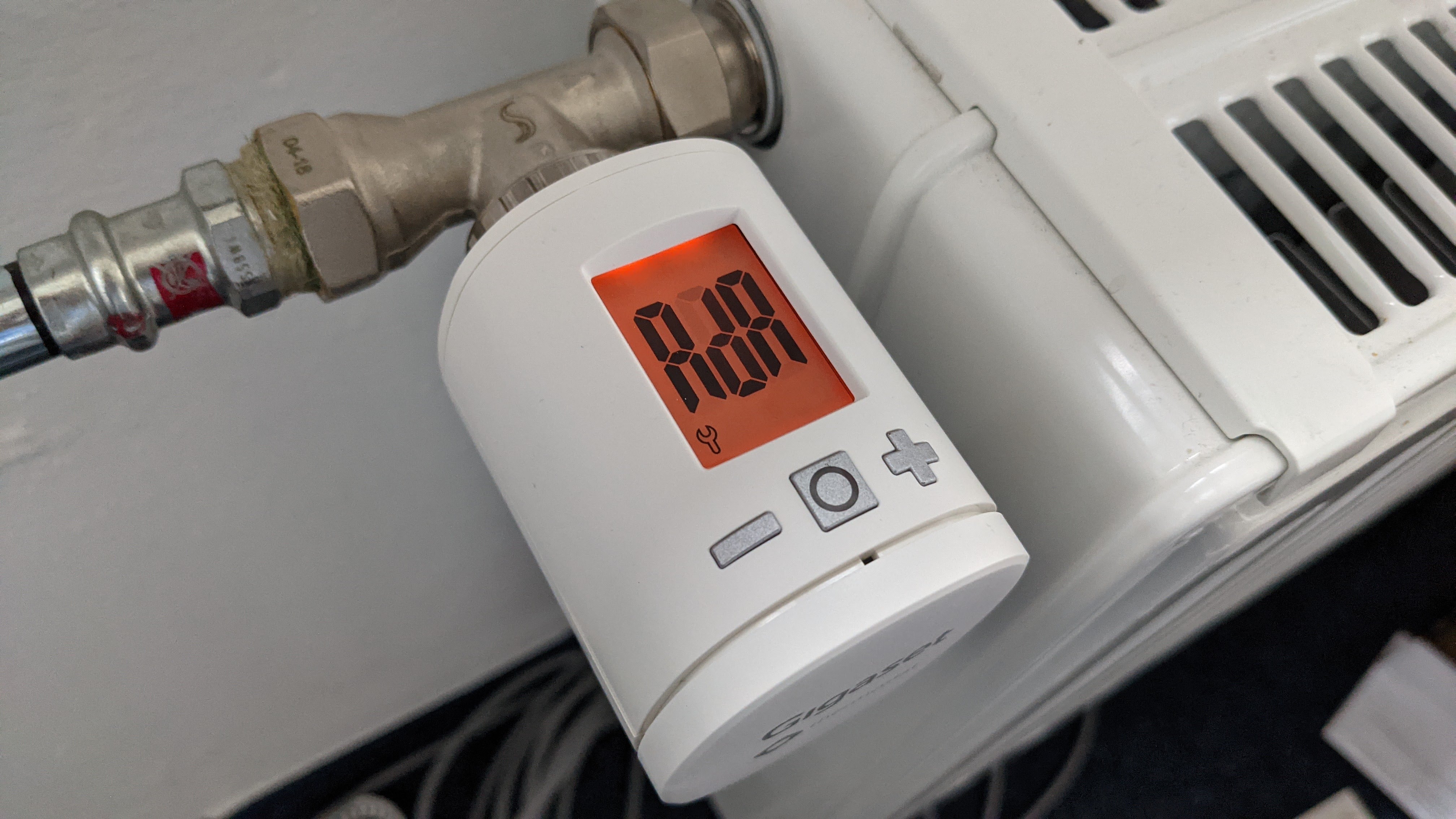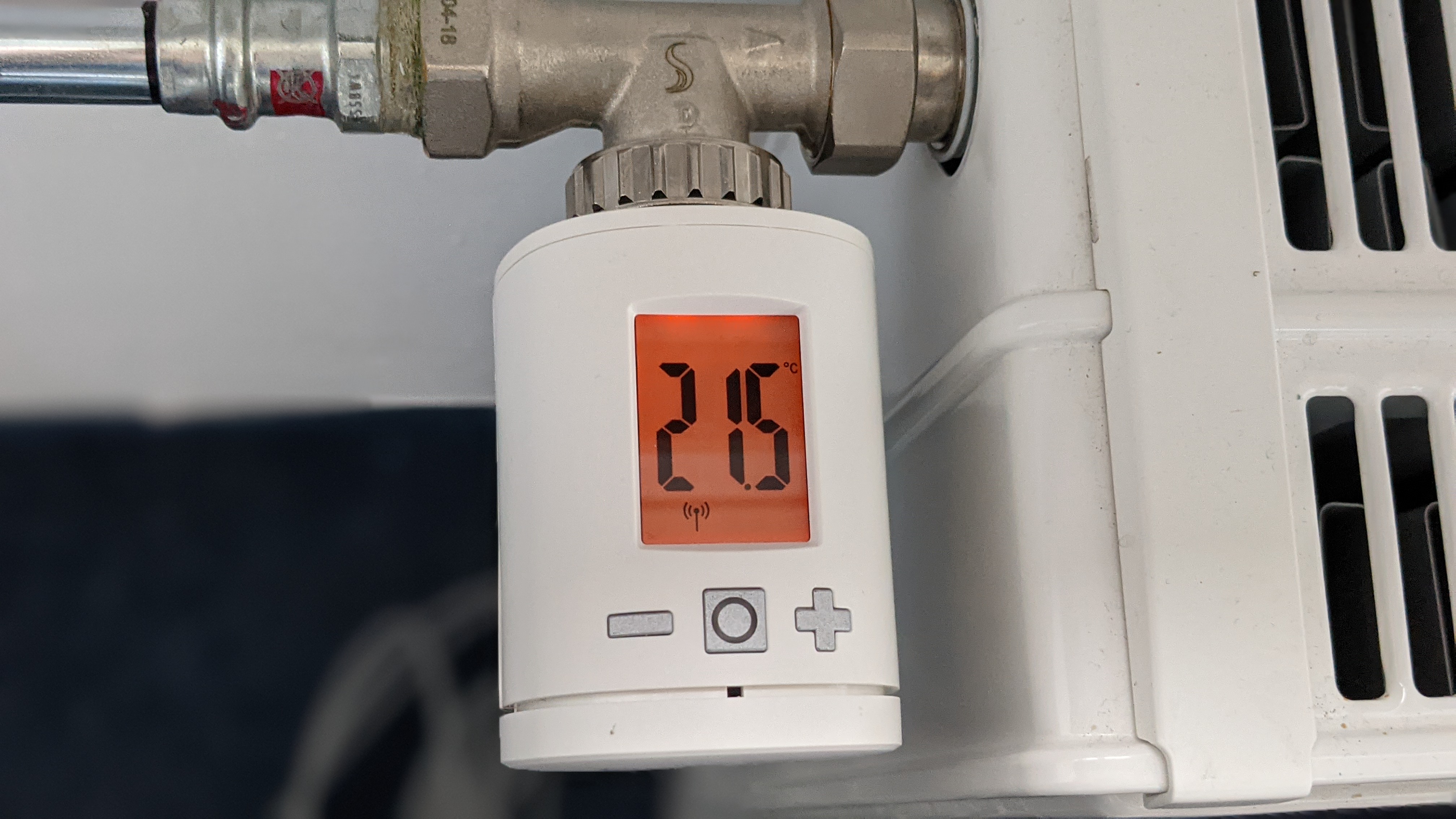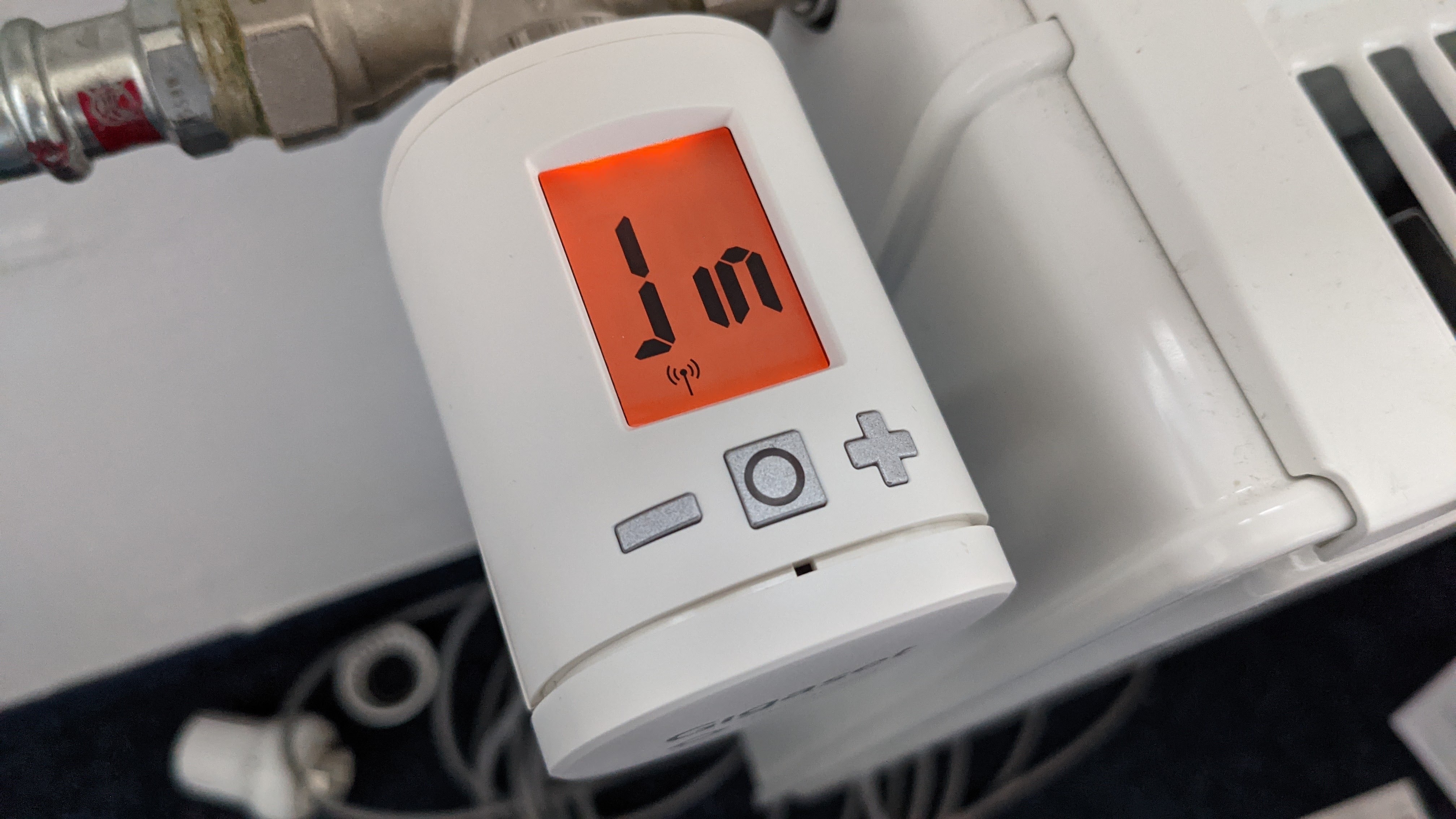 Das Display ist hintergrundbeleuchtet und so eingebaut, dass es auch aus einem recht spitzen Winkel noch gut abzulesen ist. Unter der Anzeige sitzt ein Aktionsknopf sowie ein Minus- und ein Plustaster. Dieser verstellt die Solltemperatur in 0,5-Grad-Schritten. Ein Drehregler für die manuelle Temperaturkorrektur ist uns grundsätzlich lieber, die Taster erfüllen jedoch ebenfalls ihren Zweck und sind blind gut zu erfühlen. Der Stellmotor ist deutlich zu hören.