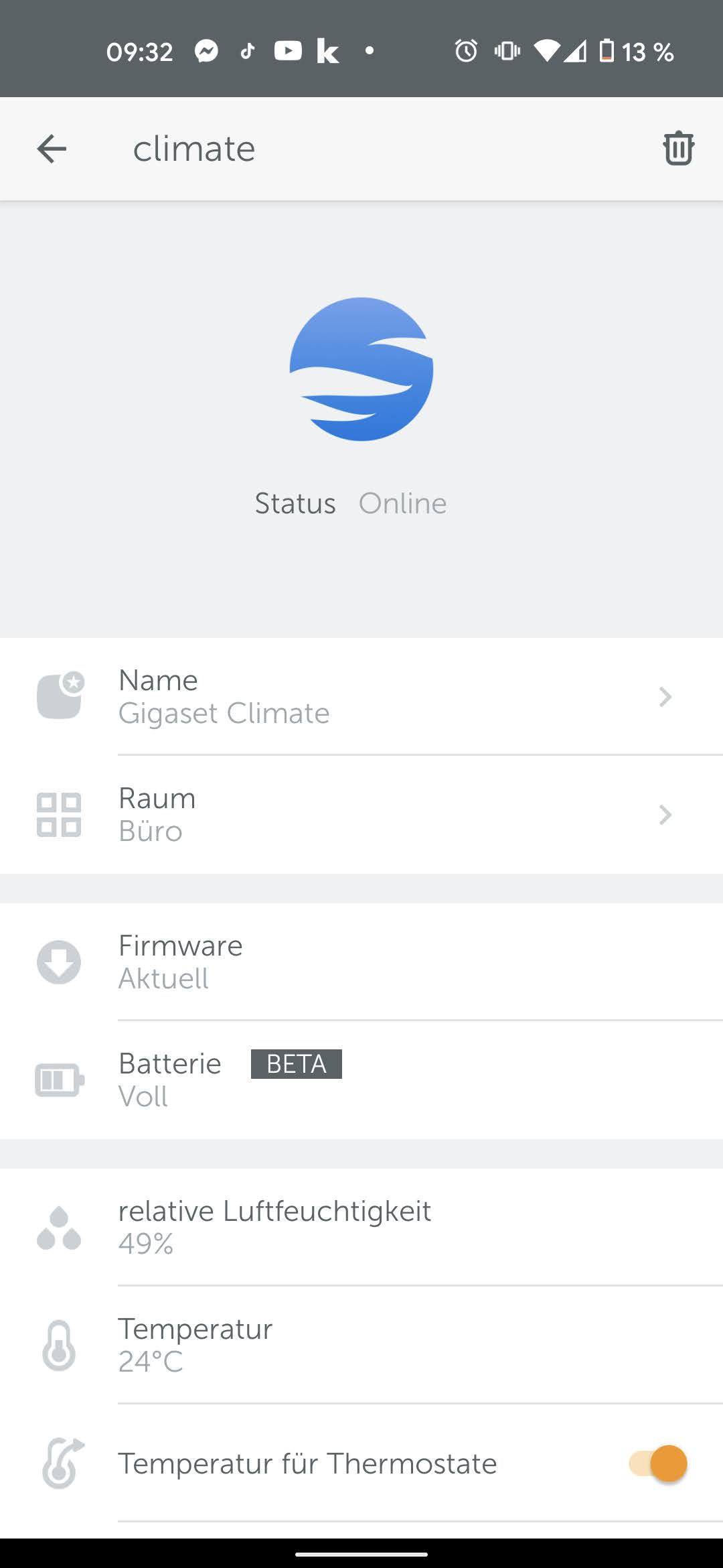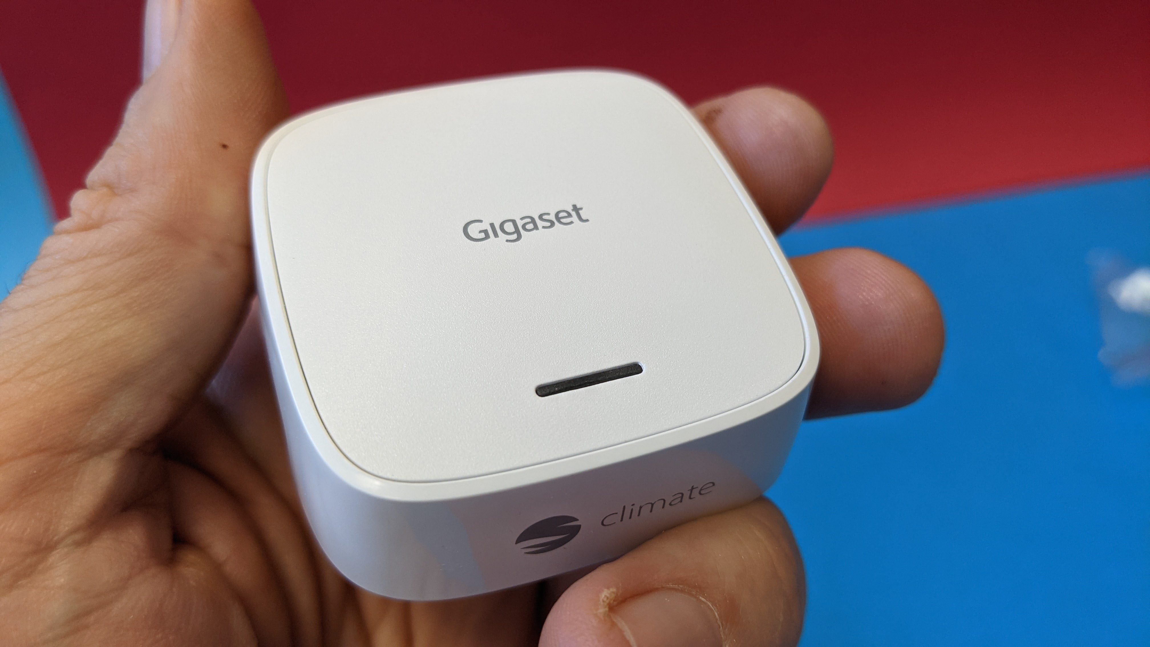Als weitere Funktion gibt es einen Batteriesparmodus (Beta ) für die Monate außerhalb der Heizsaison, welcher unter anderem die Schaltzeiten von 2,5 auf 15 Minuten hochstellt und den Bildschirm ausschaltet. Optional stellt Gigaset einen Klimasensor bereit, der frei aufgestellt die Temperatur einem Ort wie der Couch misst und als Referenz nimmt. Das ist praktisch, da der interne Temperaturfühler der Thermostate wegen seiner physischen Nähe zum Heizkörper fast schon zwangsläufig zu hohe Ergebnisse anzeigt. Eine Möglichkeit zur Offset-Einstellung wie sie viele andere smarte Thermostate bieten gibt es bei Gigaset nicht. Wir vermissen am Klimasensor ein Display zur Anzeige der Ist- oder Solltemperatur sowie die Möglichkeit, über sie die Thermostate zu steuern.