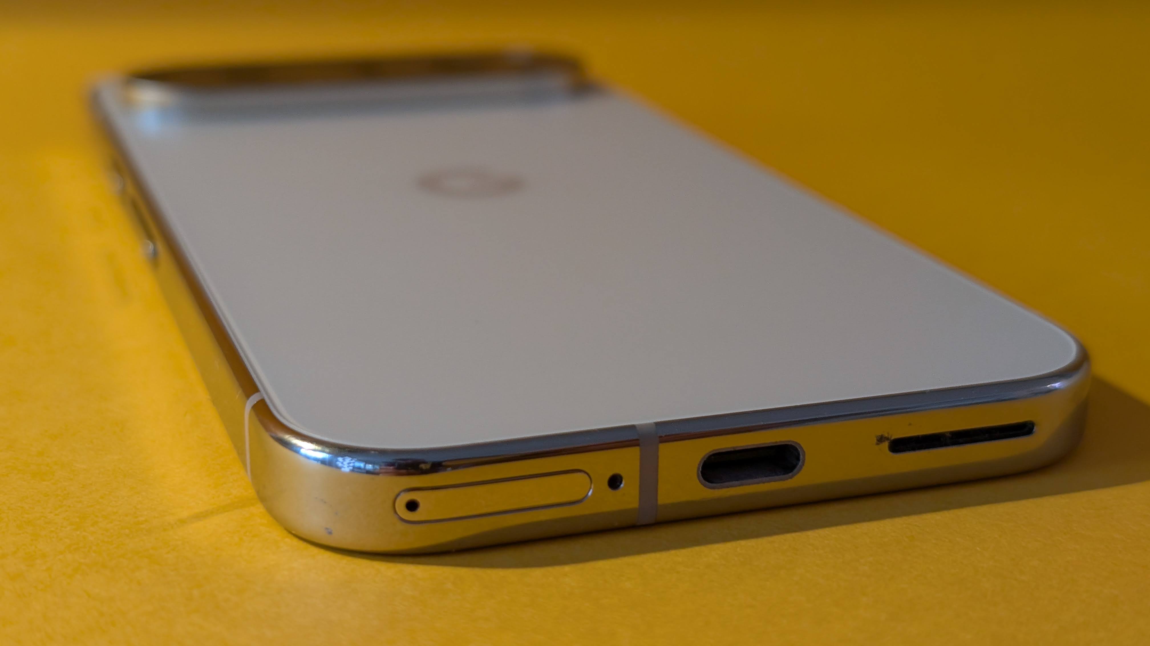 In der Hand fühlt sich das Pixel 9 Pro mit seinem Aluminium-Rahmen und den abgerundeten Kanten hochwertig und griffig an. Trotz des großen 6,7-Zoll-Displays liegt es dank der kompakten Bauweise gut in der Hand. Mit 199 Gramm ist das Gewicht für ein Gerät dieser Größe angemessen. Die Verarbeitung ist tadellos, alle Elemente sind passgenau verbaut. Selbst bei genauem Hinsehen sind keine Spaltmaße zu erkennen.
