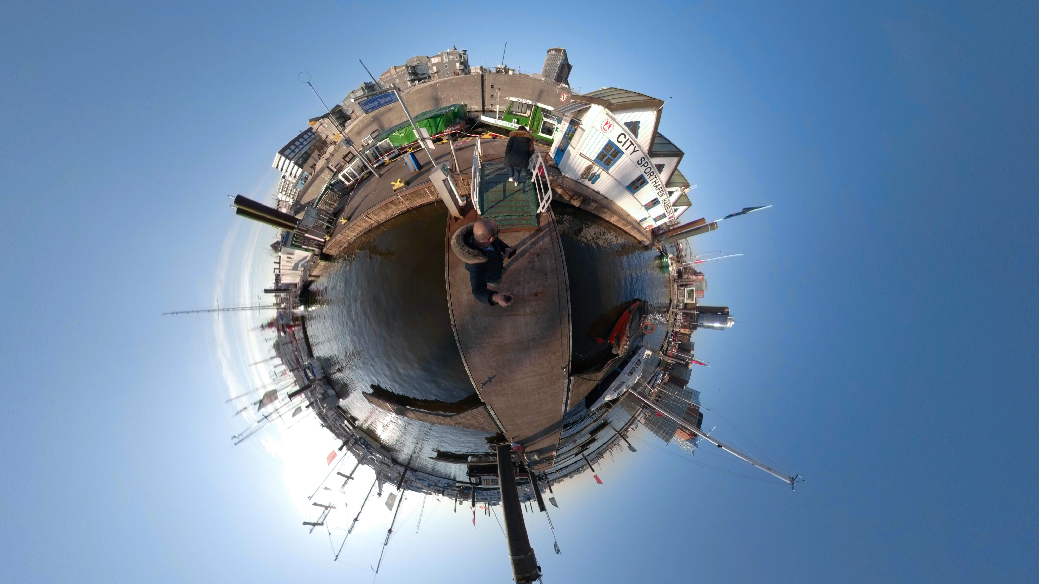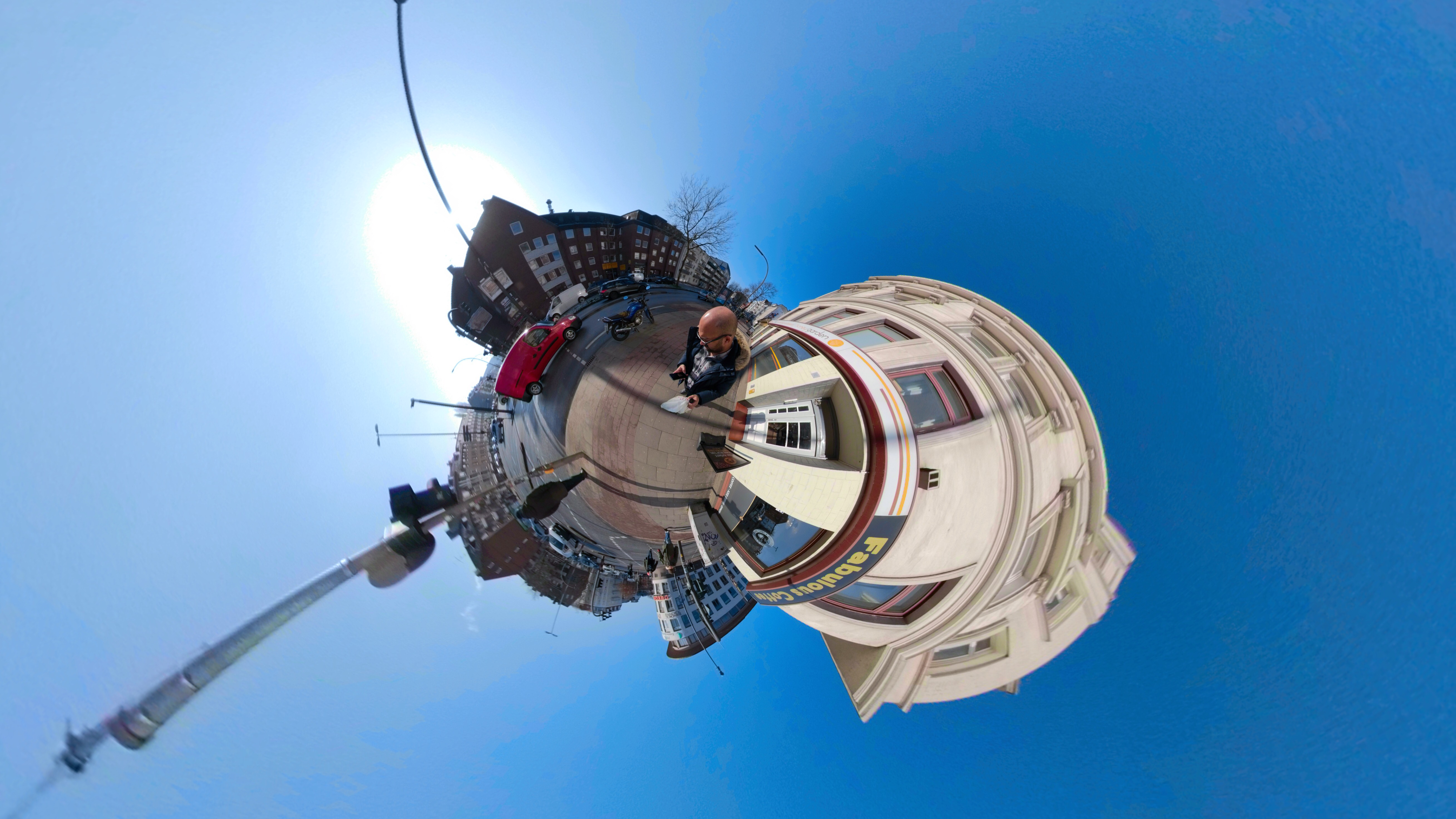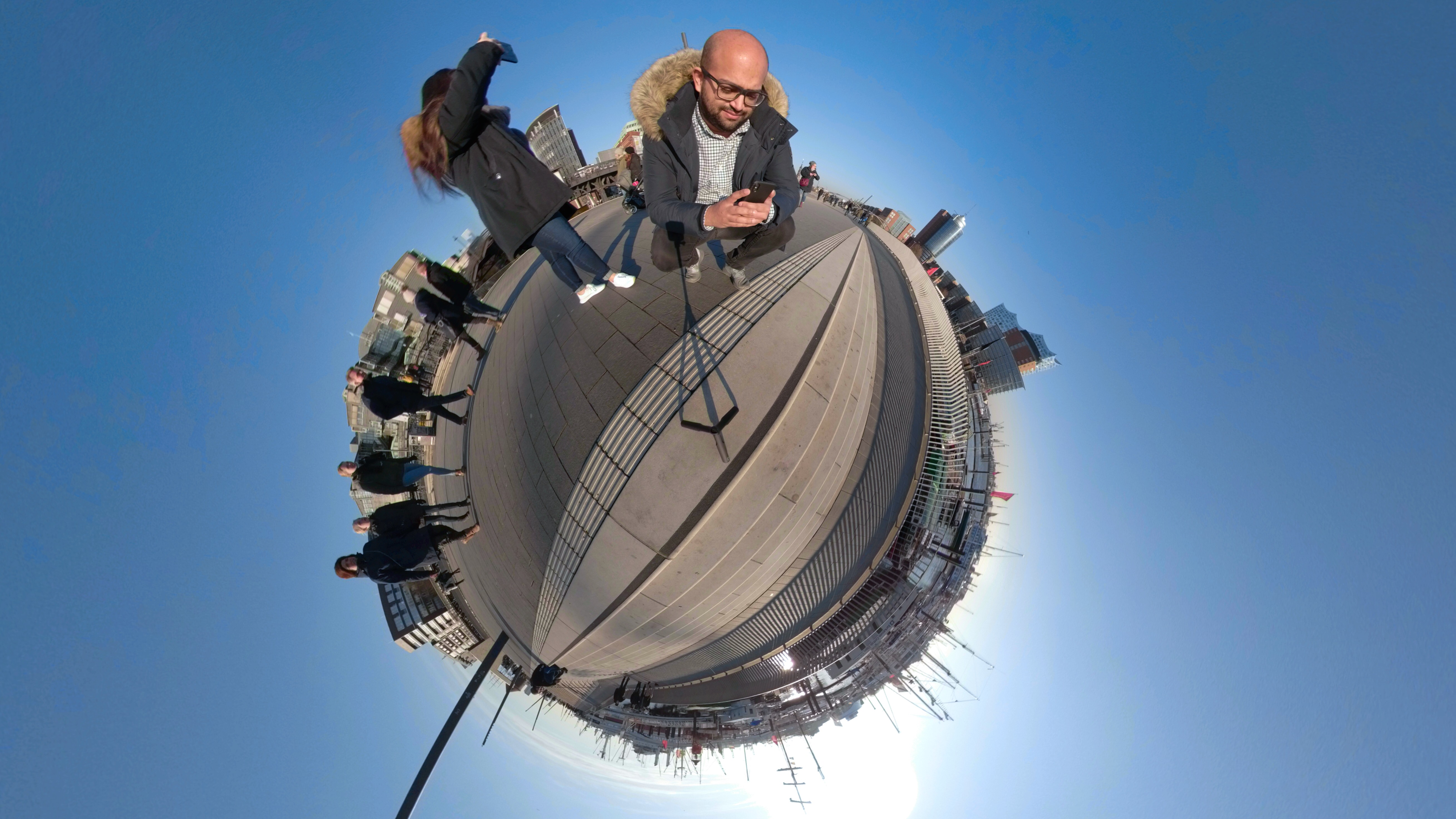 Die GoPro-App kann mit dem 360-Material einiges anfangen: zum Beispiel Bilder in verschiedene Ansichten umwandeln. Eine Möglichkeit bietet die Funktion Tiny Planet: Dabei wird die Umgebung wie ein kleiner Planet dargestellt. Der Effekt kommt besonders zur Geltung, wenn man sich im Wasser oder in einer Landschaft befindet. Ein Stadtbild wirkt unproportioniert.