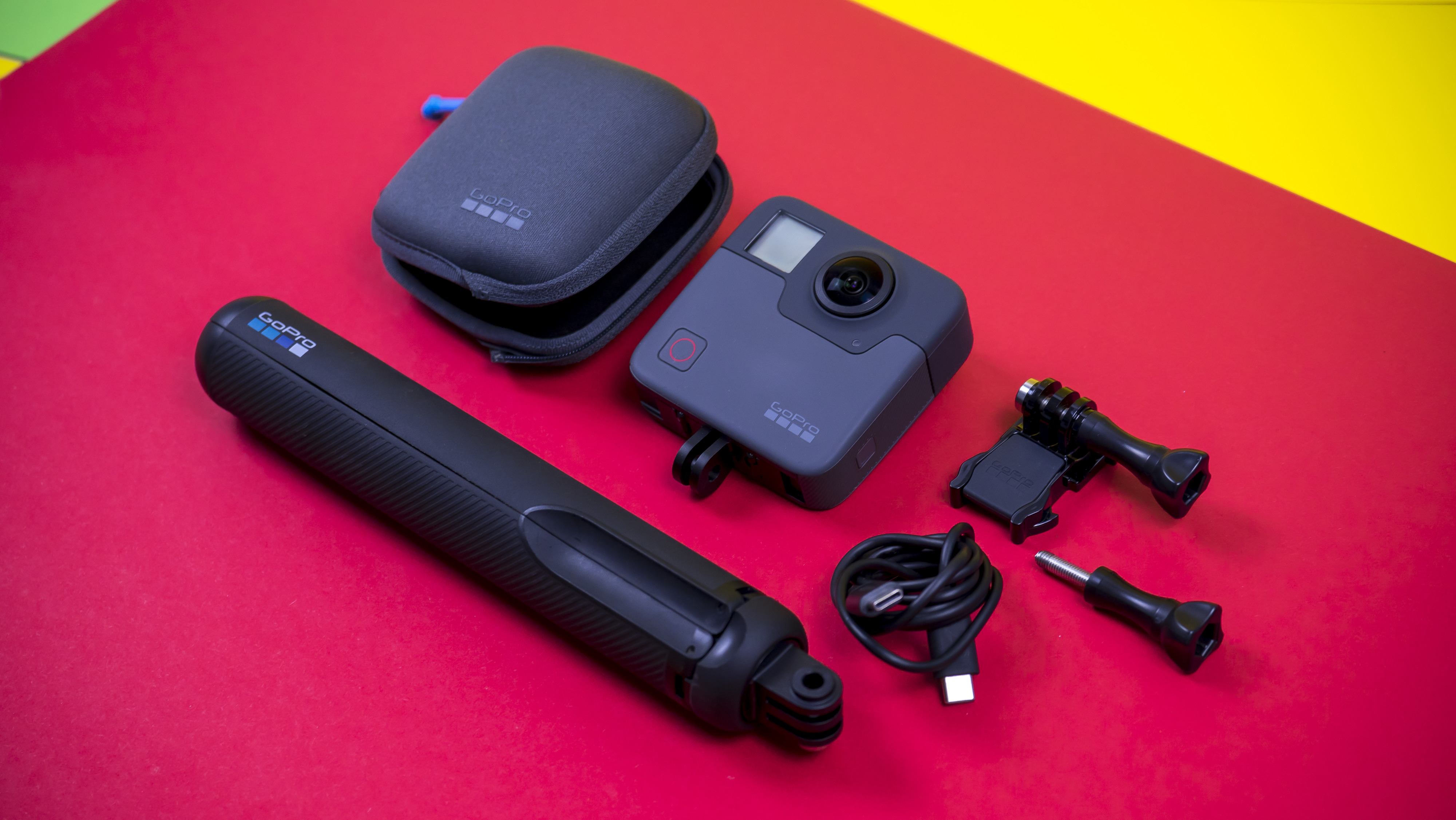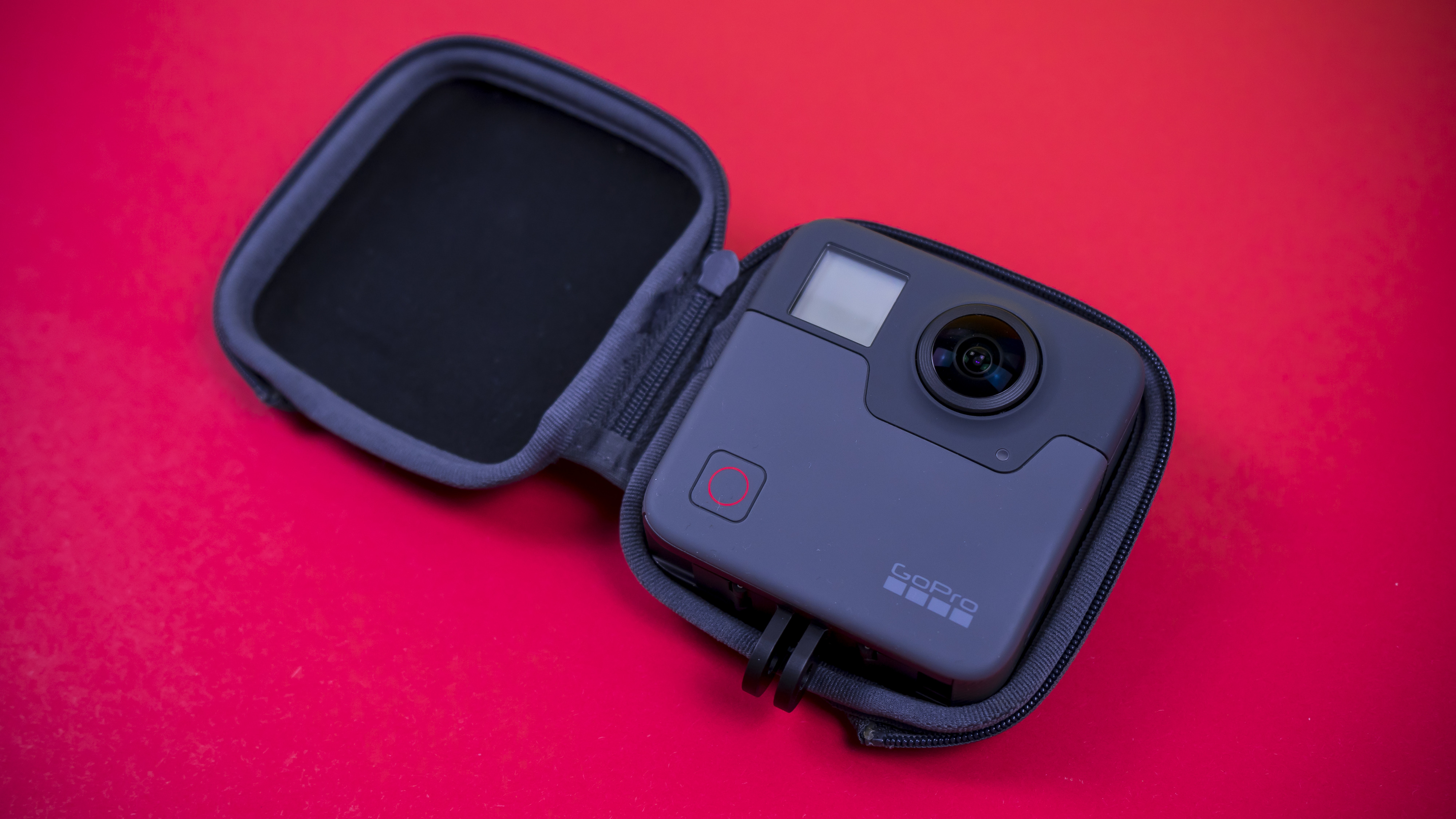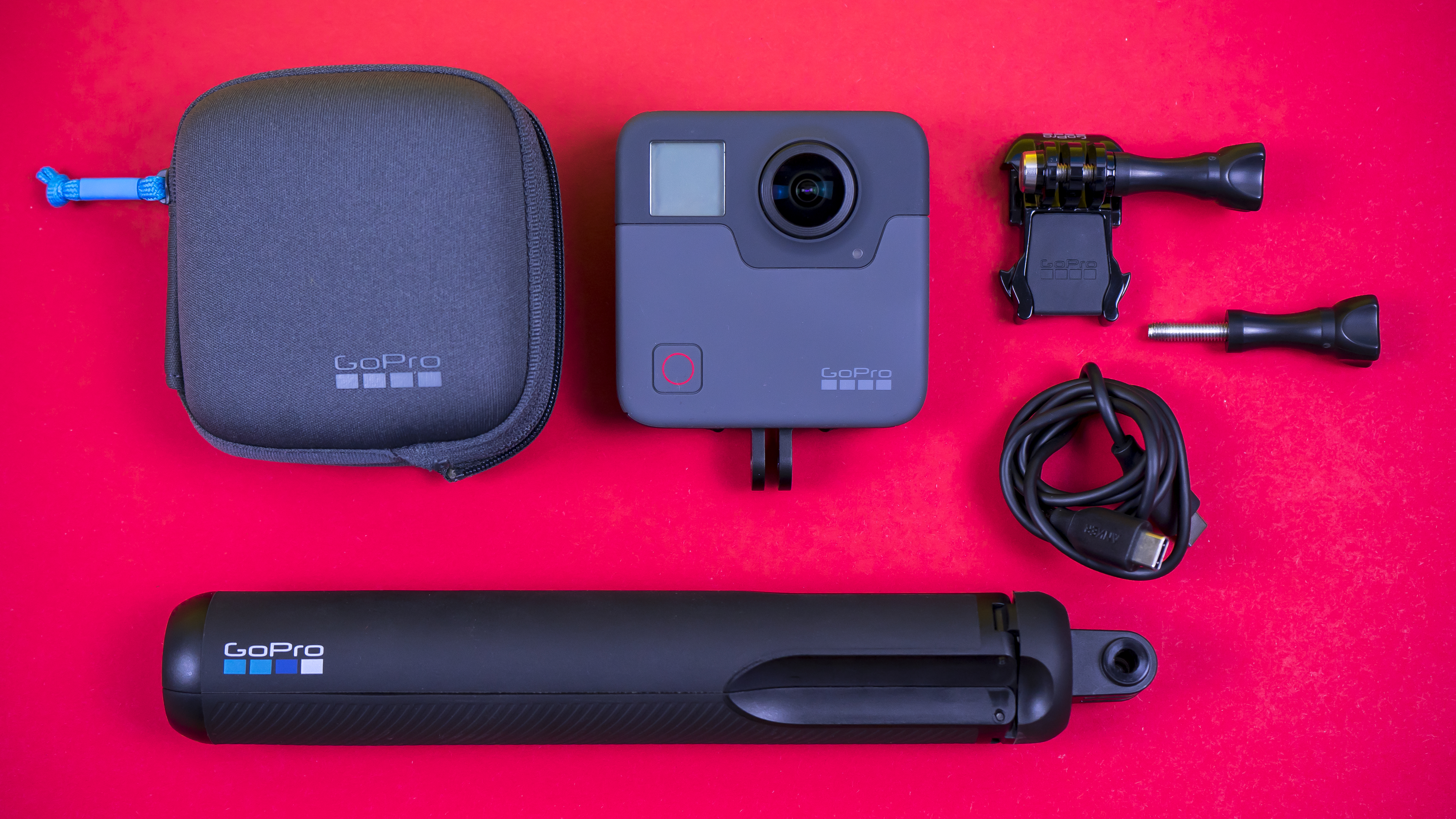 Der Lieferumfang der Fusion-Kamera ist GoPro typisch: umfangreich, mit vielen Beigaben. Die Fusion kommt in einer hochwertigen Tasche mit Reißverschluss. Der Schutz ist notwendig, weil die zwei empfindlichen Linsen der Kamera aus dem Gehäuse schauen und bei kleinster Unachtsamkeit zerkratzen können. Professioneller Tipp der GoPro-Mitarbeiter: Die Fusion immer auf die gepolsterte Innenseite der Tasche legen. Oder noch besser: Auf dem Stativ stehen lassen.
