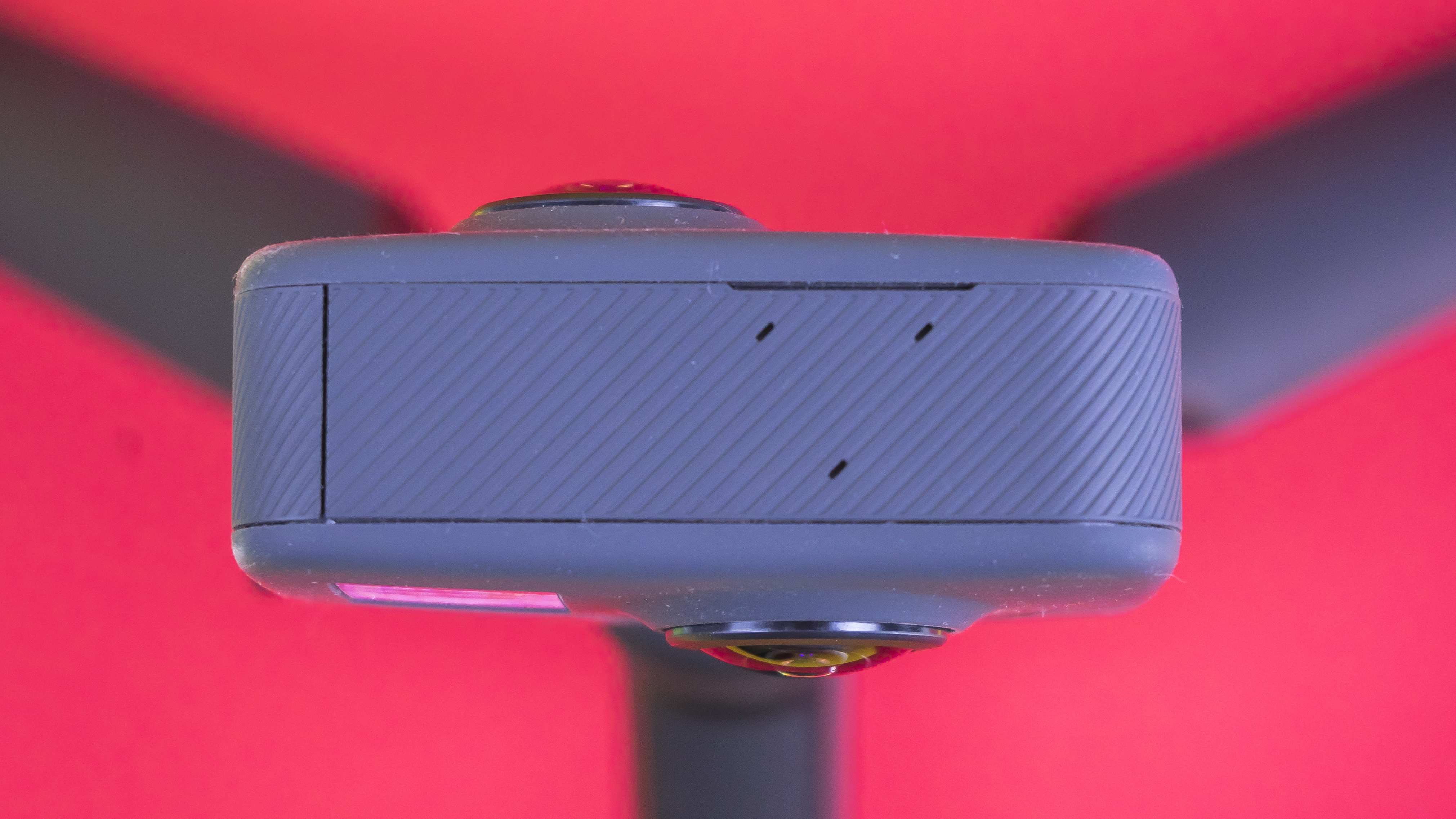 Die GoPro Fusion sieht den Kameras der Hero- und Session-Reihe ähnlich. Farblich ist sie in dunkelgrau und anthrazit gehalten, und auch Material sowie Verarbeitung sind identisch: gummiert, robust und stabil.