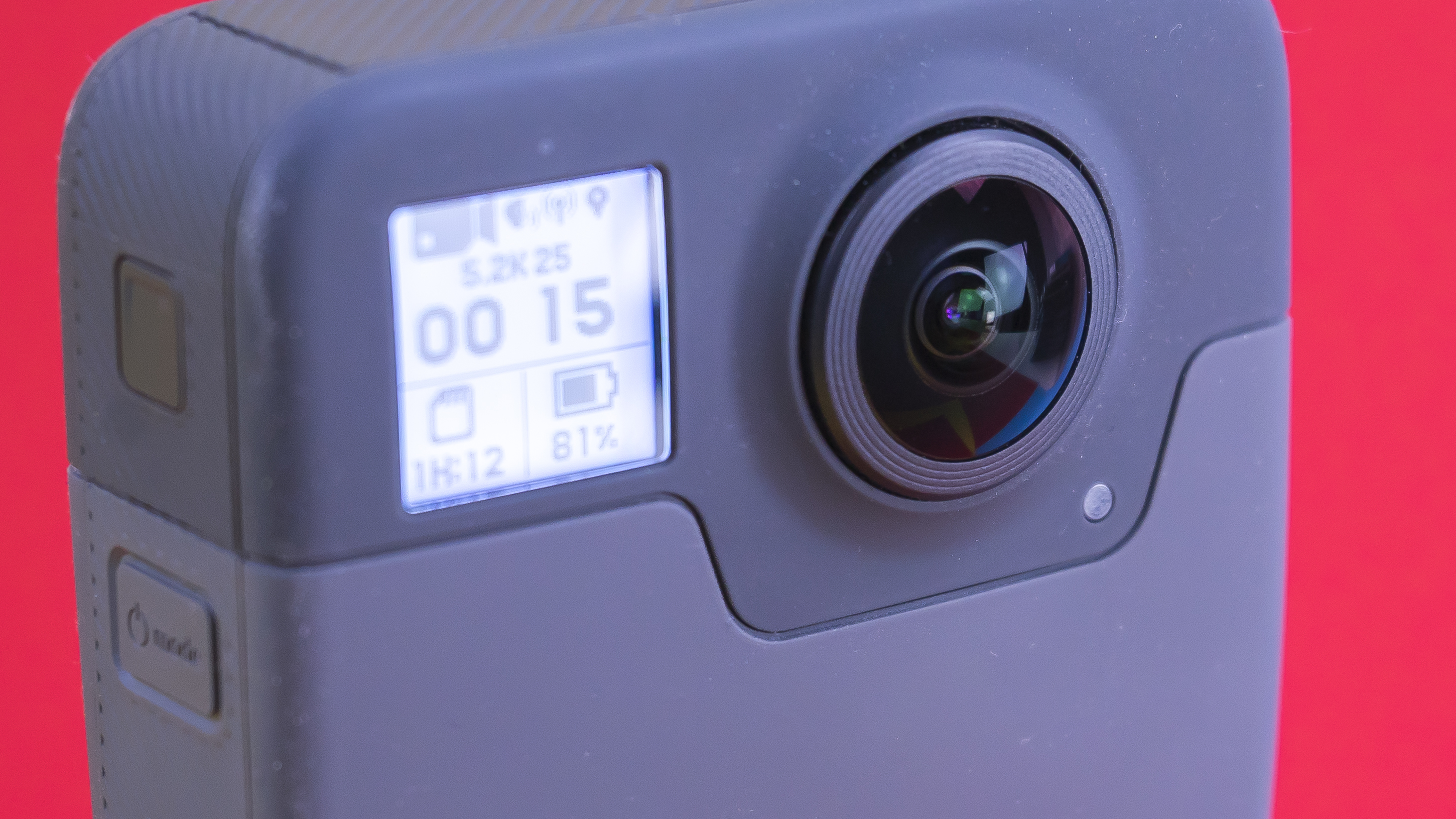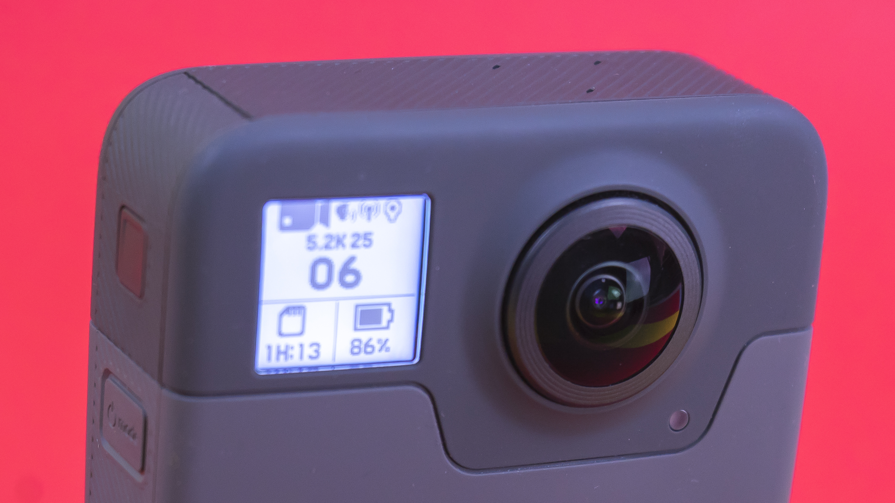 Auf der vorderen Seite der Fusion wurde links neben der Linse ein kleines Display verbaut. Darauf lassen sich Informationen zu Speicher, restlicher Akku-Kapazität sowie dem aktuellen Bildmodus ablesen. Ein eingebautes Display mit Touch-Bedienung, wie bei der 2D-Actionkamera Hero5 Black (Testbericht) oder Hero6 Black (Testbericht) , existiert nicht.