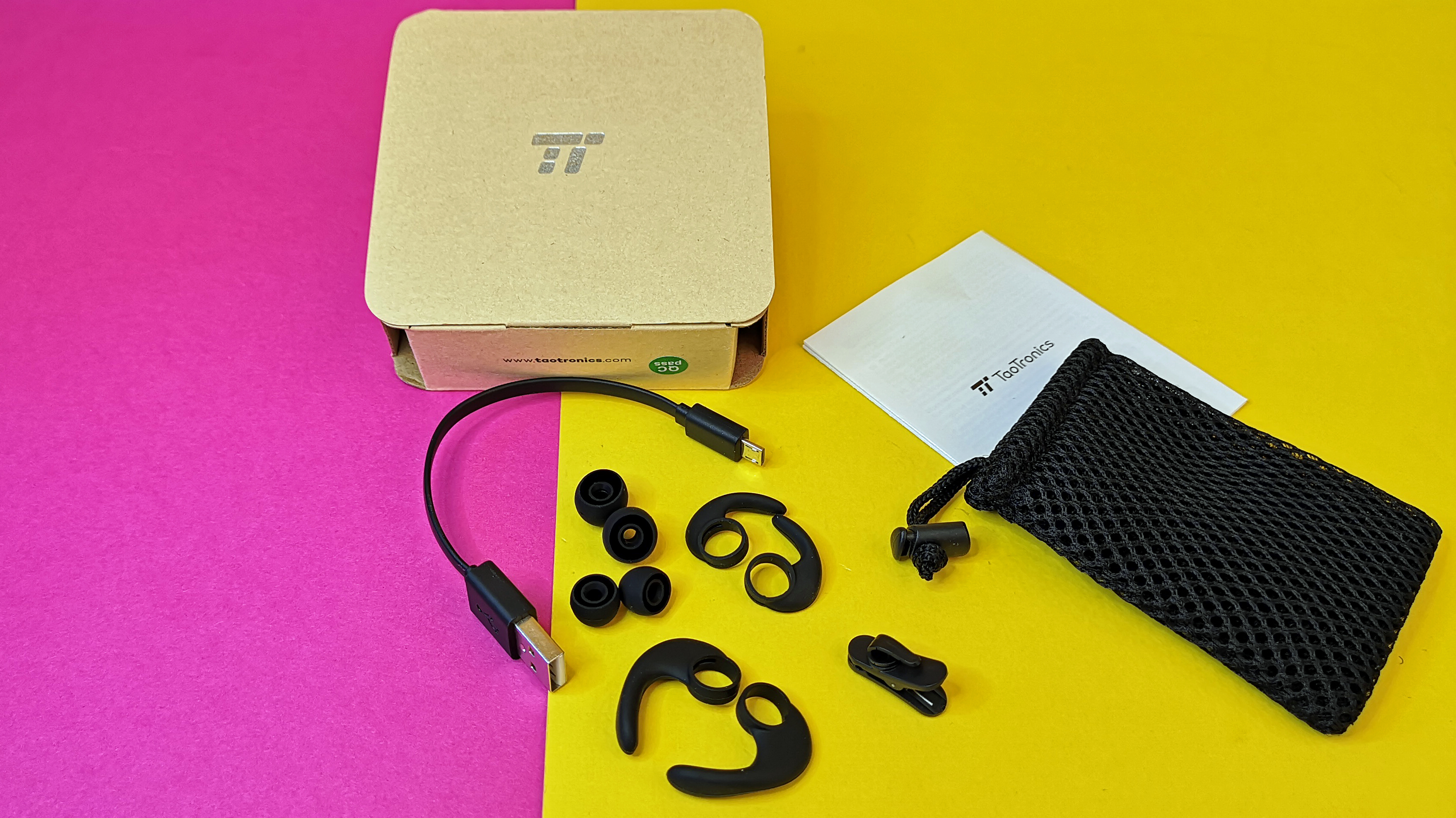 Neben dem Kopfhörer gehören eine Anleitung, ein kurzes Micro-USB-Ladekabel, eine Befestigungsklammer und ein Transportbeutel zum Lieferumfang. Das zum Laden notwendige USB-Netzteil liefert Tao Tronics nicht mit. Damit die Ohrenstöpsel möglichst gut sitzen, sind die Ear-Fins und die Silikon-Ringe der Kopfhörer in drei Größen beigelegt.
