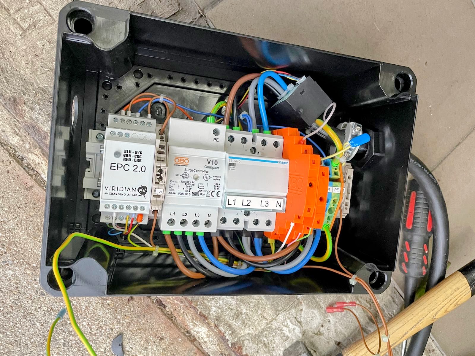 Der Hersteller Obo Bettermann ist bereits aus dem Geschäft mit Schaltschränken ein bekannter Name. Unser Elektriker fühlte sich bei der Montage und Verkabelung an vielen Stellen daran erinnert. Dabei ist die Qualität der Verkabelung gut, es handelt sich um absoluten Industriestandard. Das ist zuverlässig, aber nichts Außergewöhnliches.