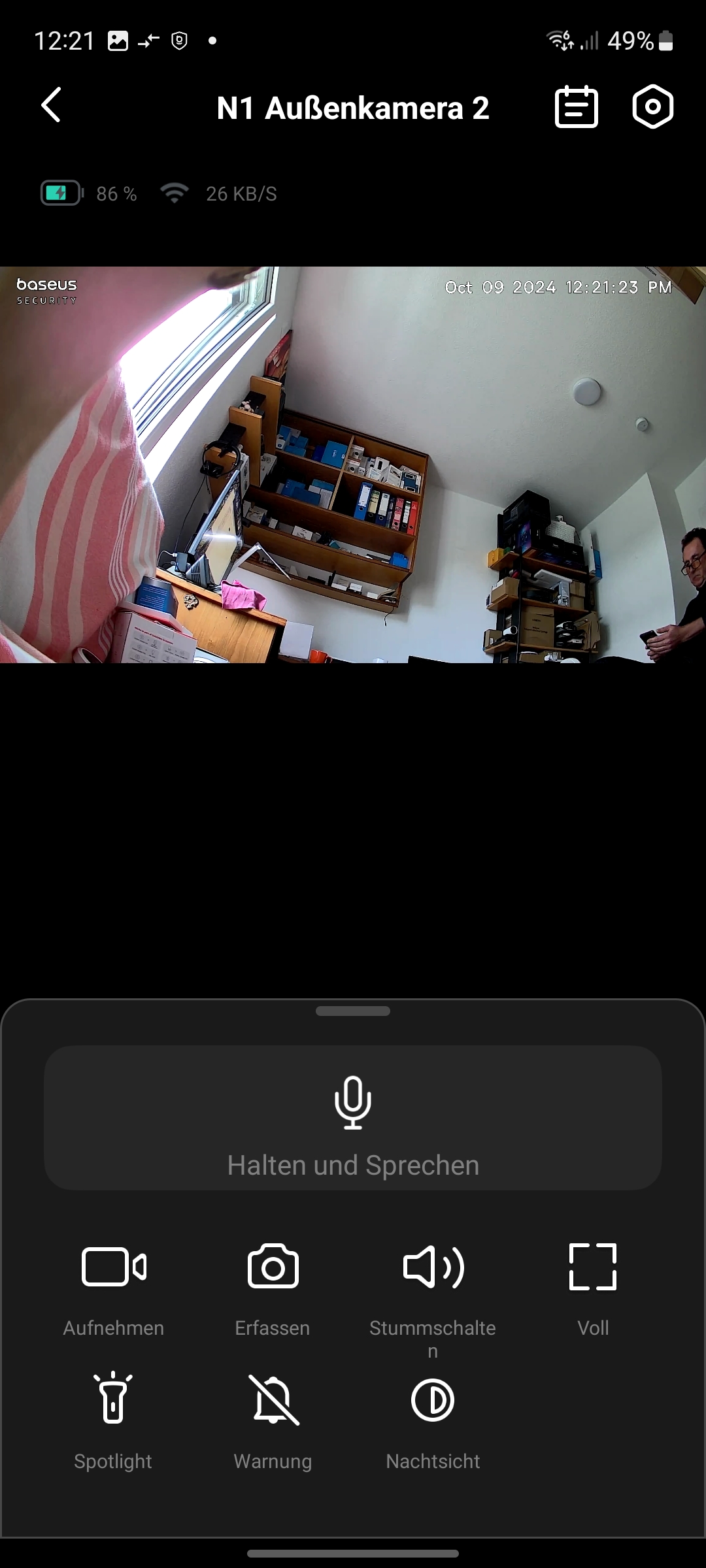 Die Steuerung über die App ist intuitiv und die Darstellung des Livestreams erfolgt zügig, ebenso schnell spielt die Baseus-App aufgenommene Videos ab. In der Livestream-Ansicht gibt es Schalter für das schnelle Aktivieren bestimmter Funktionen. Anwender können darüber Videos oder Fotos aufnehmen, das Mikrofon der Kamera ausschalten, die Gegensprechfunktion nutzen, den Alarm aktivieren sowie die Nachtsicht (Infrarot, Spotlight, Ausschalten) konfigurieren. Ein Wechsel der Auflösung, wie von anderen Herstellern gewohnt, ist hingegen nicht möglich.