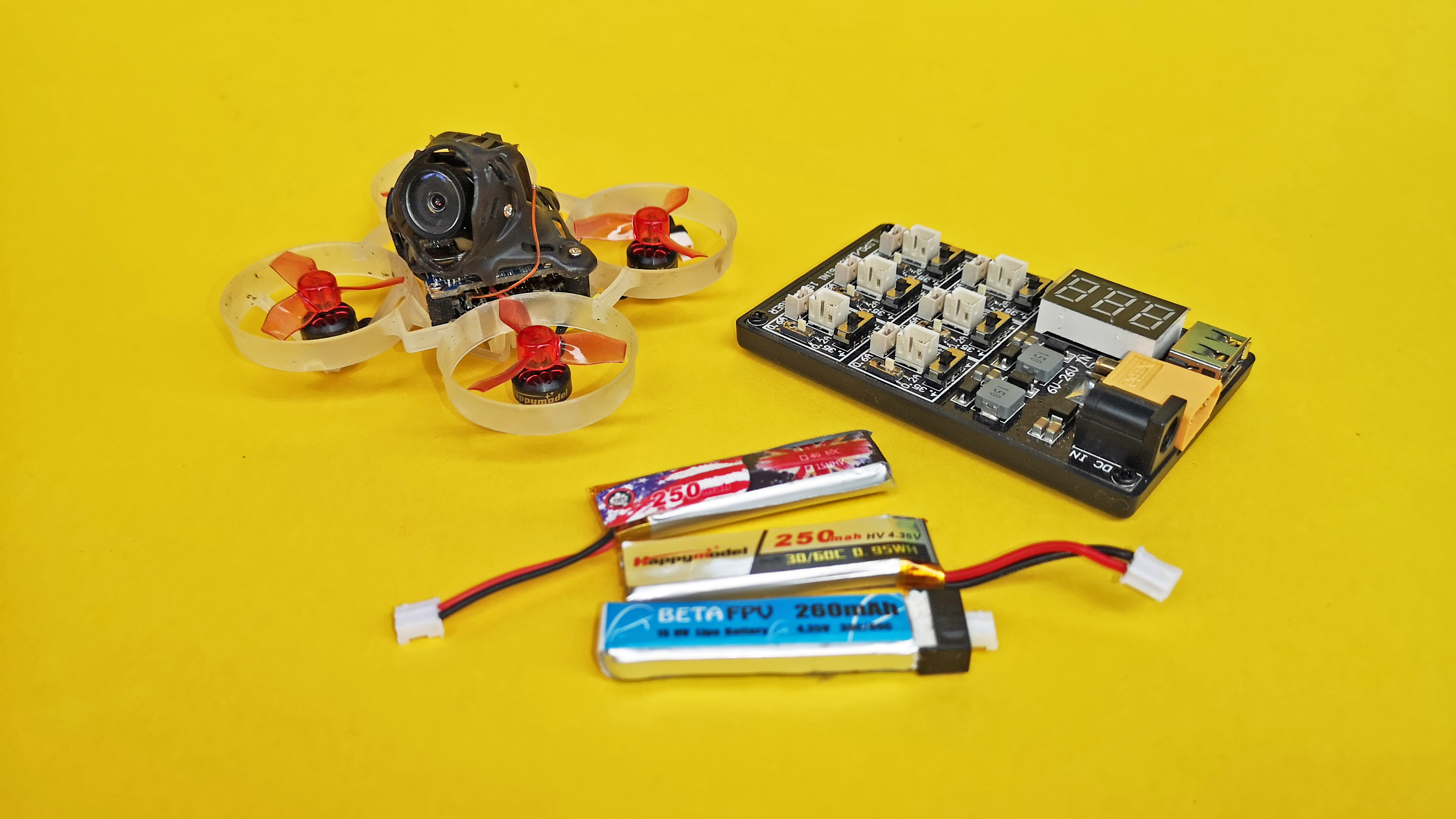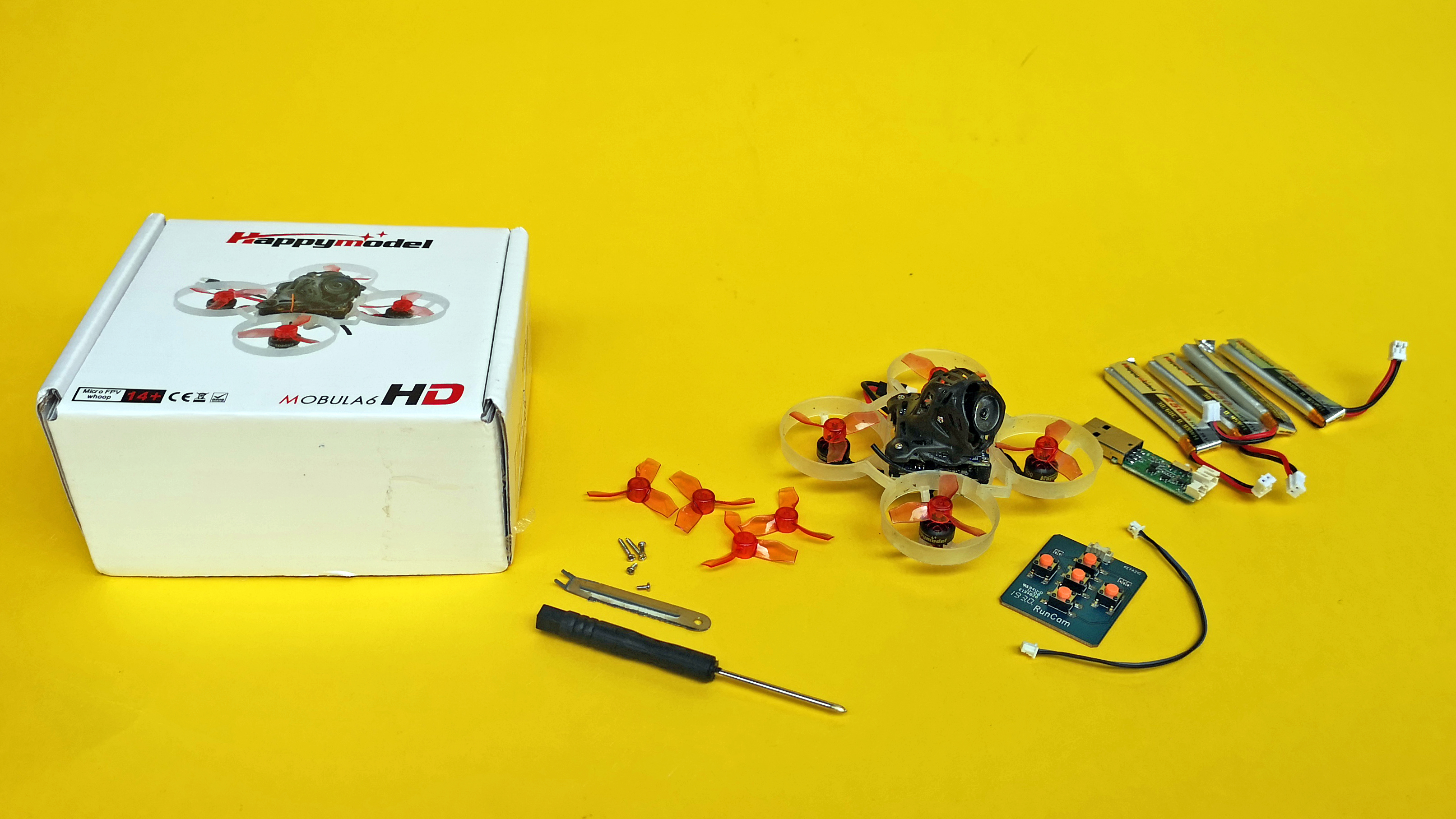 Unser Testmodell, der Happymodel Mobula6 HD, wird in einem Set mit vier Akkus, einem USB-Ladegerät, einem Satz Ersatzpropeller und einem Schraubendreher geliefert. Auch ein Werkzeug für den Propellerwechsel und einige Ersatzschrauben sind im Lieferumfang enthalten. Für Einstellungen an der Kamera ist ein kleines Bedienteil beigepackt; dieses ist allerdings nicht notwendig, da die Einstellungen auch anders vorgenommen werden können. Um losfliegen zu können, fehlen allerdings noch einige Dinge.