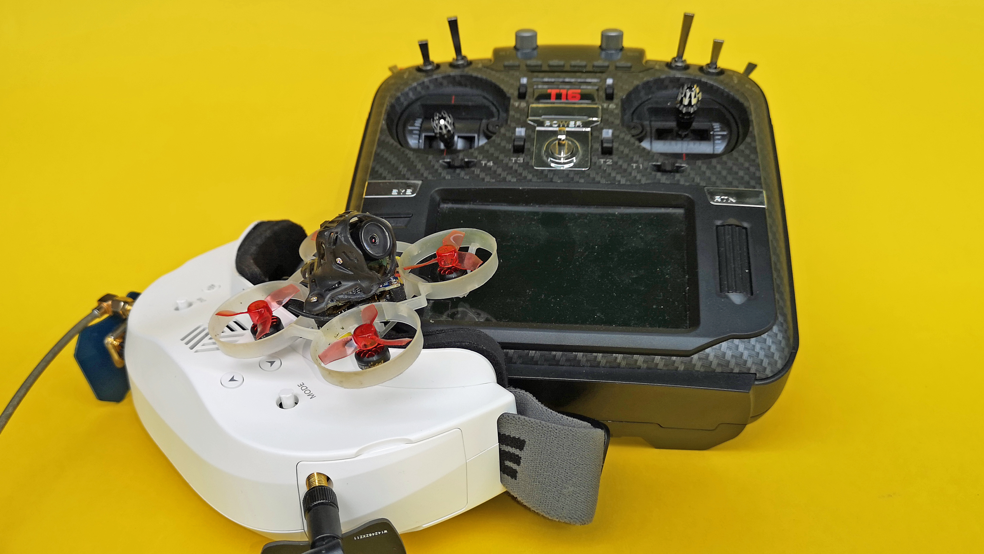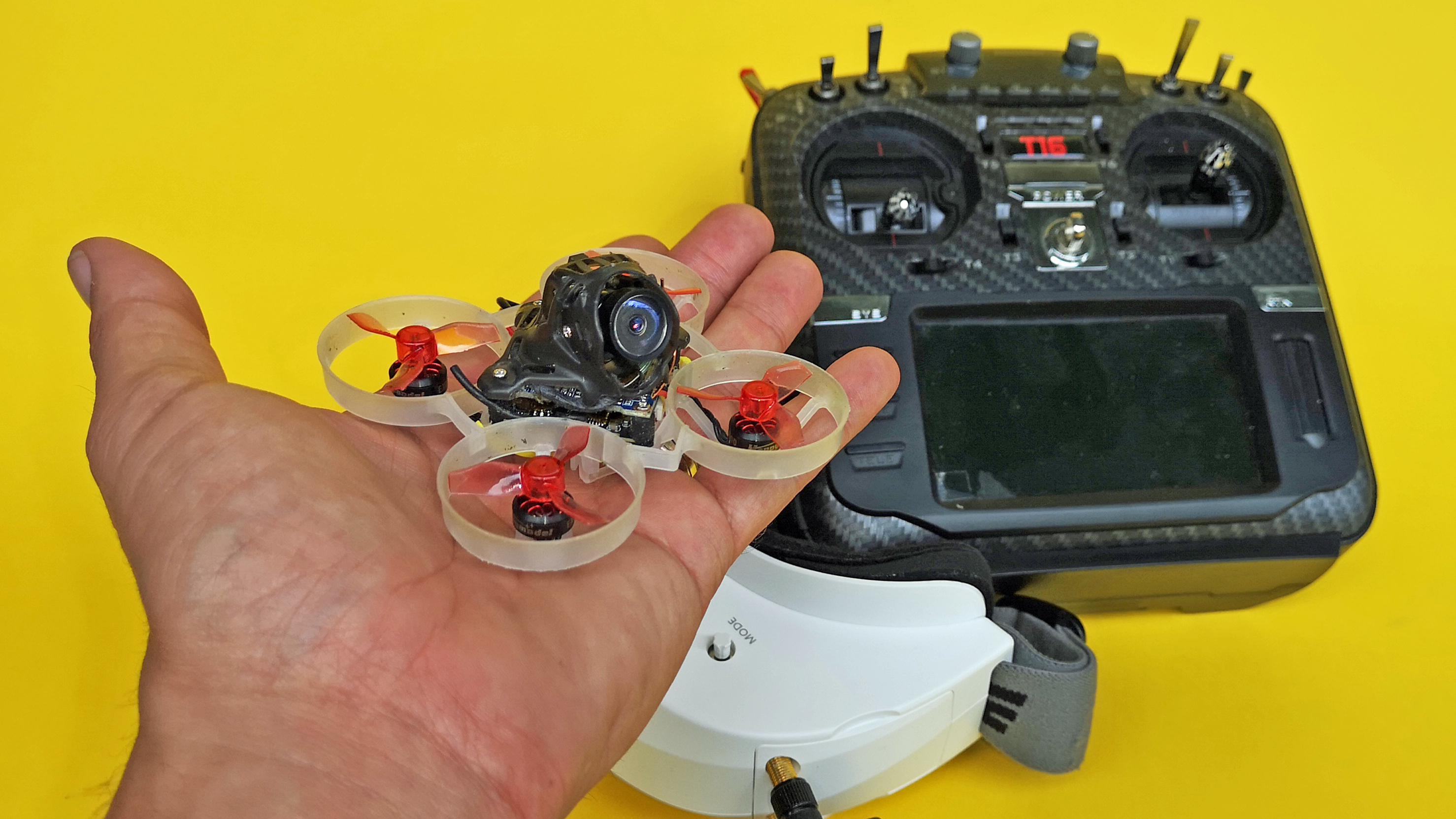 Neben einem USB-Netzteil für das Ladegerät werden eine Videobrille, ein Computer für die Konfiguration und eine Micro-SD zur Aufzeichnung von Videos benötigt. Der zur Bedienung notwendige Handsender kann, je nach gewählter Variante des Copters, über das Frsky-, Flysky- oder DSM-Protokoll verfügen. Alternativ kann man den Mobula6 HD auch ohne integrierten Empfänger bestellen und diesen selbst einbauen. Da wir einen Handsender mit Multiprotokoll-Modul nutzen, können wir alle drei Varianten ansteuern. Unser Testgerät ist mit einem Flysky-Modul ausgestattet, dazu passt beispielsweise die „Funke“ Turnigy Evolution oder solche mit Multiprotokoll, wie die Jumper T16.