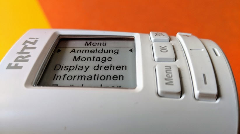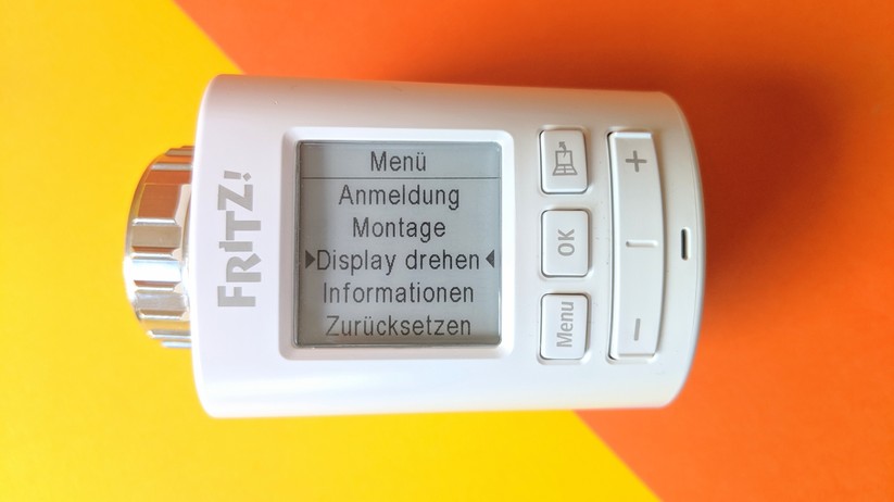 Das Display misst 28 × 28 mm und stellt seinen Inhalt in bis zu sechs Zeilen dar. So sind klare Handlungsanweisungen wie „Anmeldung: Bitte DECT-Taste an der Fritzbox lange Drücken“ genauso möglich wie die gleichzeitige Anzeige der Solltempertatur und der Tagesprogrammierung. Sehr schön: Direkt am Gerät lässt sich die Anzeige in 90-Grad-Schritten drehen.