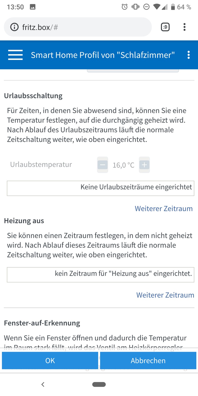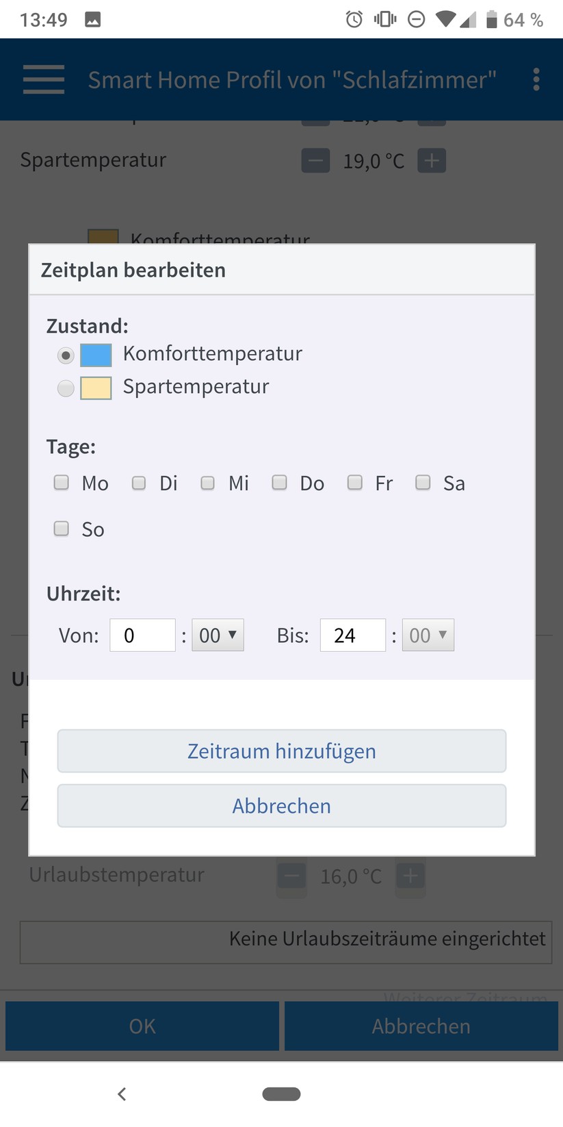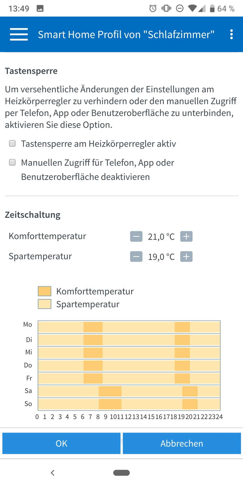 Die Kernfunktion der App ist die Programmierung des Heizzeitplans. Diese ist AVM gelungen. Dort bestimmt der Nutzer, wann am Tag zwischen der frei wählbaren Spar- und Komforttemperatur gewechselt wird. Auf Wunsch programmiert die App jeden Wochentag einzeln oder mehrere auf einmal.