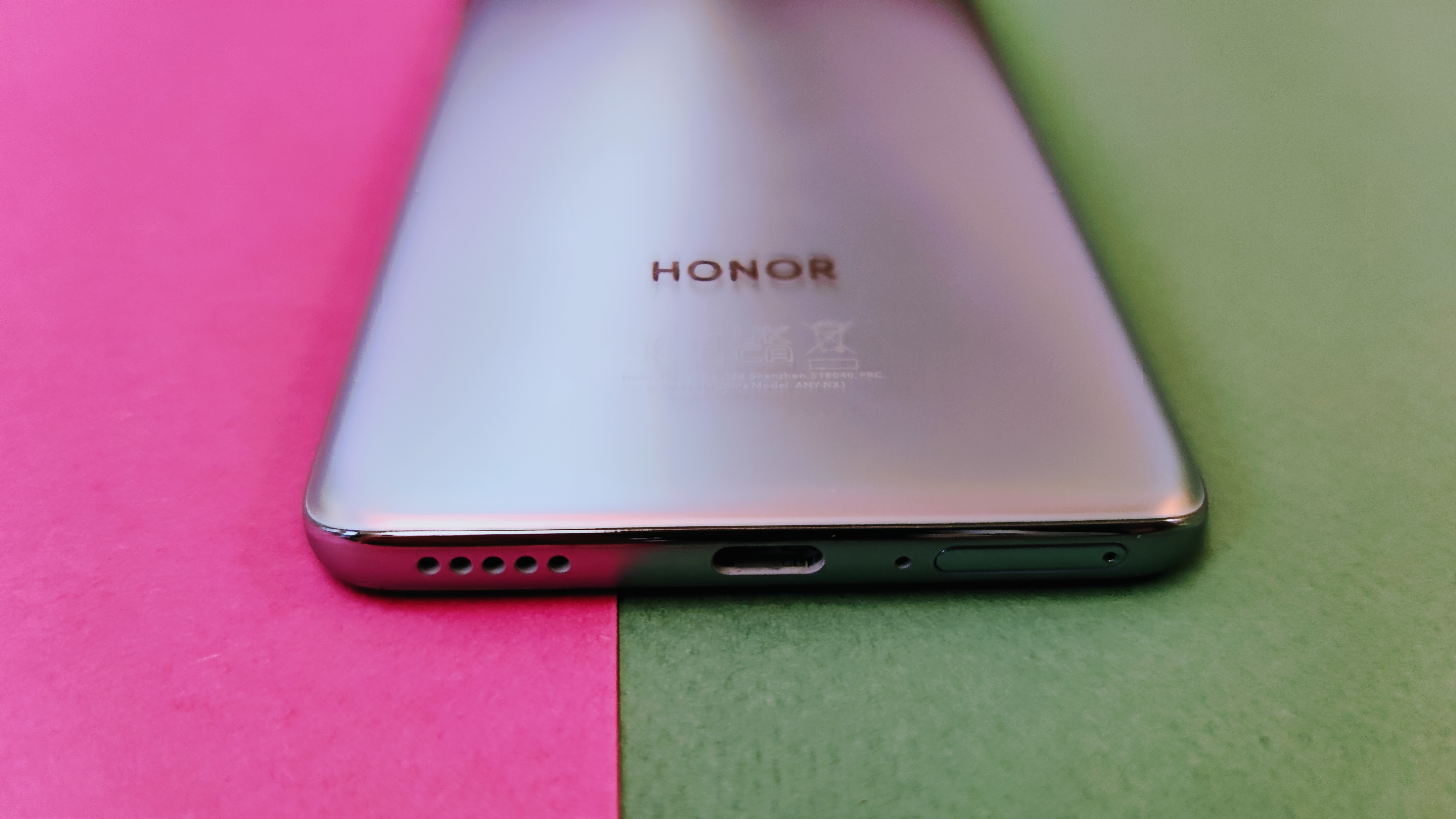 An eine einhändige Bedienung ist bei der Größe nicht zu denken. Allerdings liegt das Magic 4 Lite durch das niedrige Gewicht angenehm und gut in der Hand. Die Rückseite aus Kunststoff trägt dazu bei, dass das Handy nicht zu schwer ist. Die silberhelle Oberfläche in „Titanium Silver“ glänzt effektvoll im Licht und verändert je nach Lichteinfall ein wenig die Farbe. Da sieht schon mal sehr schick aus – allerdings sorgen solche Oberflächen in der Regel für deutlich sichtbare Fingerabdrücke. Das ist beim Magic 4 Lite nicht ganz so schlimm, wie wir befürchtet hätten. Die Abdrücke bleiben nur leicht sichtbar.