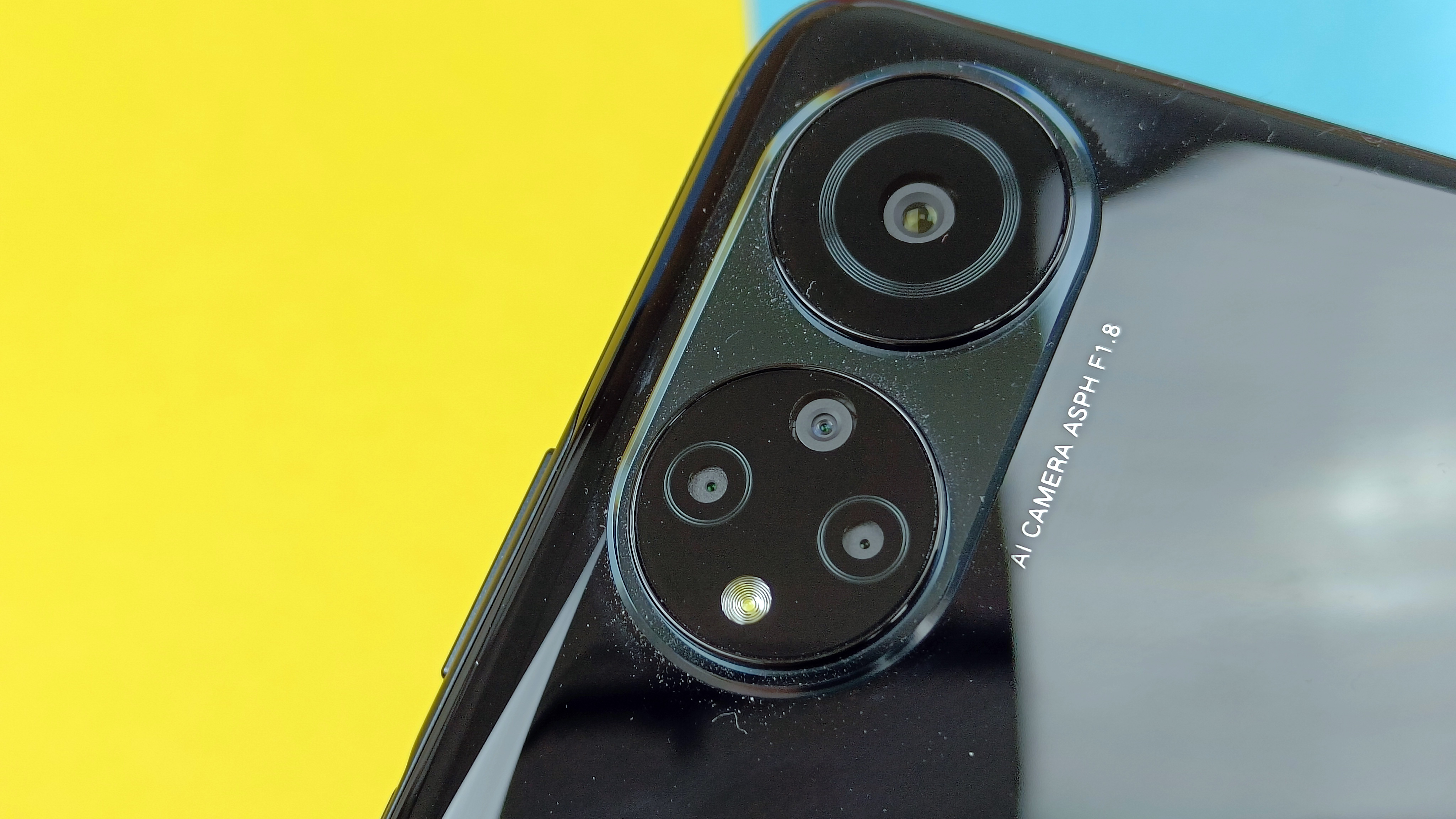 Die Rückseite besteht aus einer glänzenden Kunststoffplatte mit zu den Seiten deutlichen Rundungen. Dadurch liegt das Gerät trotz seiner recht ausladenden Größe noch recht gut in der Hand und vermittelt dank des hohen Gewichts sogar so etwas wie Wertigkeit. Selbst beim Draufklopfen klingt die Rückseite nicht übermäßig hohl, das haben wir schon bei deutlich teureren Modellen schlimmer gesehen. Allerdings zieht die Oberfläche Fingerabdrücke stark an. Die Kamera mit ihrer Ausformung in zwei nur leicht aus dem Gehäuse hervorstehenden, kreisförmigen Erhebungen sieht ebenfalls ordentlich aus, auch wenn die Kamera insgesamt mehr Schein als Sein ist – mehr dazu im Kapitel zur Kamera.