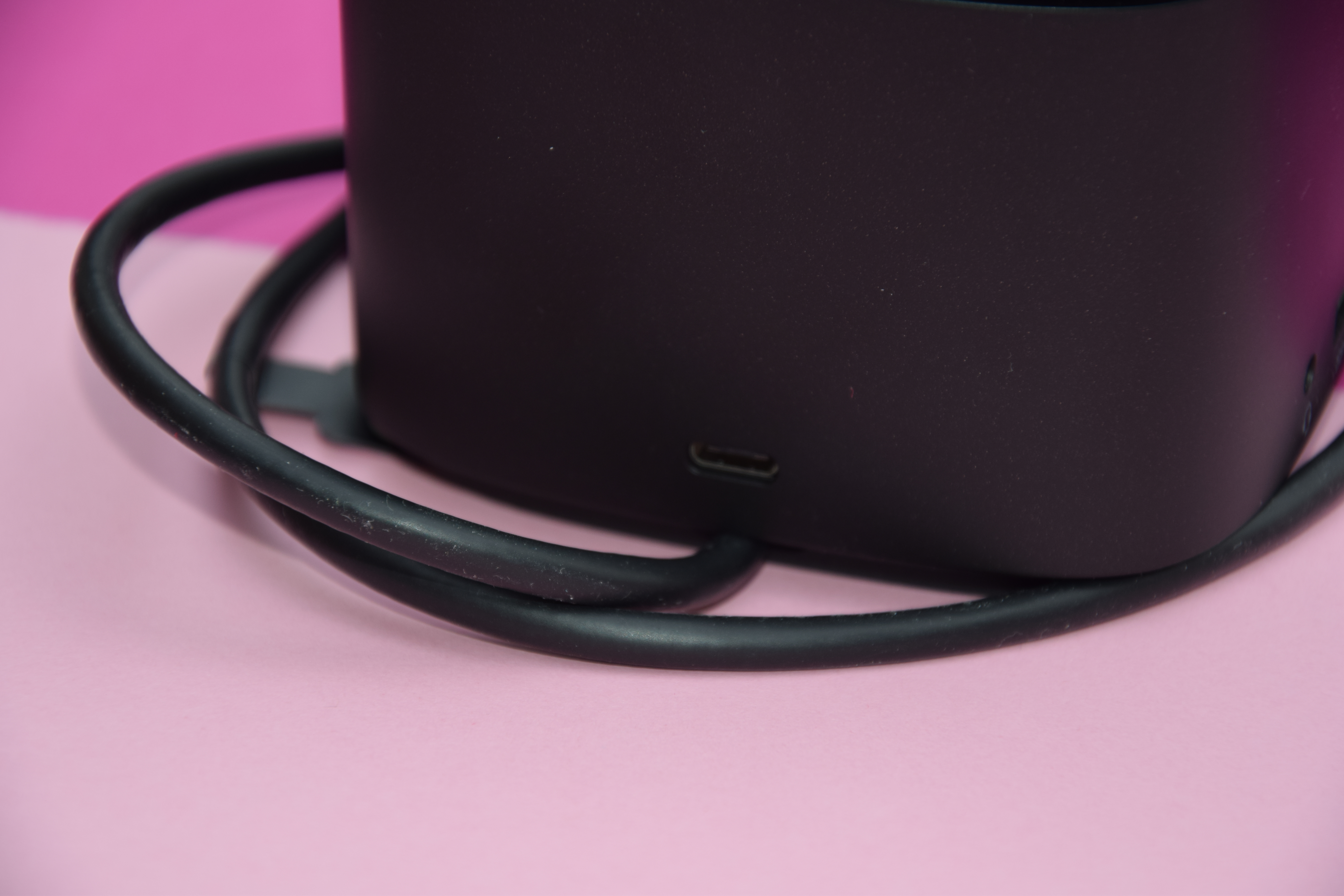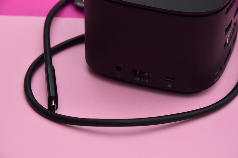 An der rechten Seite des HP-Docks ist ein weiterer USB 3.0-Port sowie ein kombinierter Mikrofon/Kopfhörer-Anschluss und ein Steckplatz für das Sicherheitsschloss Kensington Lock. Der Thunderbolt 3-Port sitzt an der Vorderseite des Turms direkt über dem integrierten 60 cm langen Thunderbolt-Kabel, mit dem der Laptop verbunden wird.
