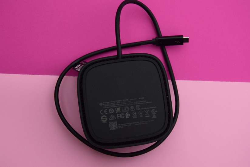 Das Thunderbolt-Dock von HP ist mit Maßen von 9,8 × 9,8 × 6,9 cm ungefähr so groß wie ein Notizzettelwürfel. Im Gegensatz zu anderen Herstellern verzichtet HP auf eine lange quaderförmige Bauweise und stapelt die Anschlüsse lieber übereinander. Heraus kommt eine turmförmige Dockingstation. Die schwarze Box ist schick und kompakt, bietet dennoch sehr viele Anschlüsse. Durch das Gewicht von knapp 800 g steht der Würfel stabil und sicher. Dabei hilft auch der Gummiring auf der Unterseite. Einziges Manko: Das mitgelieferte Netzteil ist klobig und bring nochmal etwas mehr als 650 g auf die Waage. Transportabel ist das Gerät daher eher nicht.